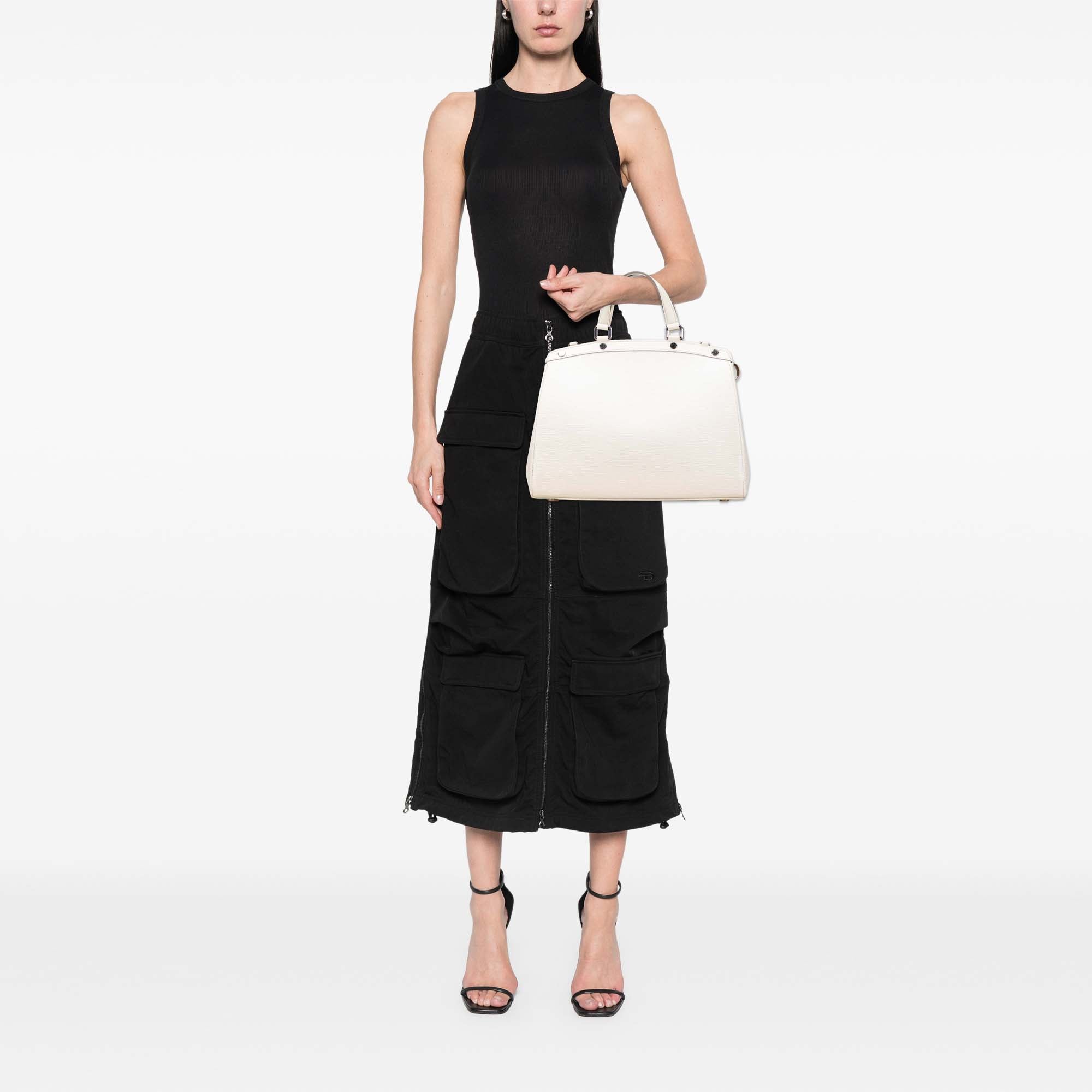 The Brea MM features an epi leather body, flat leather handles, a detachable and adjustable flat leather strap, a top zip closure, and interior zip and slip pockets. Retail Price: 2500.00