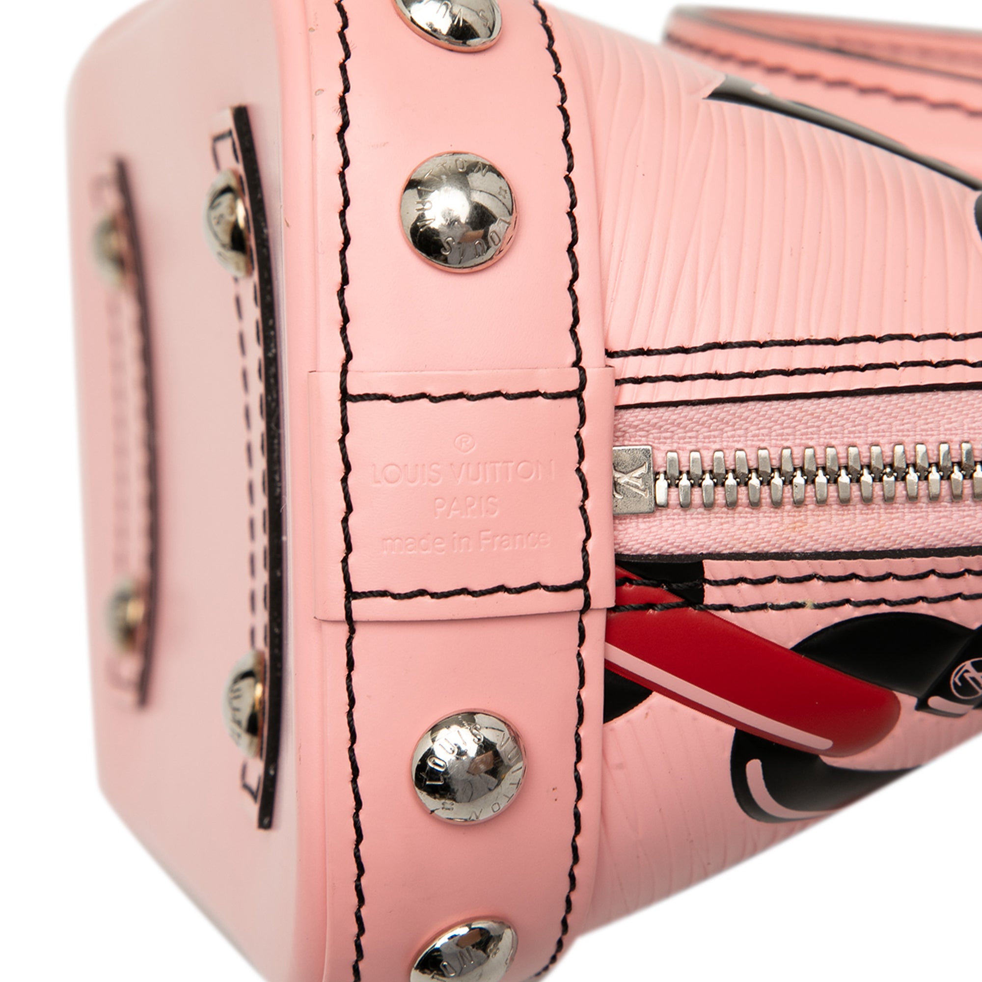 The Alma BB features an epi leather body, rolled leather handles, a detachable flat leather strap, a top zip around closure, a clochette, and an interior slip pocket. Retail Price: 2200.00