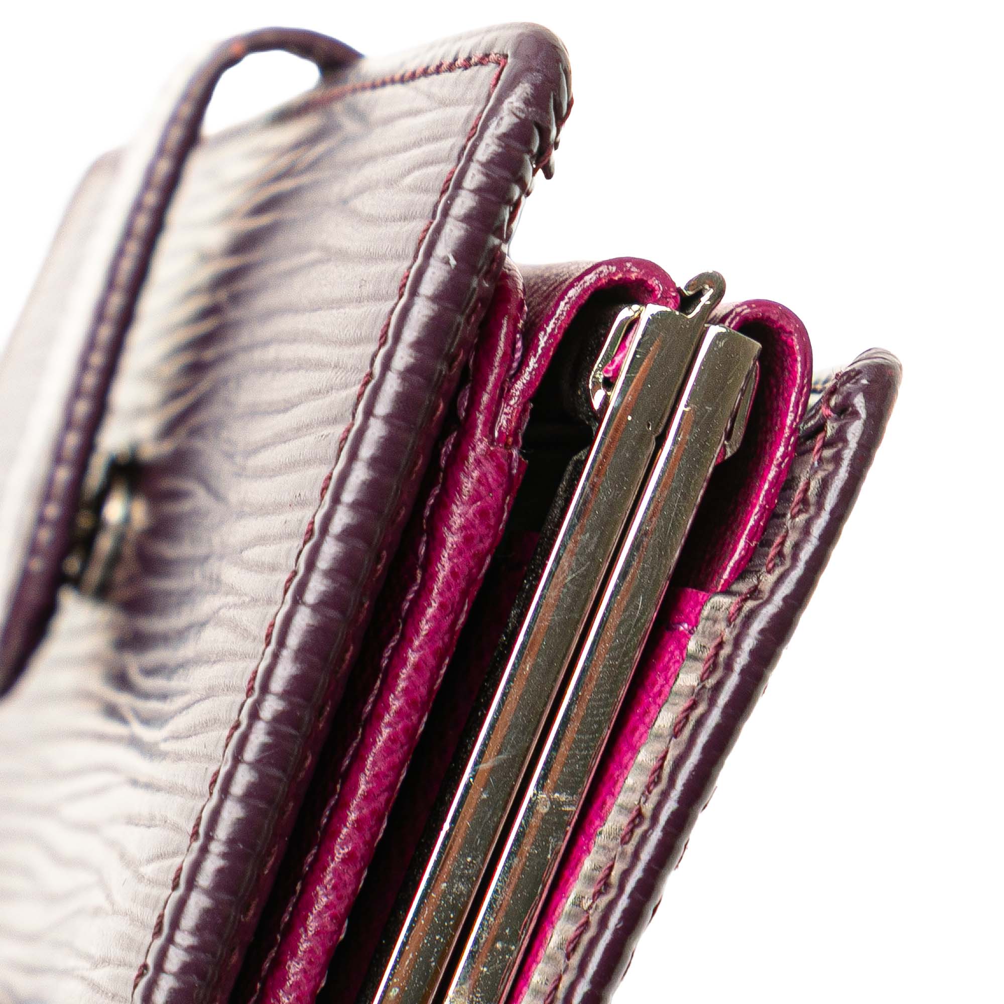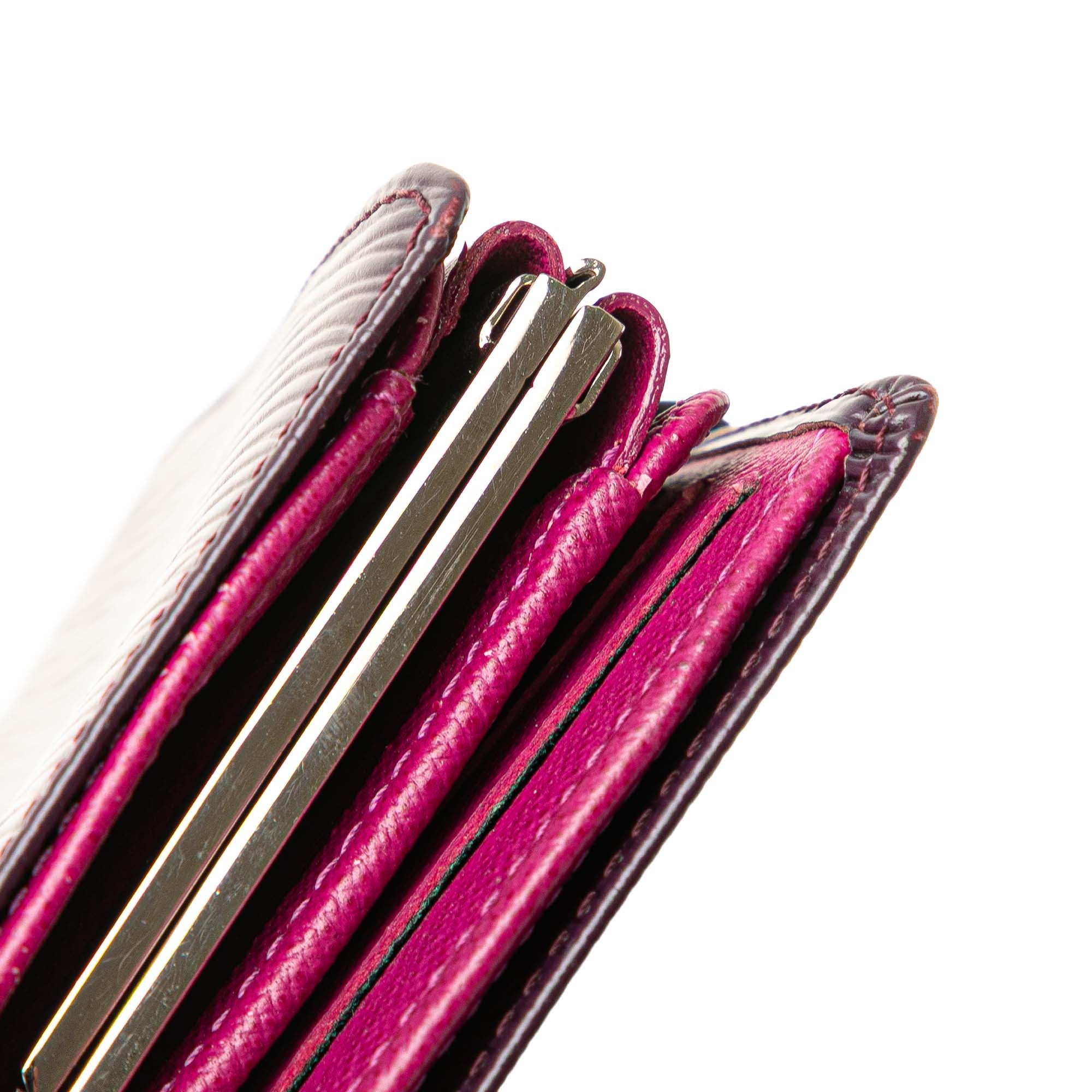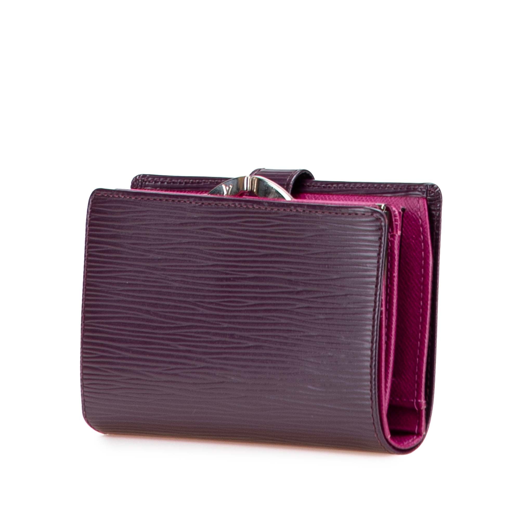 This wallet features an epi leather body, a top strap with a snap button closure, an exterior back compartment with a kiss lock closure, and interior slip pockets. Retail Price: 905.00