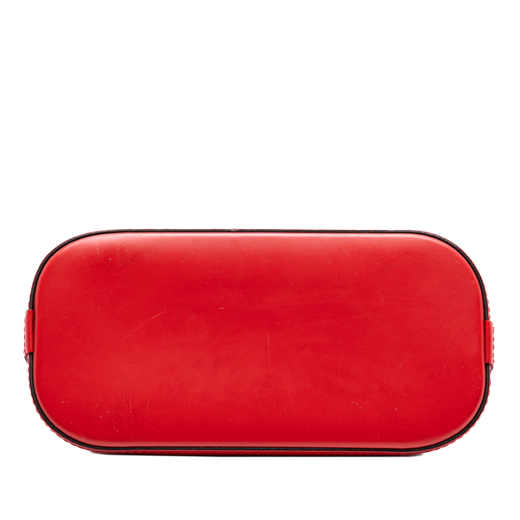 The Mini Alma features an epi leather body, a chain link and leather shoulder strap, a top zip closure, and an interior slip pocket. Retail Price: 1350.00