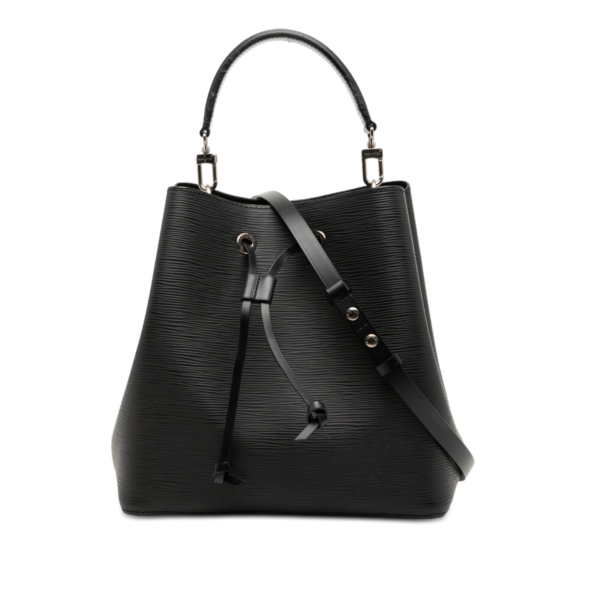The Neonoe MM features an epi leather body, a detachable flat leather handle, a detachable strap, a top drawstring closure, and an interior zip pocket. Retail Price: 2185.00