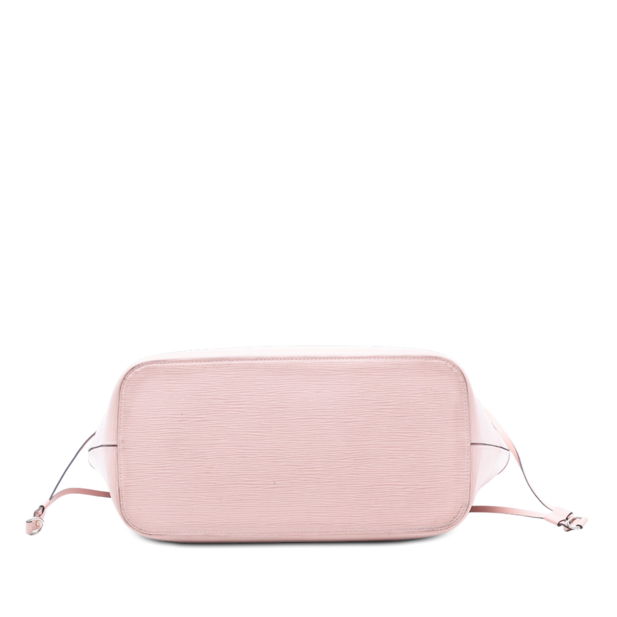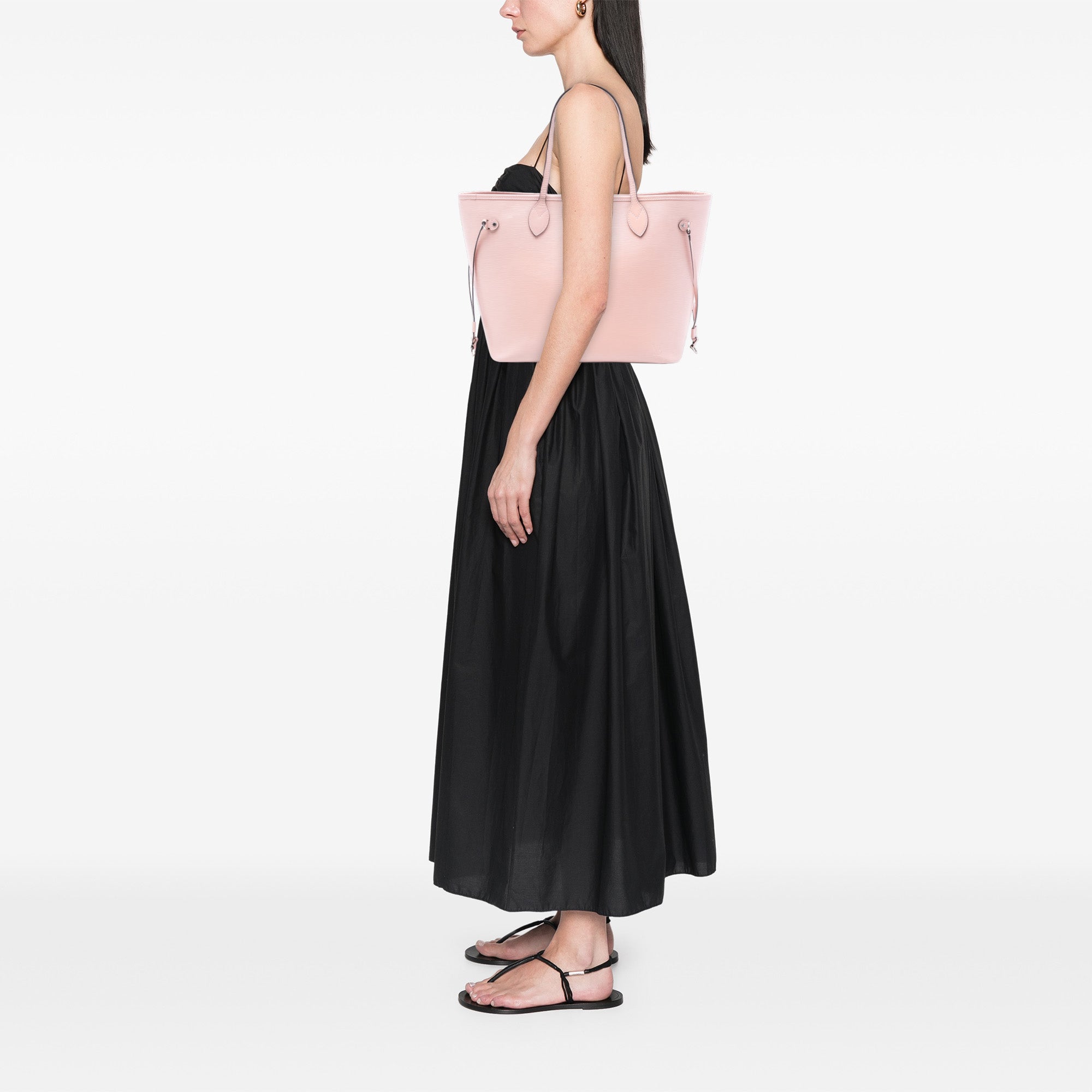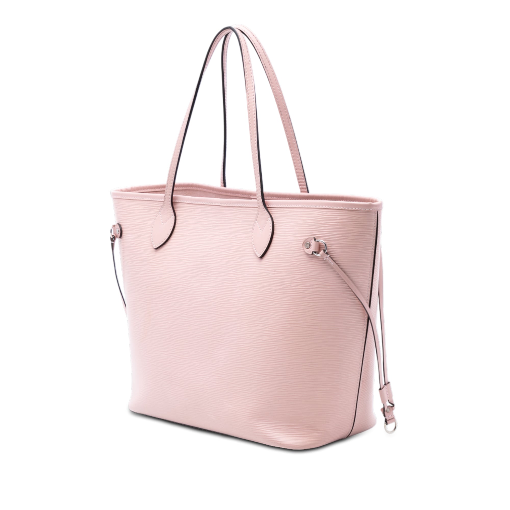 The Neverfull MM features an epi leather body, flat leather straps, an open top with lobster claw clasp closure, and side drawstrings. Retail Price: 2450.00