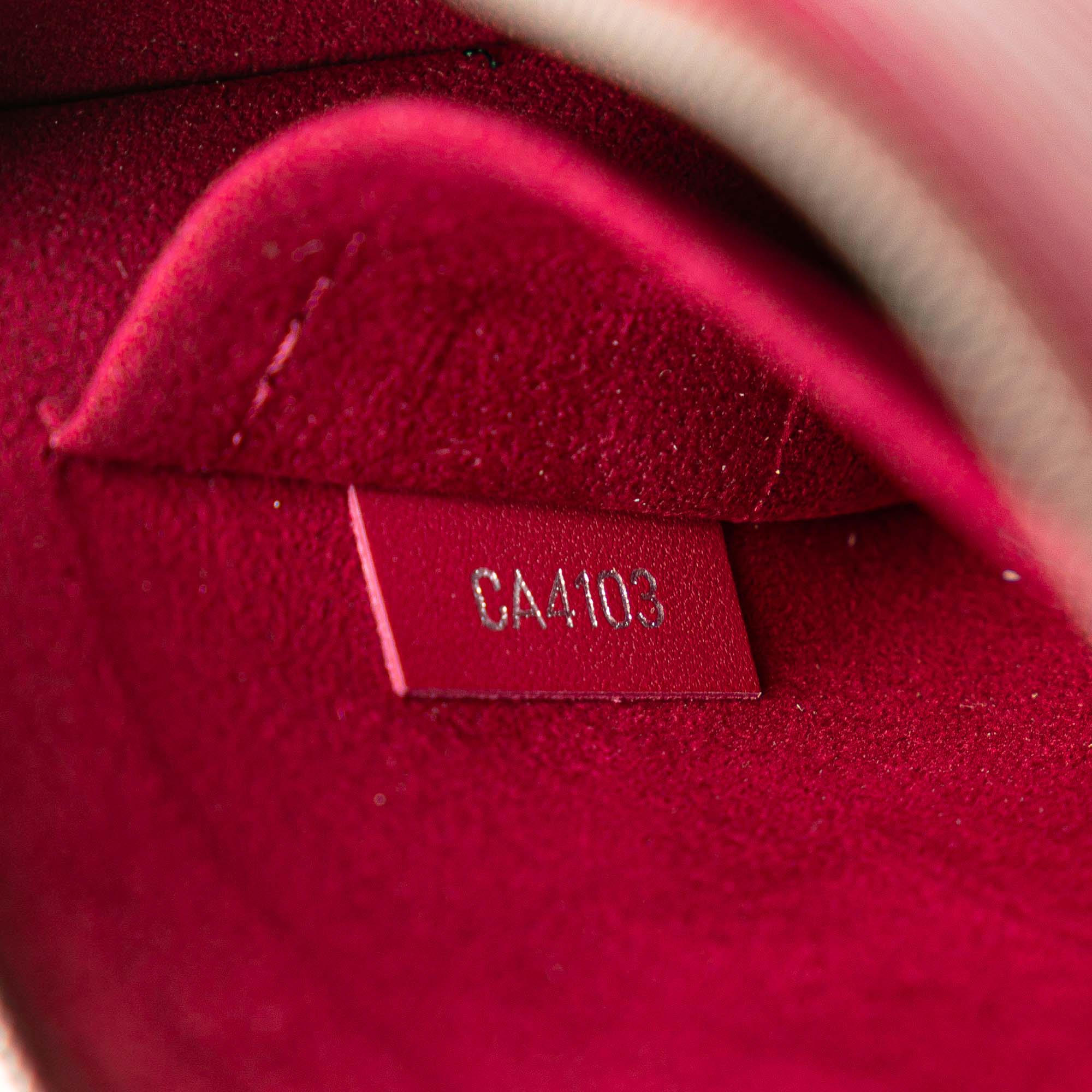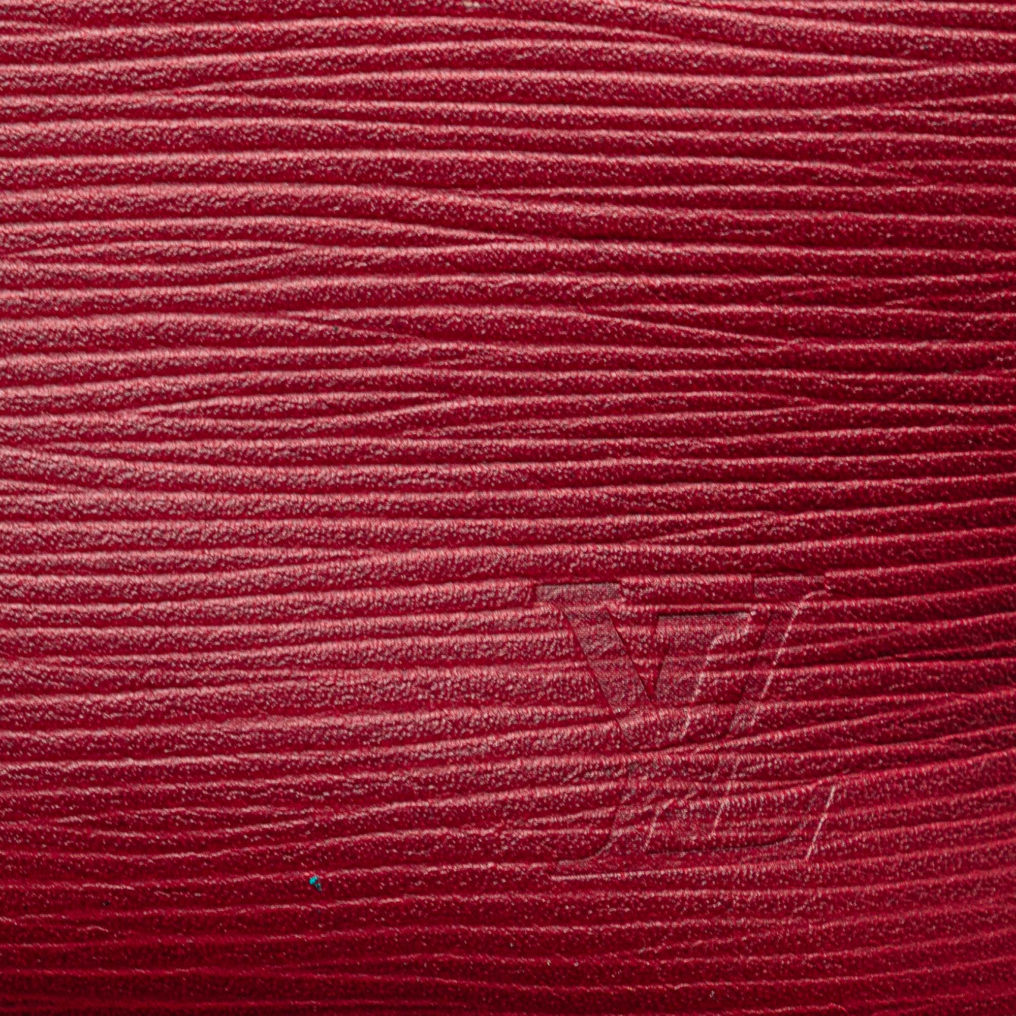 The Neverfull PM features an epi leather body, flat leather handles, an open top with a lobster clasp closure, an interior zip pocket and a zip pouch inclusion. Retail Price: 2570.00