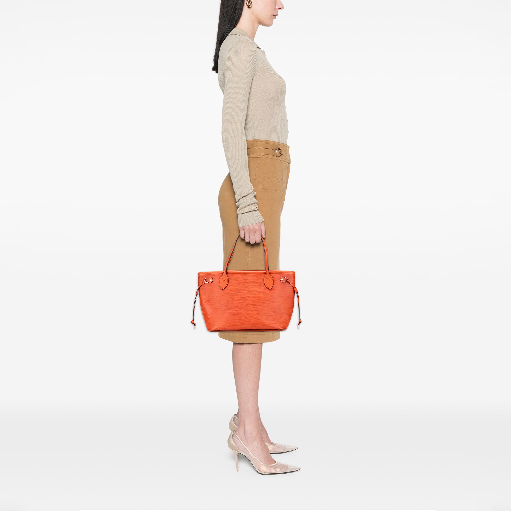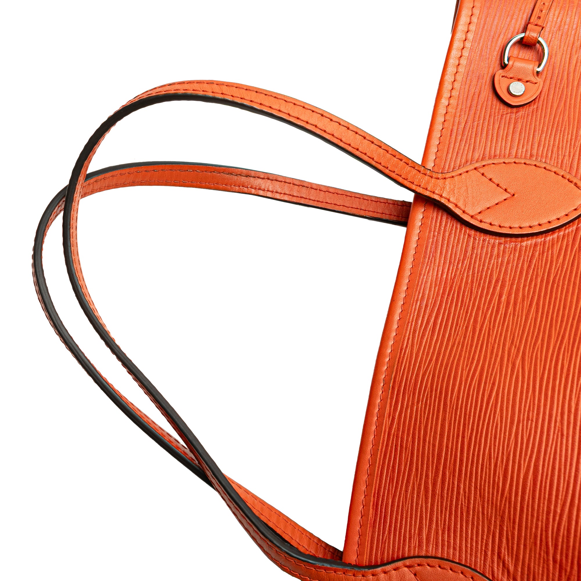 The Neverfull PM features an epi leather body, flat leather handles and an open top with a lobster clasp closure. Retail Price: 2570.00