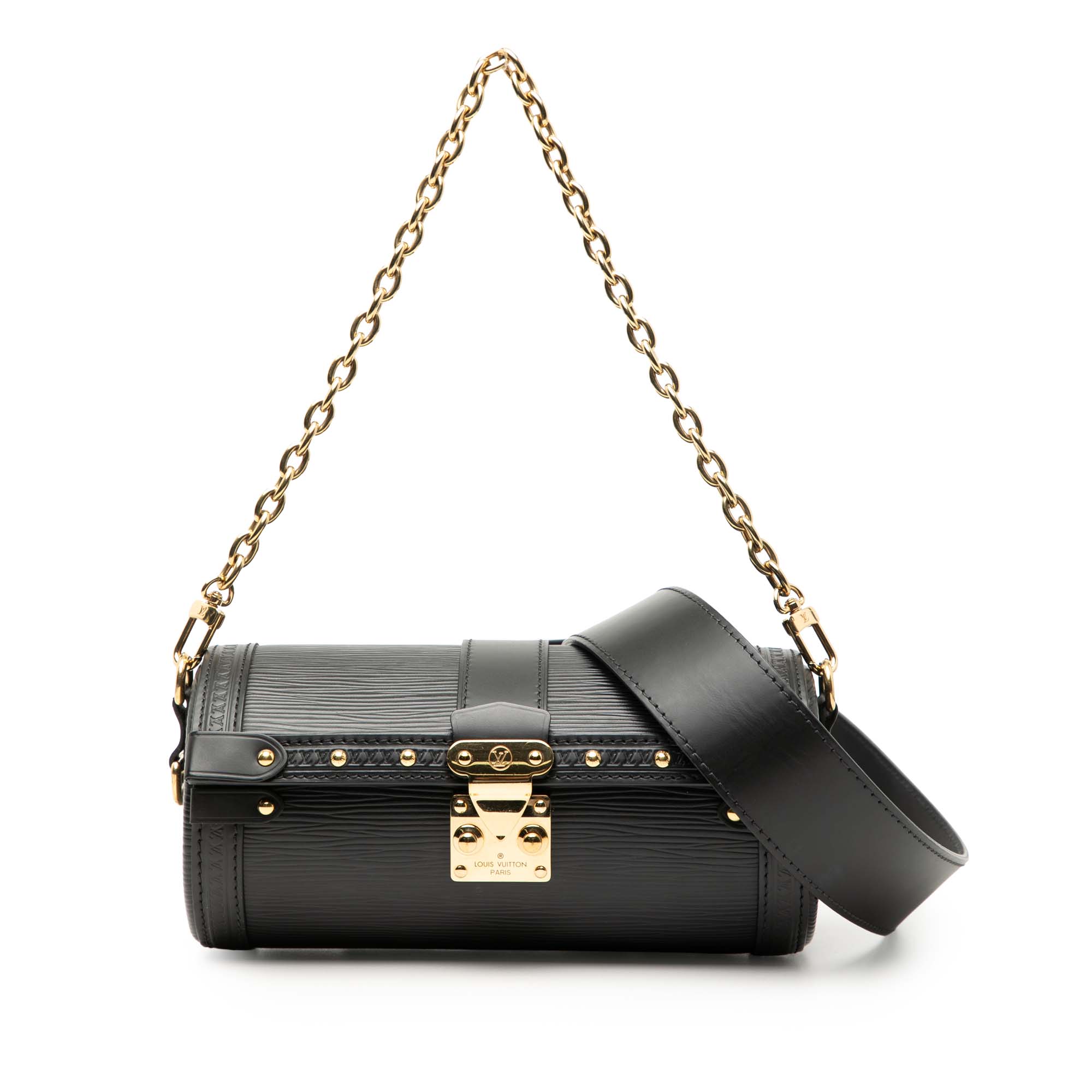 The Papillon Trunk features an epi leather body, a detachable gold-tone chain handle, a detachable flat leather strap, and a top flap with S-lock closure. Retail Price: 2630.00