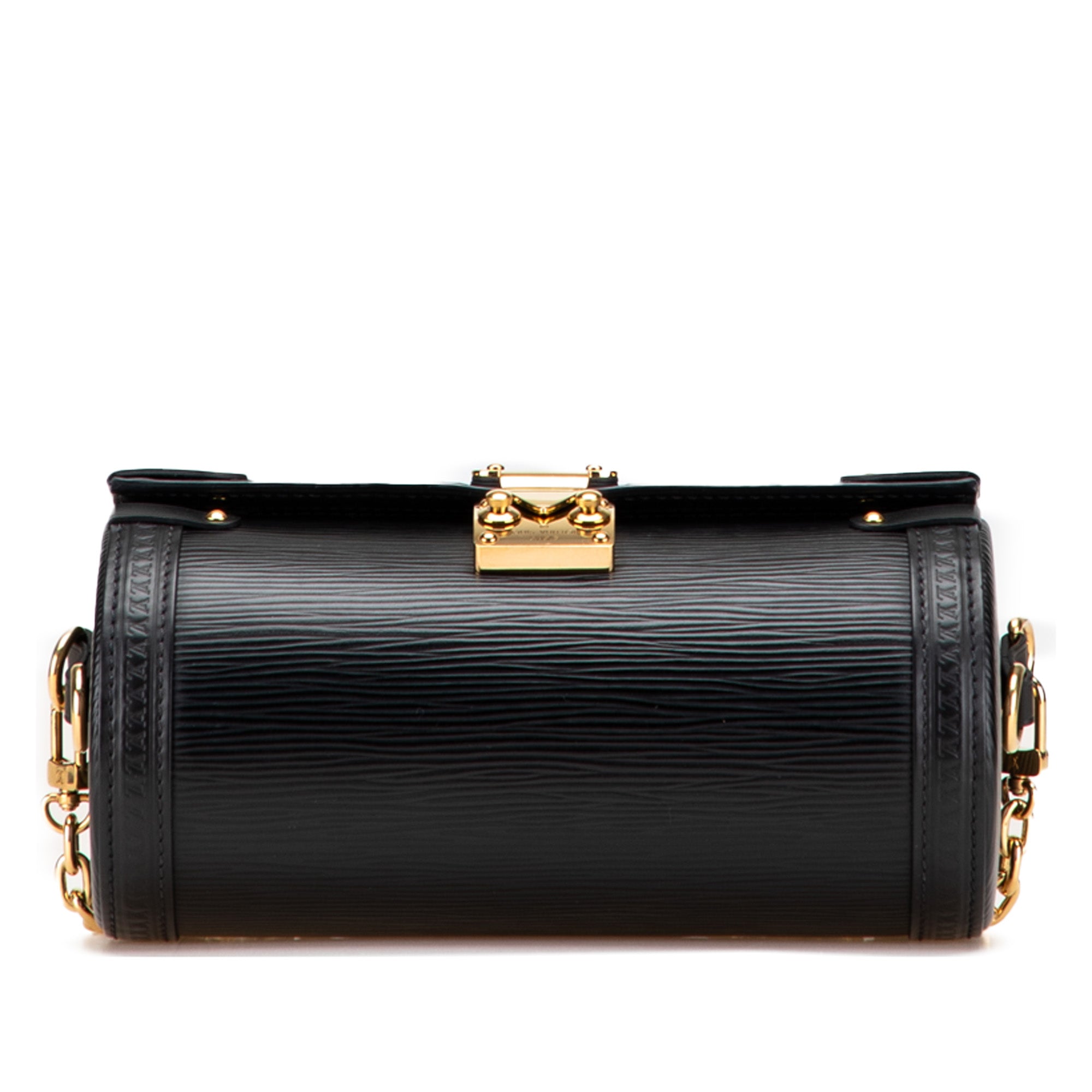 The Papillon Trunk features an epi leather body, a detachable gold-tone curb chain link handle, a detachable and adjustable flat leather shoulder strap, and a top flap with S-lock closure. Retail Price: 2630.00