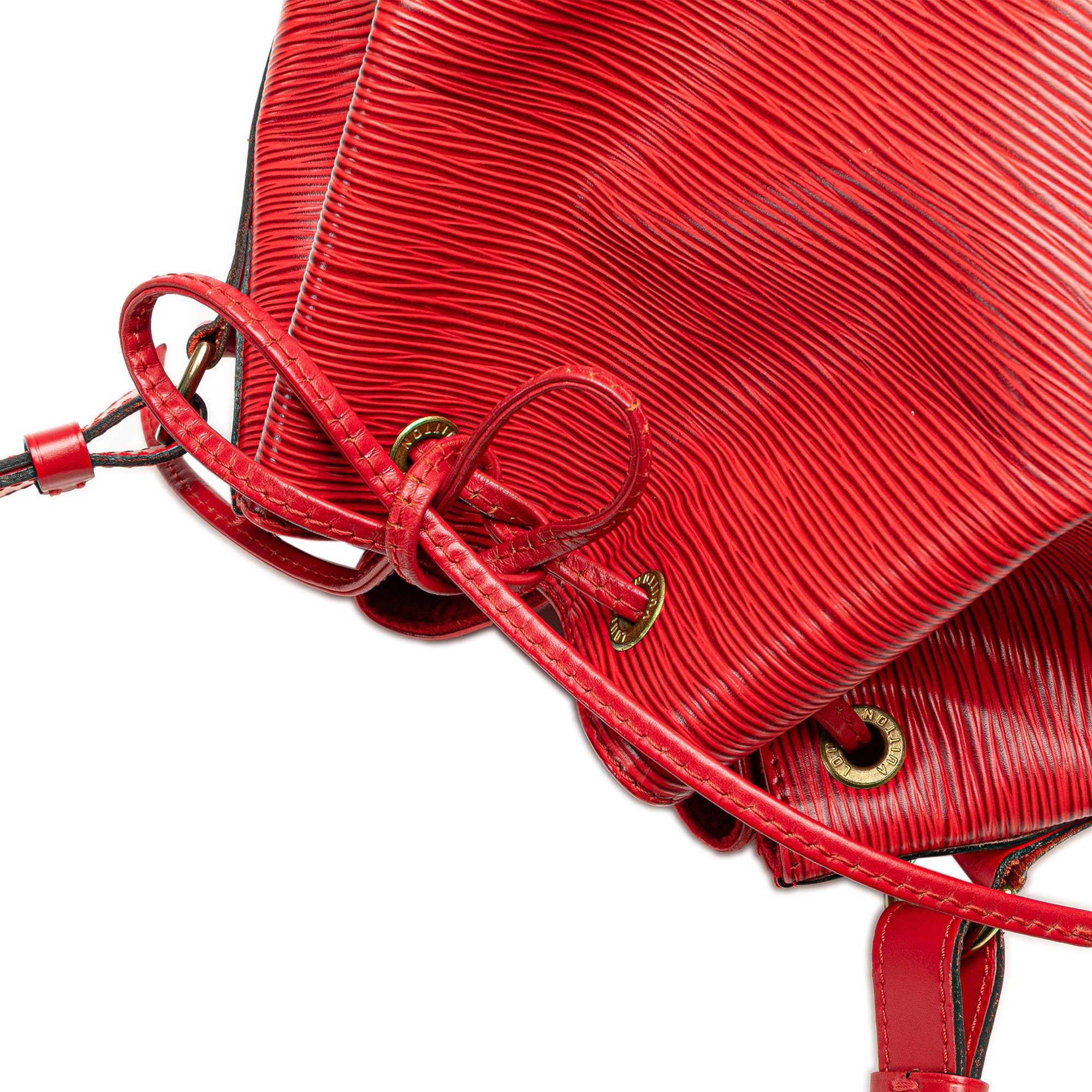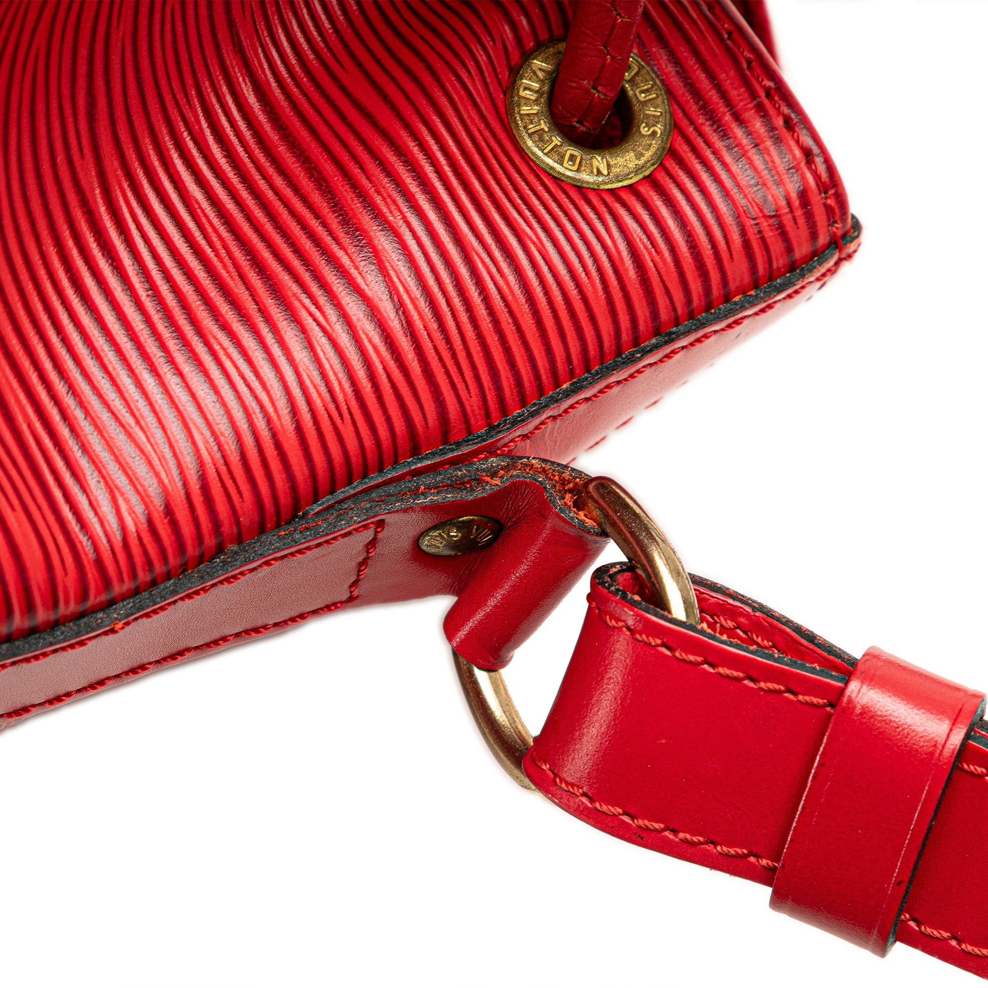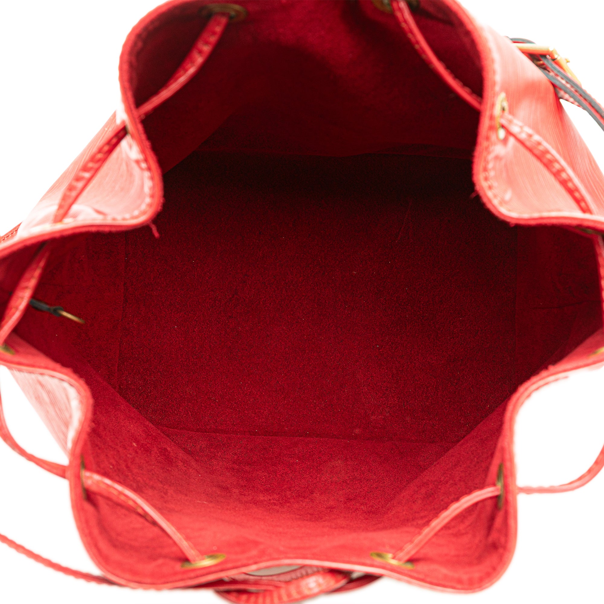 The Petit Noe features an epi leather body, flat leather shoulder straps, and a drawstring closure. Retail Price: 1523.00
