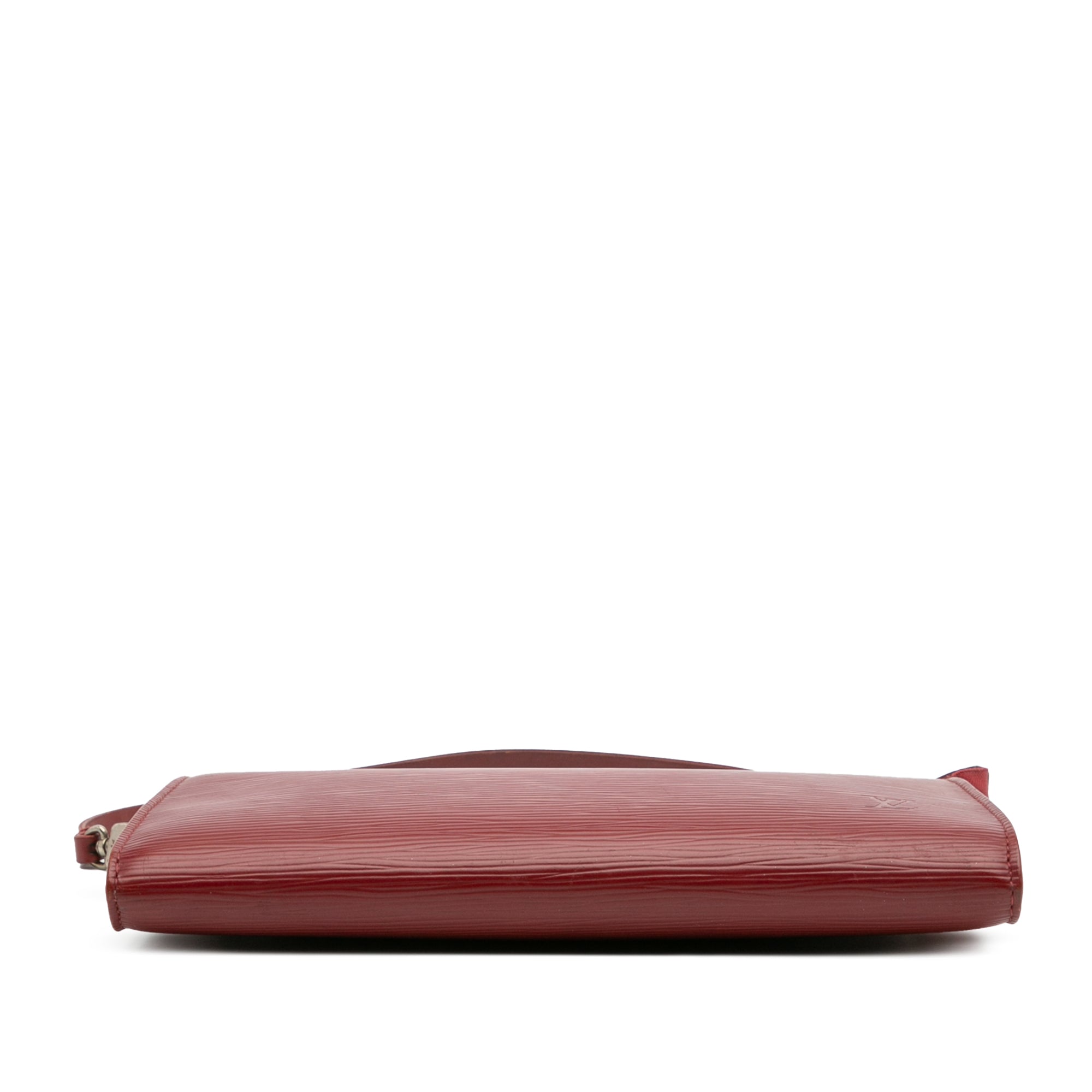 The Pochette Accessoires features an epi leather body, a flat leather shoulder strap, and a top zip closure. Retail Price: 990.00