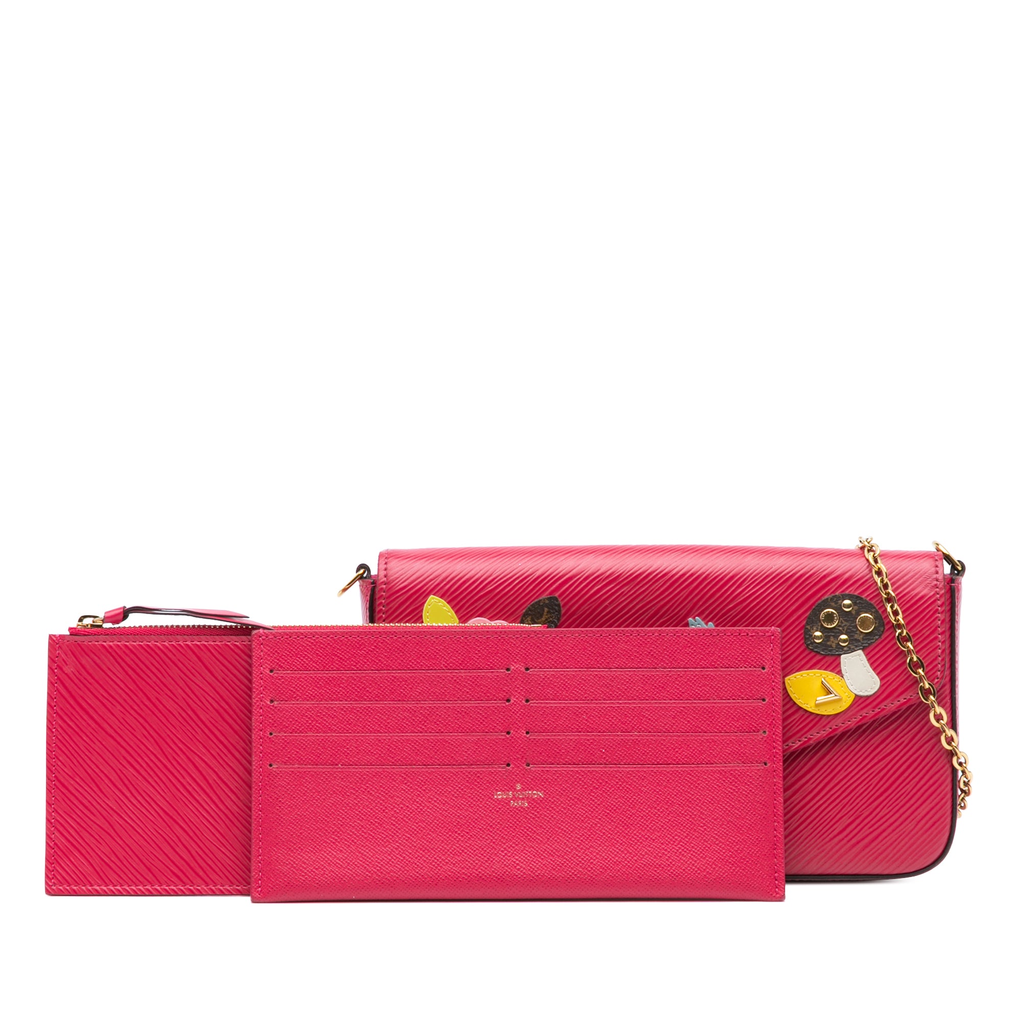 The Pochette Felicie features an epi leather body with patch details, a detachable chain link strap, a front flap with a snap button closure, and a compartment with detachable card slots and zip pouch. Retail Price: 1785.00