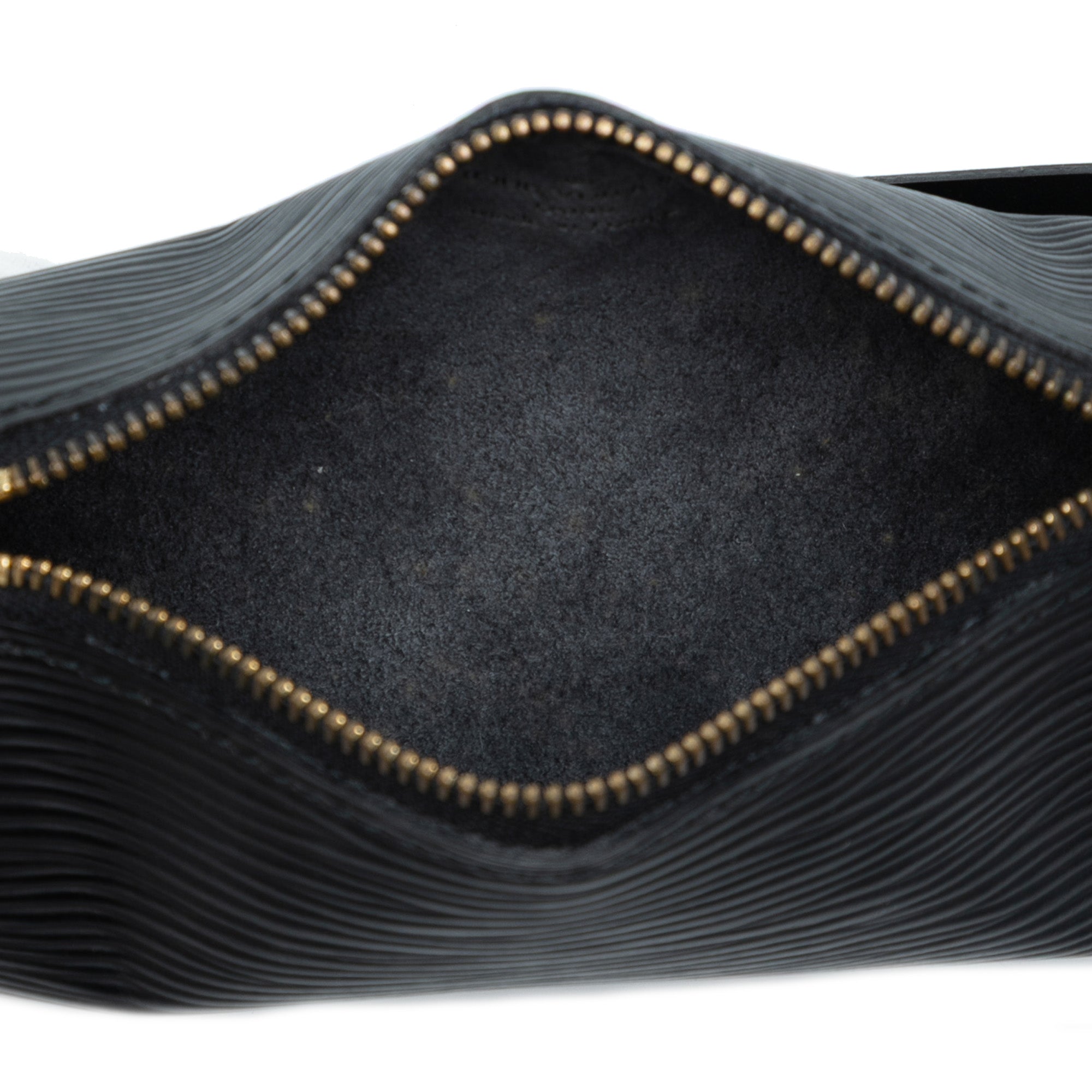 The Pochette Papillon features an epi leather body, a flat leather strap, and a top zip closure. Retail Price: 500.00