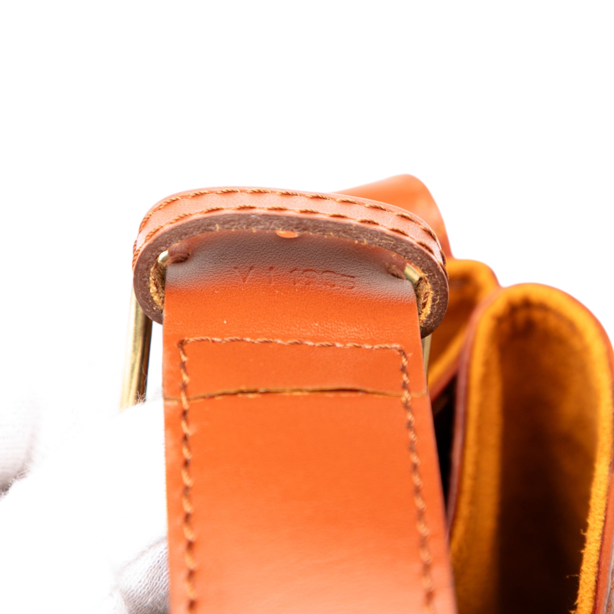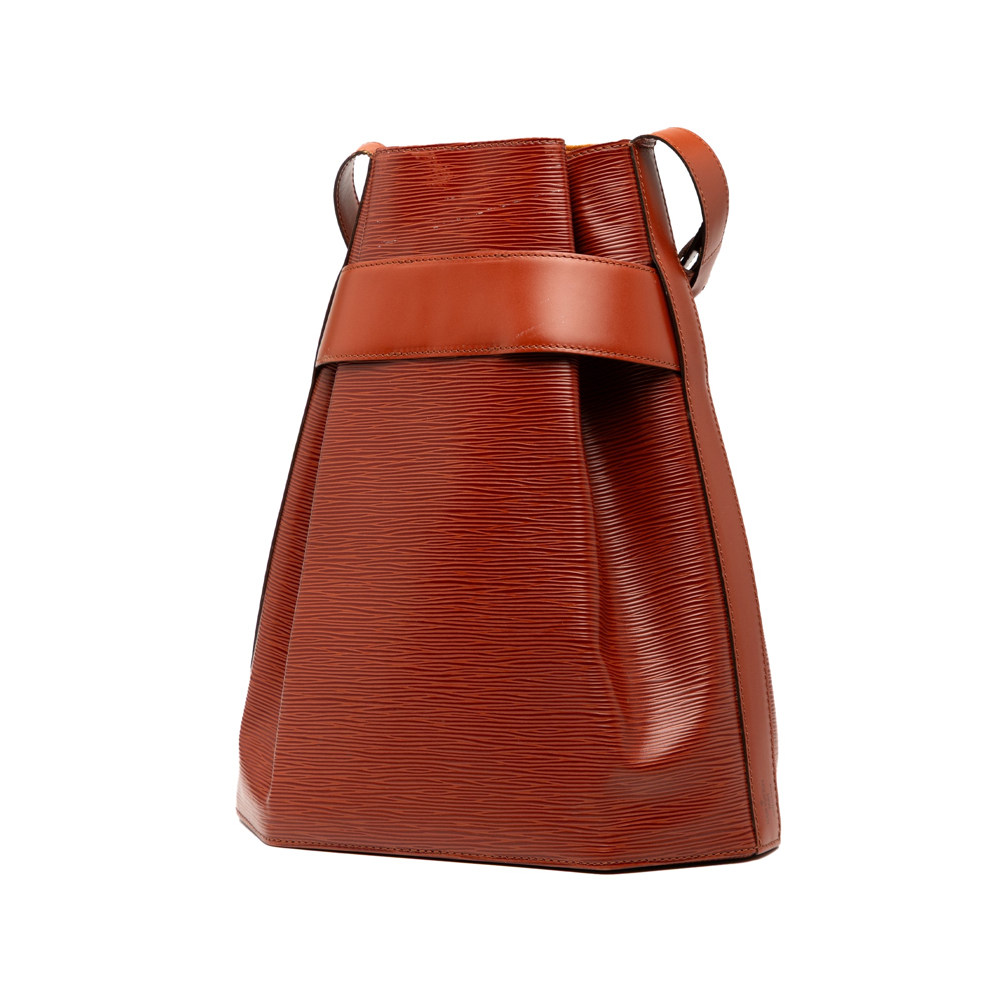 The Sac D'Epaule features an epi leather body, an adjustable shoulder strap, and an open top with a magnetic belt closure. Retail Price: 1650.00