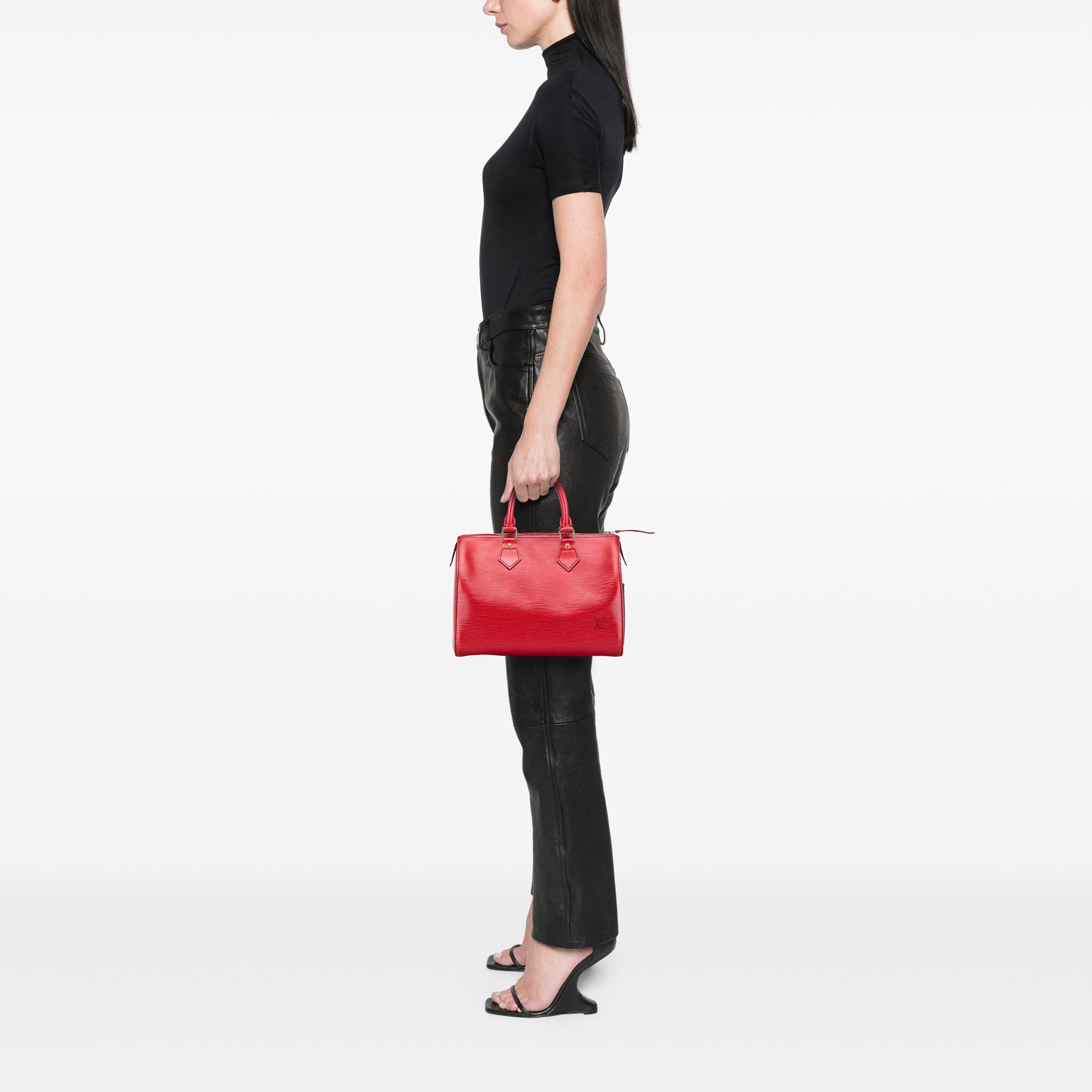 The Speedy 25 features an epi leather body, rolled handles, a top zip closure, an exterior side slip pocket, and an interior slip pocket. Inclusion: Dust bag. Retail Price: 1250.00
