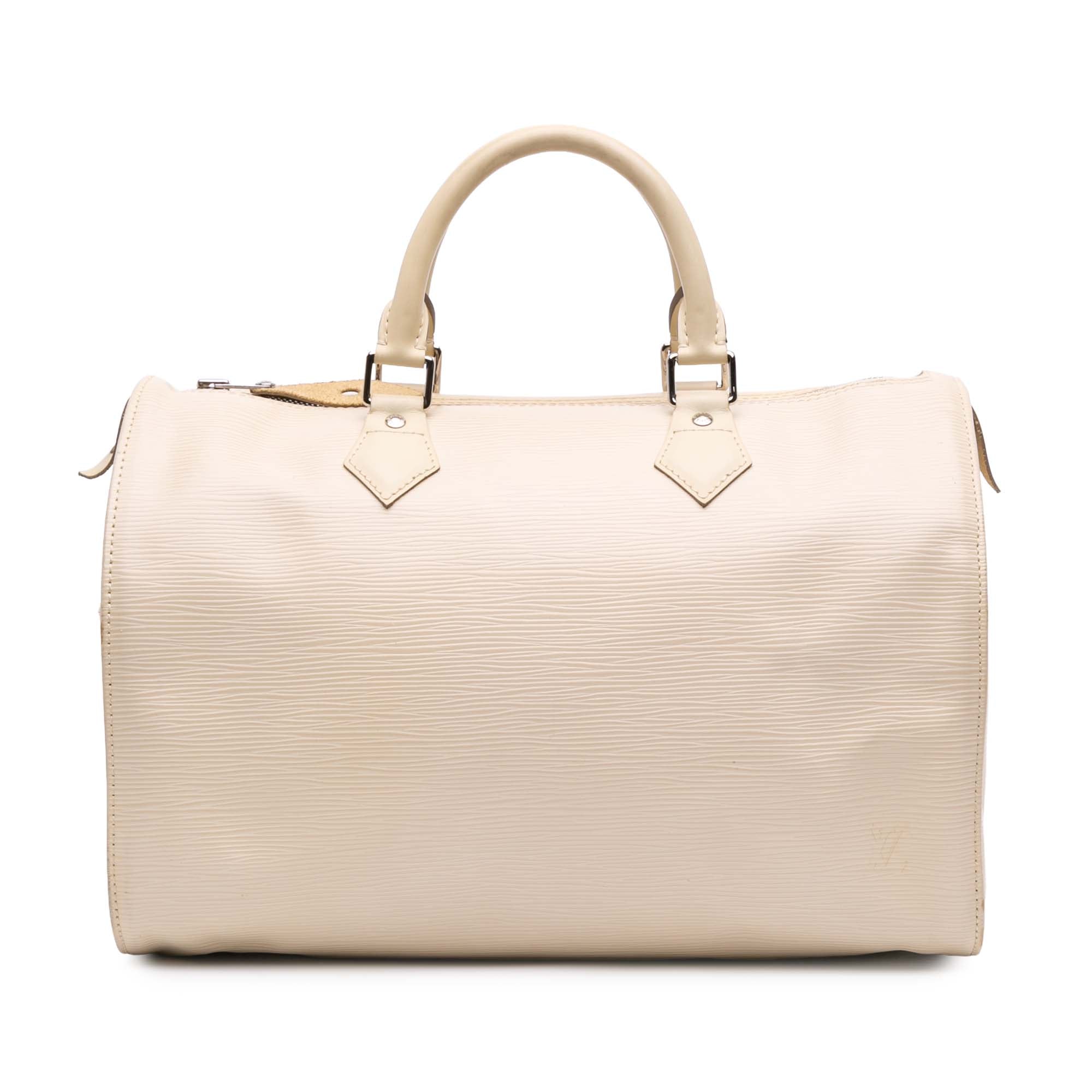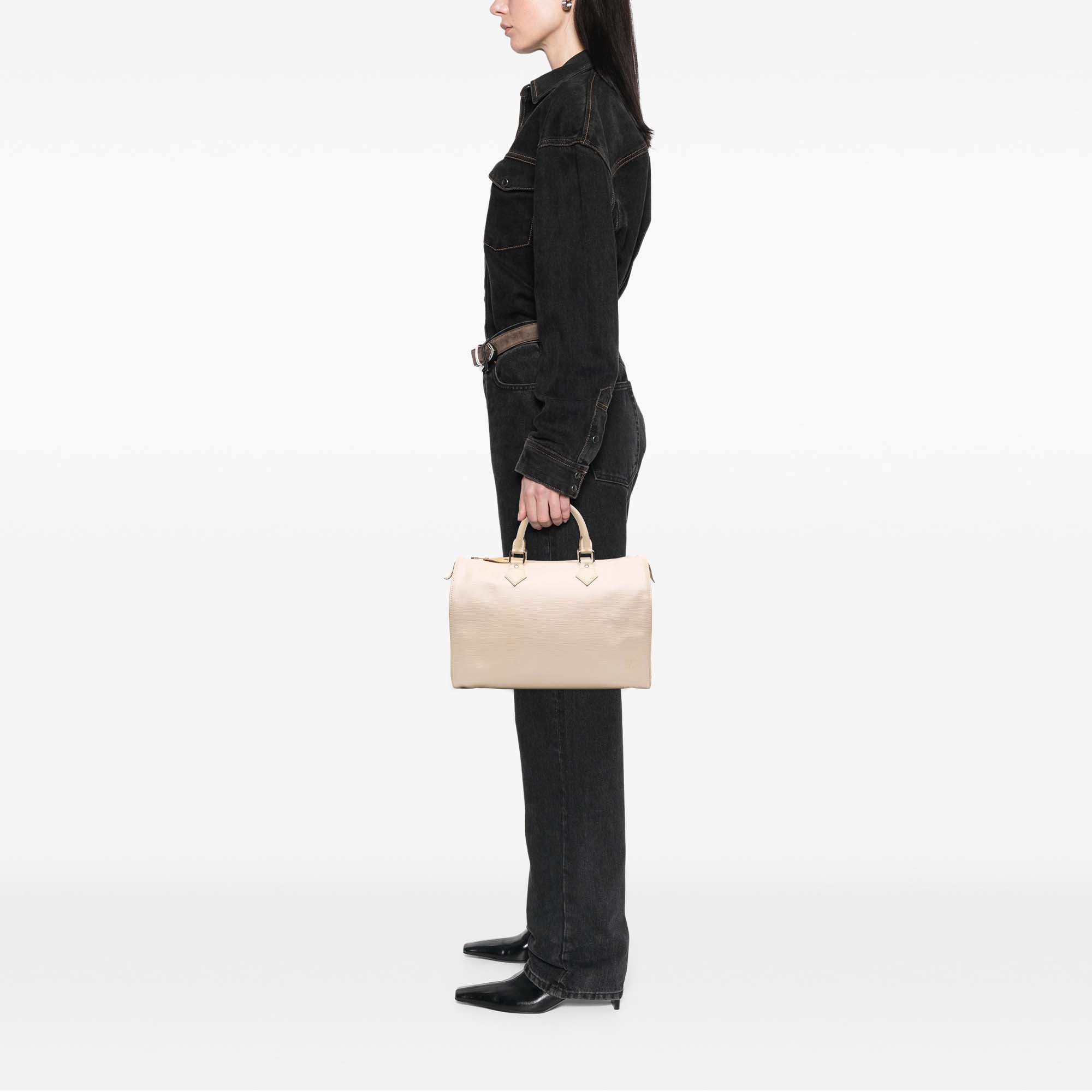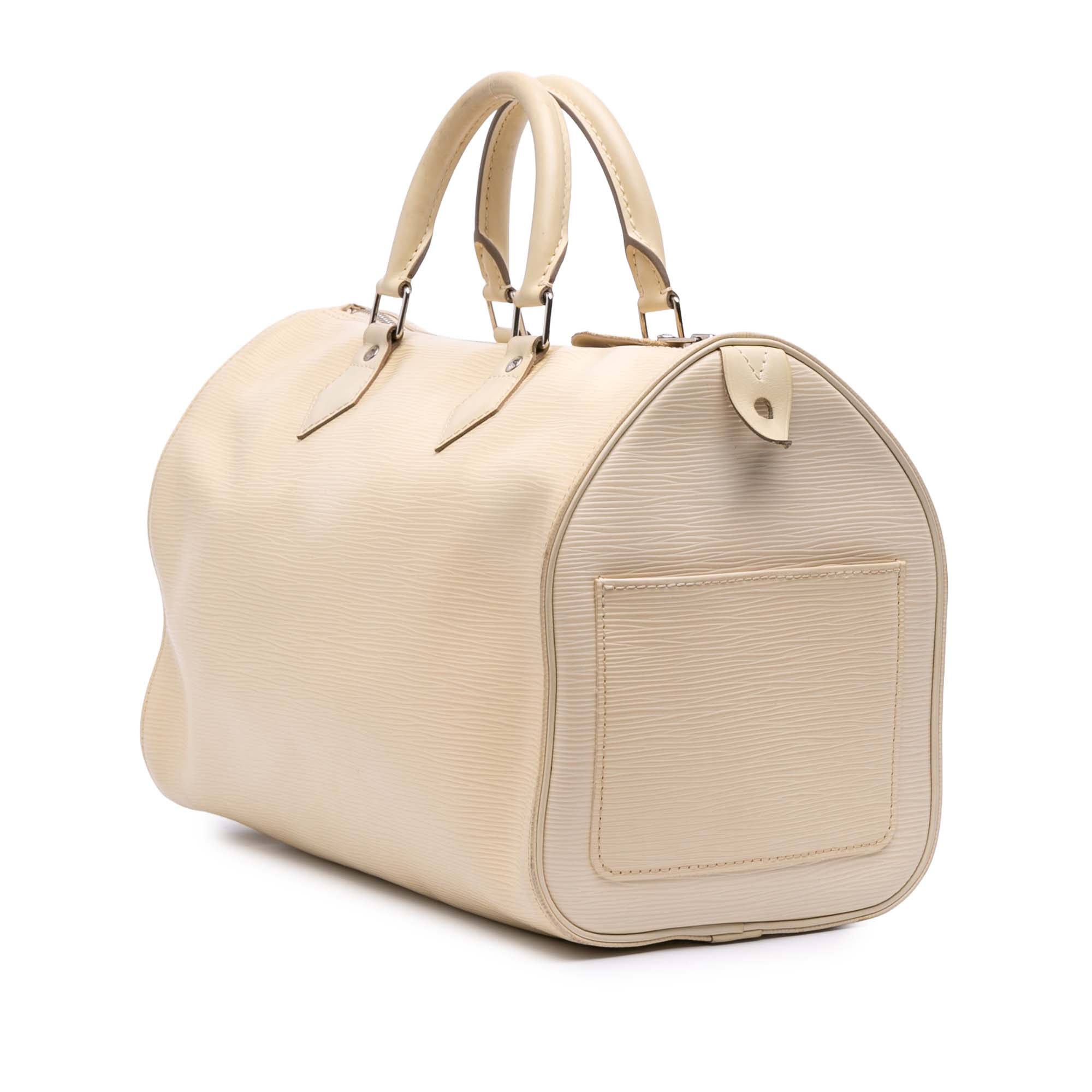 The Speedy 35 features an epi leather body, rolled handles, a top zip closure, an exterior side slip pocket, and interior slip pockets. Retail Price: 1360.00
