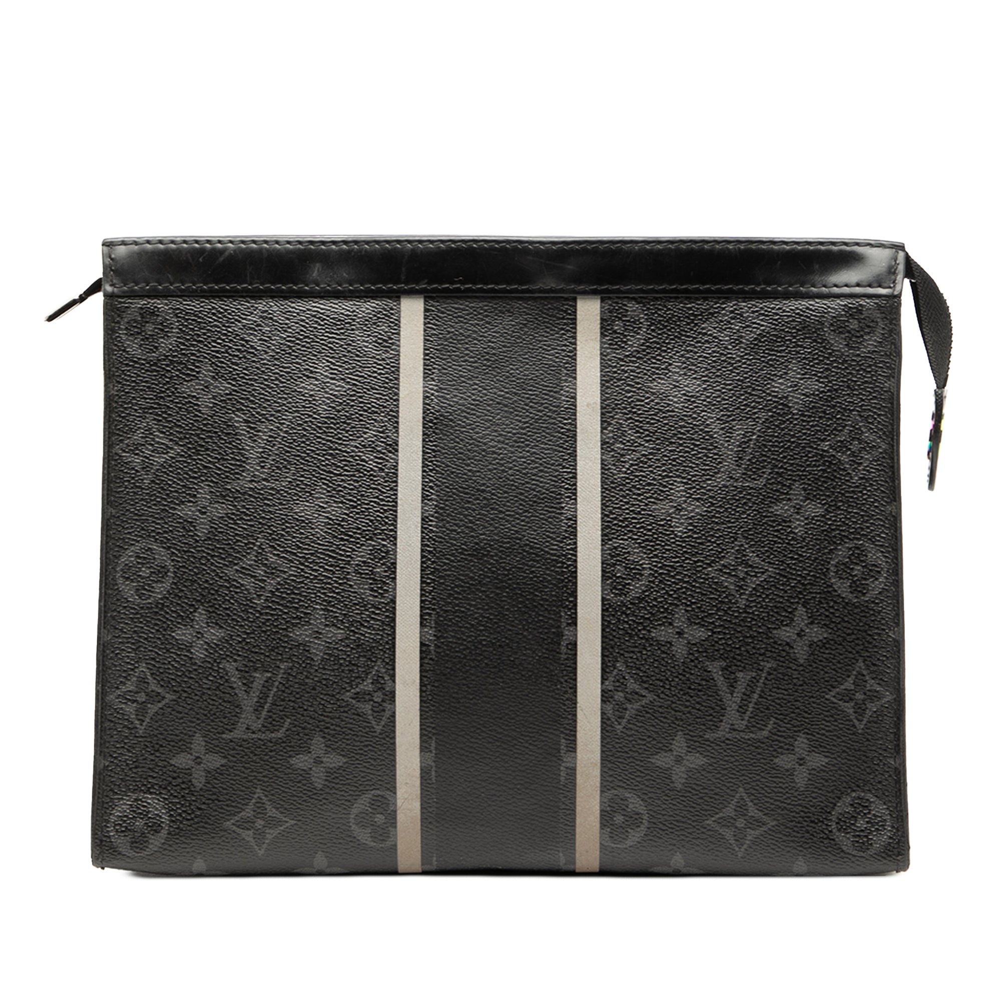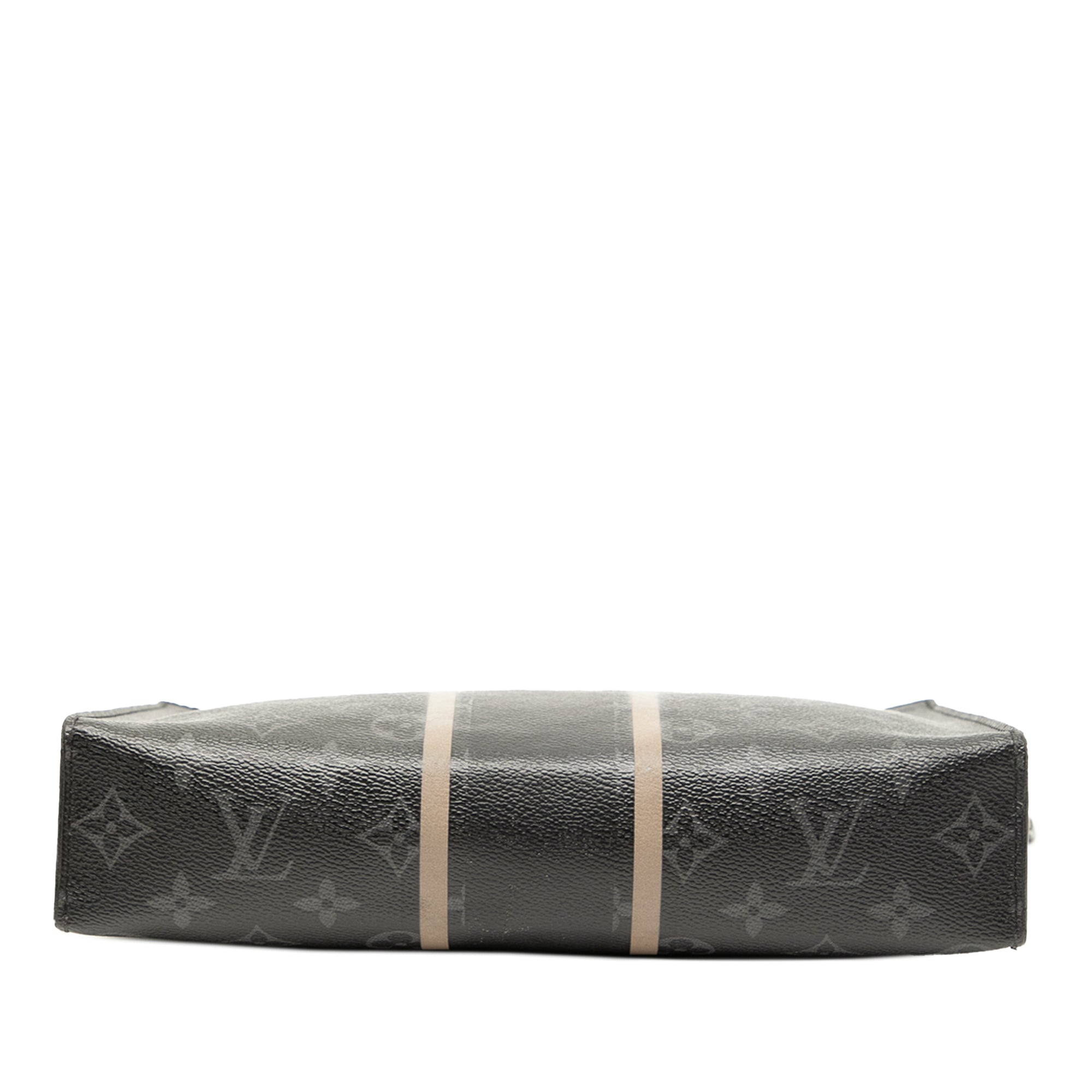 This clutch bag features a monogram eclipse canvas with leather trim and stripes detail, a top zip closure, and interior slip pocket and card slots. Retail Price: 1150.00