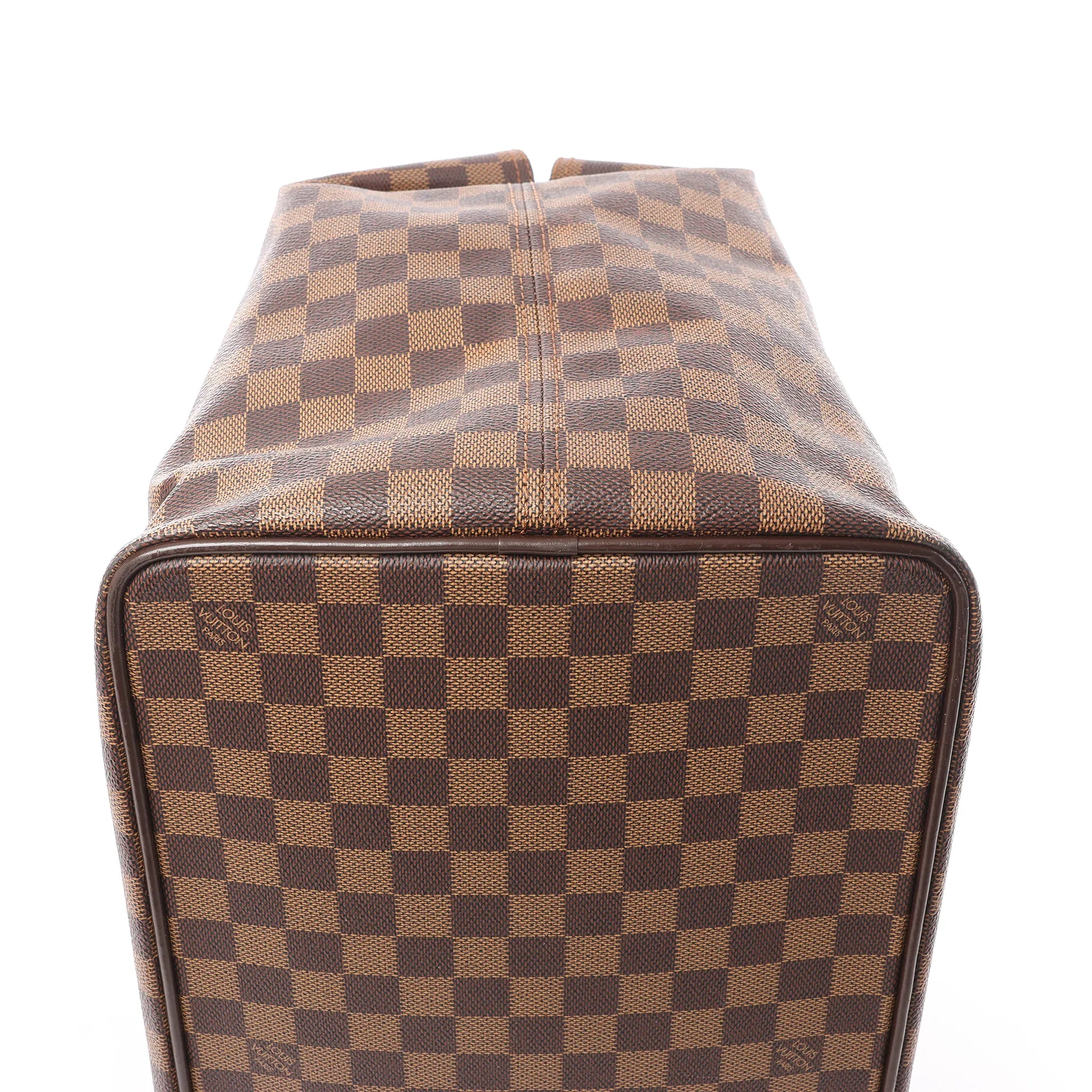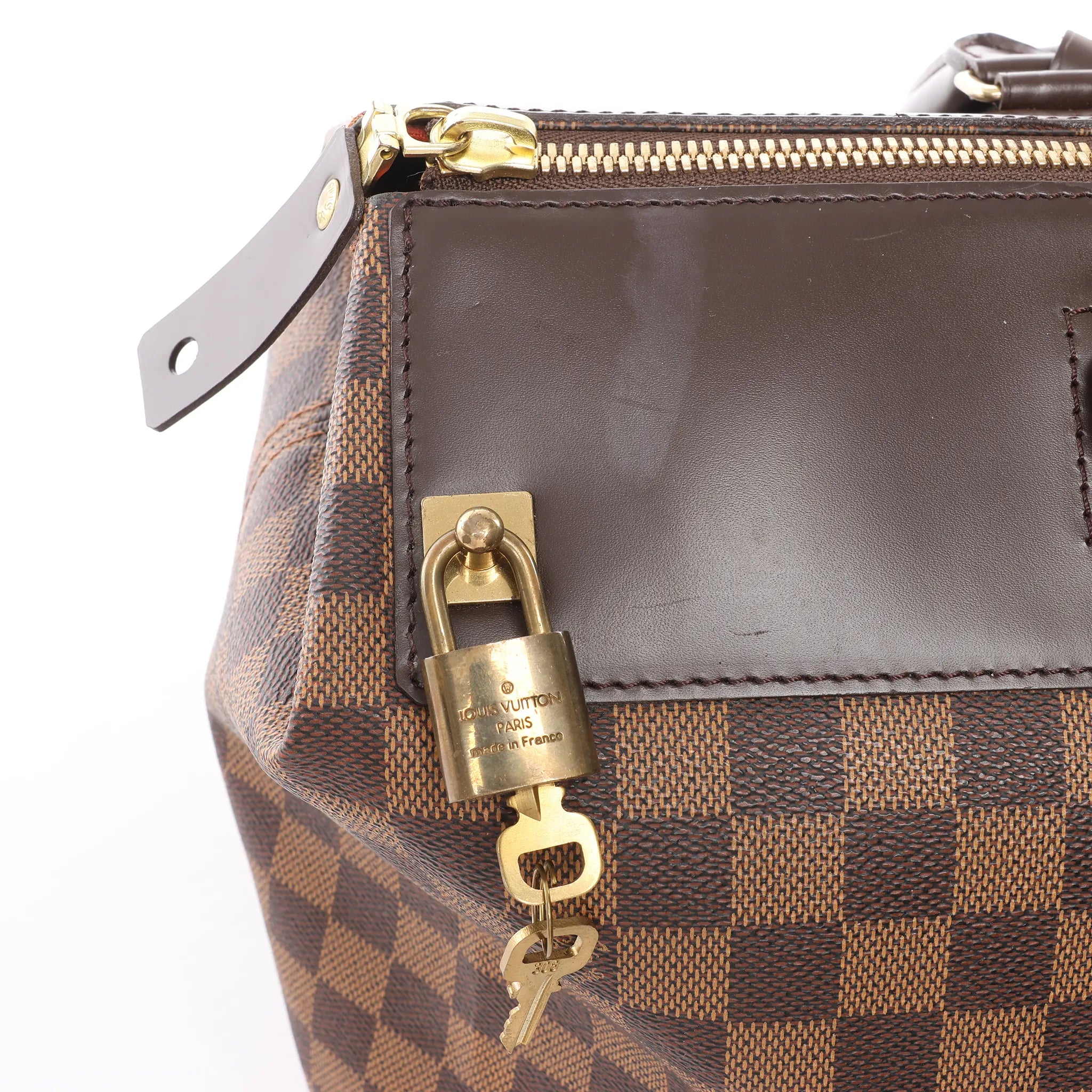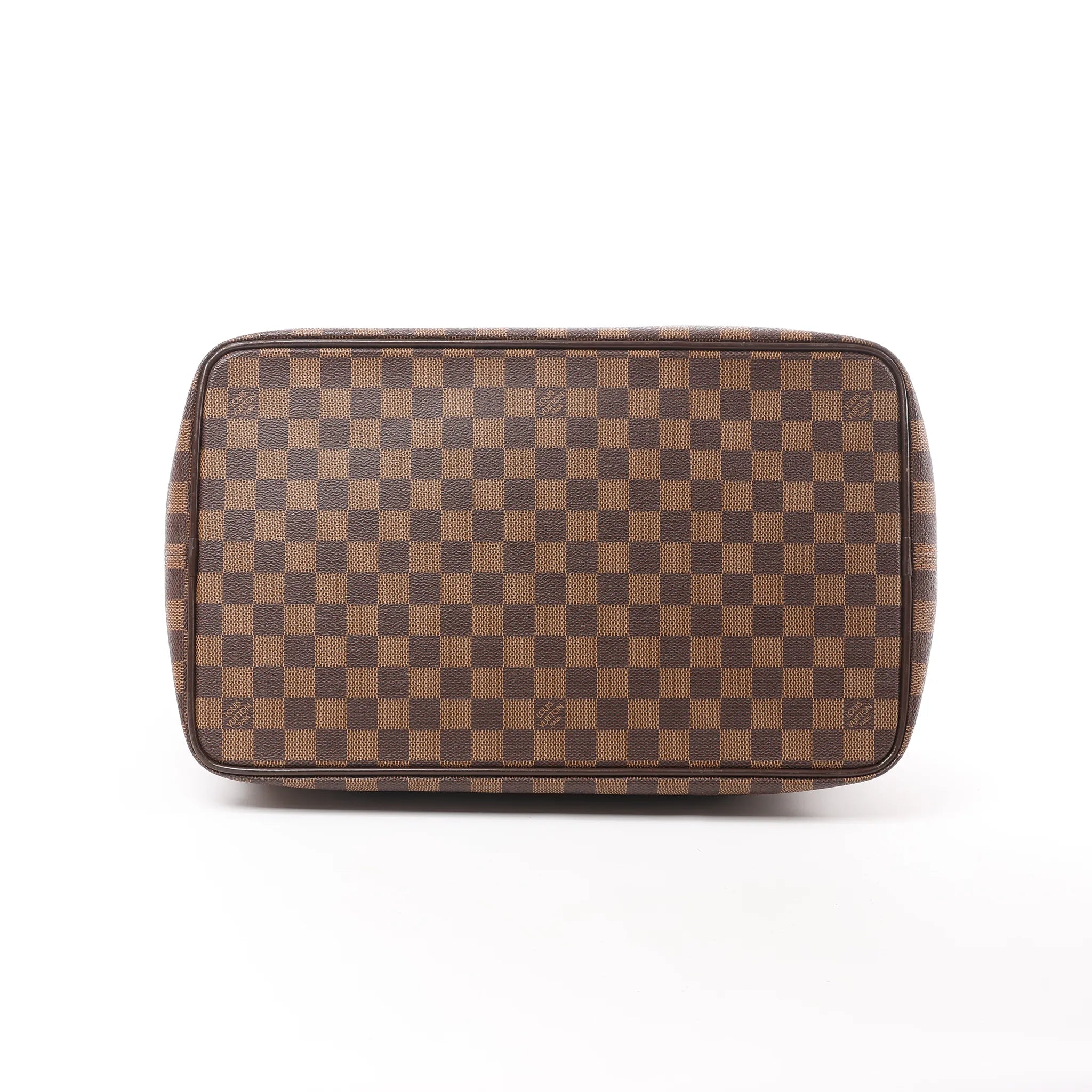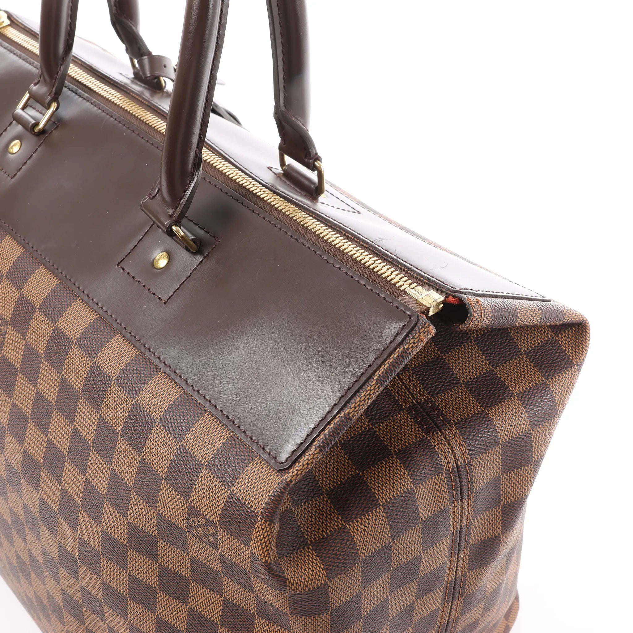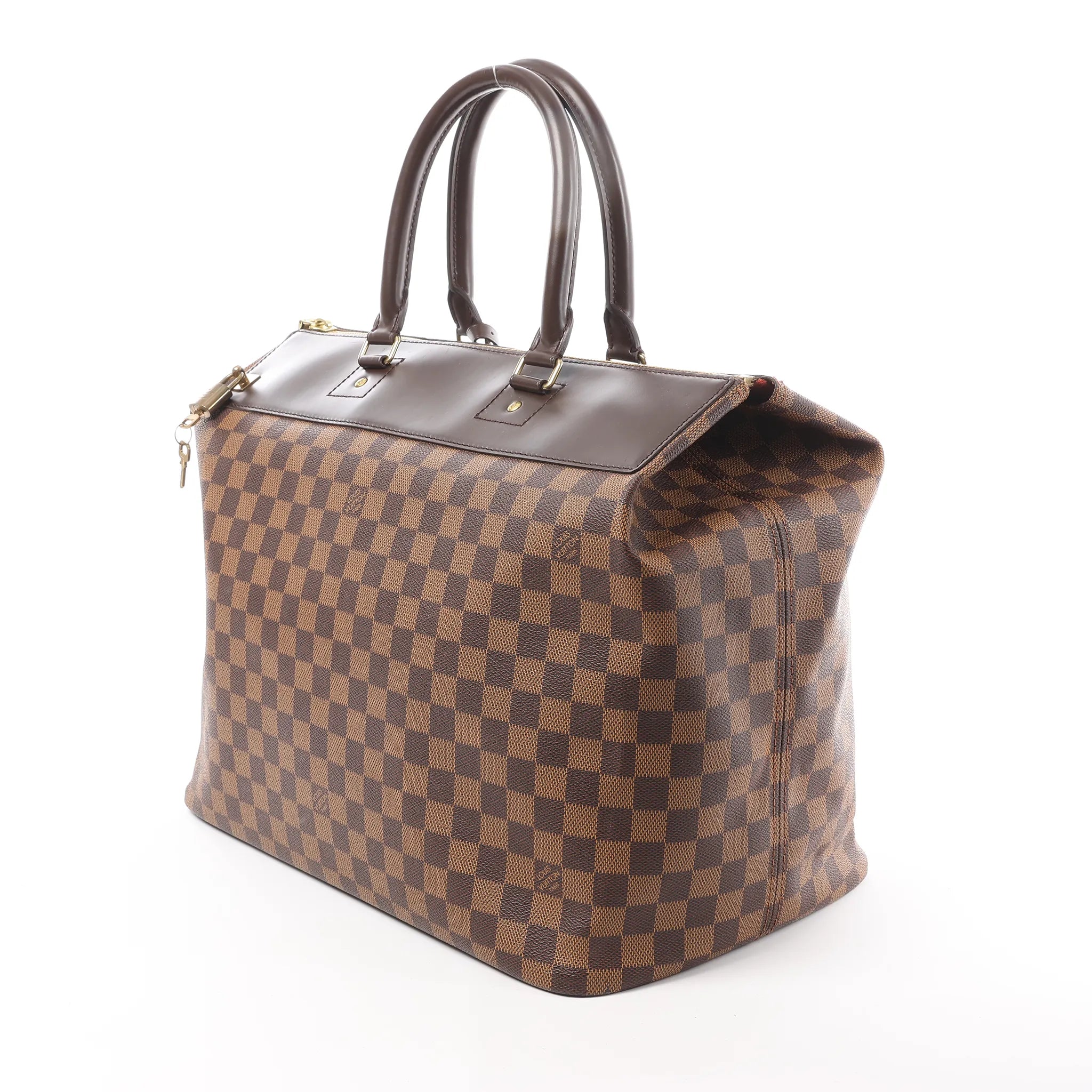 Classic Louis Vuitton structure in Damier Ebene. The Greenwich PM is a polished top-handle bag with a roomy silhouette, glossy brown leather trim, and a secure zip-top finished with signature lock detail—ideal for workdays and weekends.