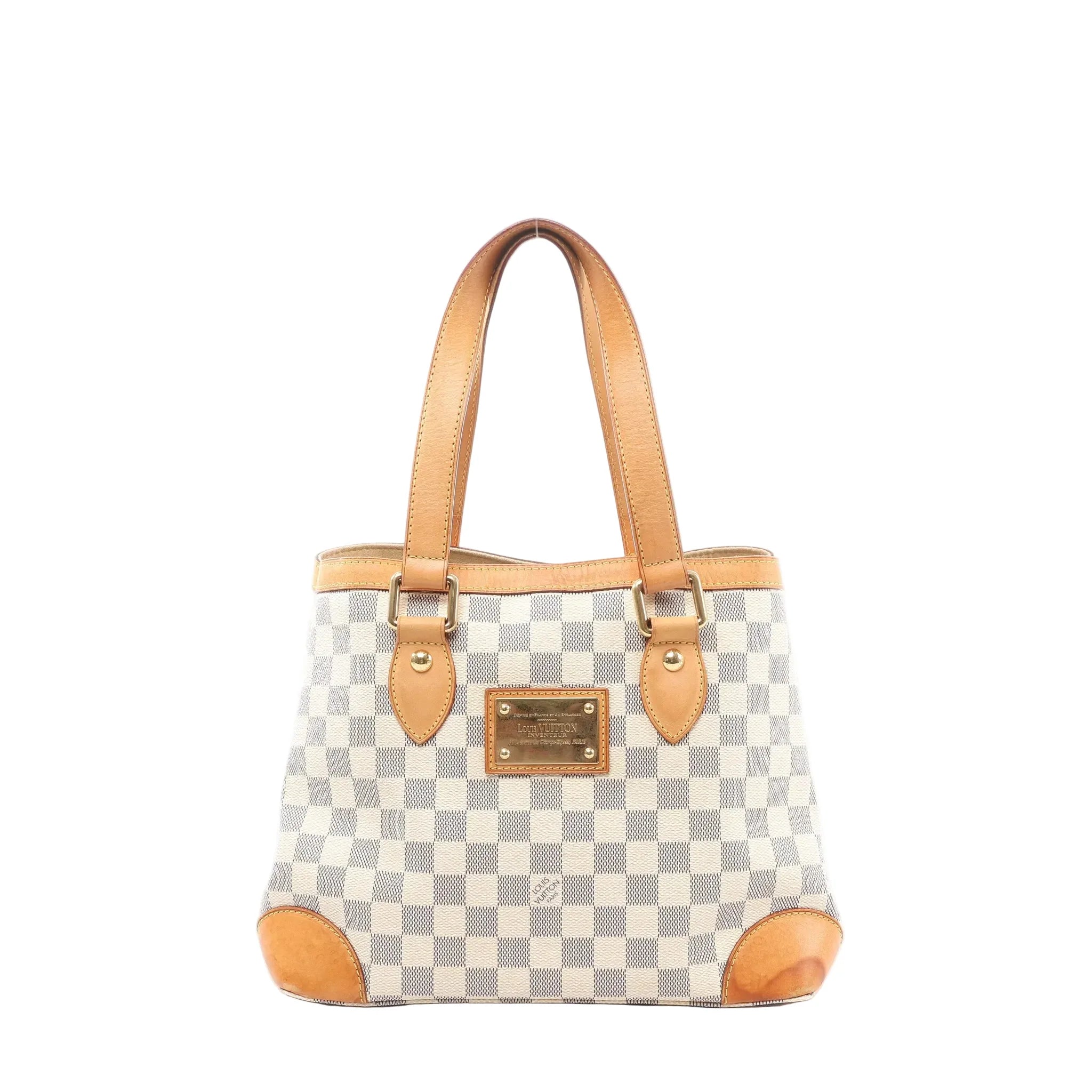 Louis Vuitton Hampstead PM Damier Azur handbag in beige (N51207)—a chic, structured tote with iconic Damier Azur canvas, vachetta leather trim, and a polished gold-tone logo plaque for effortless everyday style.