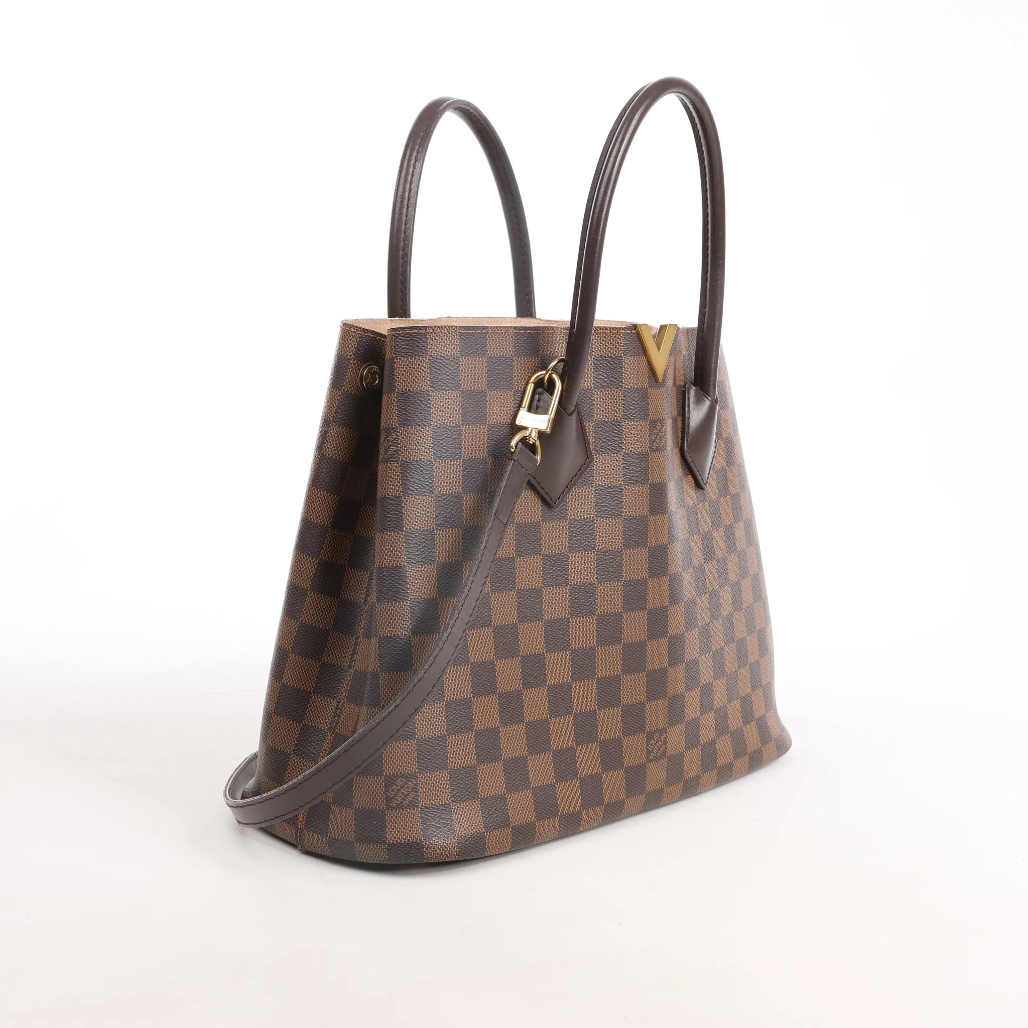 Louis Vuitton Kensington N41435 blends elegance and functionality in signature Damier Ebene canvas with rich brown leather accents and a sleek V-detail—perfect for work or weekend.