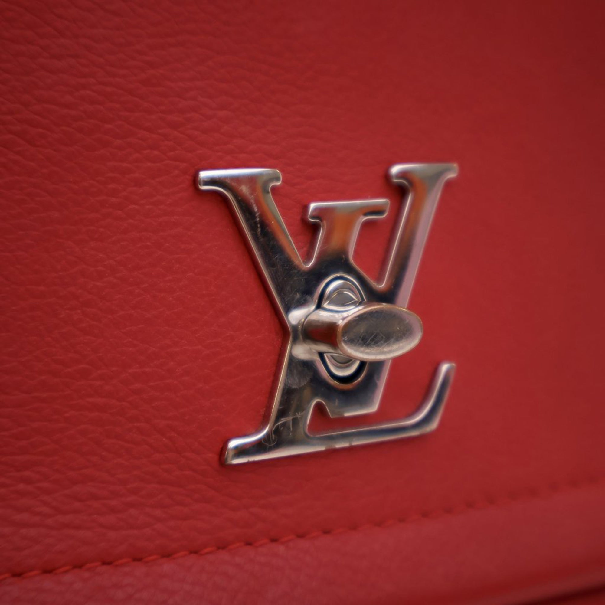 The LockMe II BB features a leather body, a chain link handle, a flat leather strap, a front flap with twist lock closure, and an exterior slip pocket. Retail Price: 2340.00