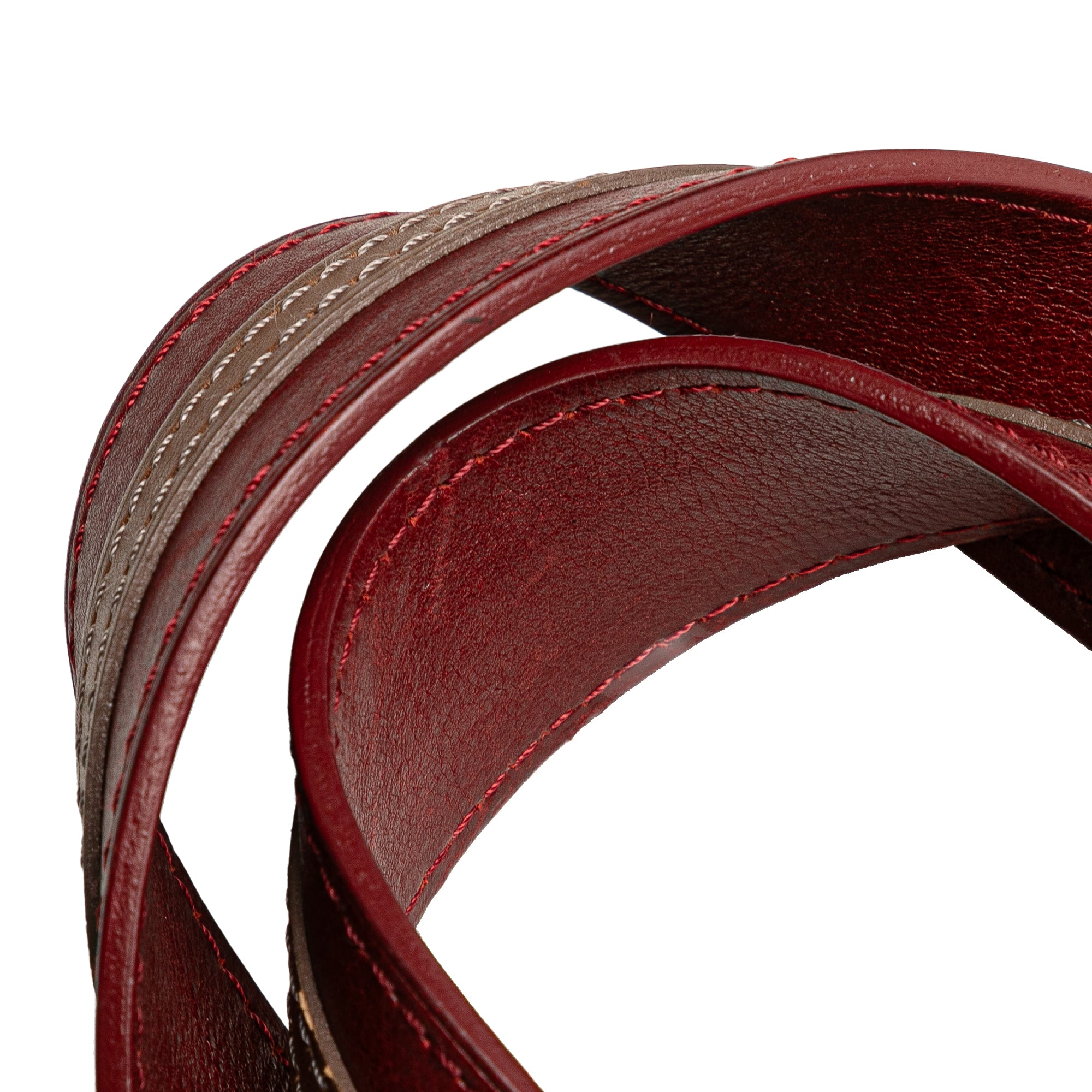 The Aviator bag features a monogram jacquard canvas body with leather trim, flat leather handles, a flat detachable and adjustable leather shoulder strap, a top zip closure, and an interior slip pocket. Retail Price: 3270.00