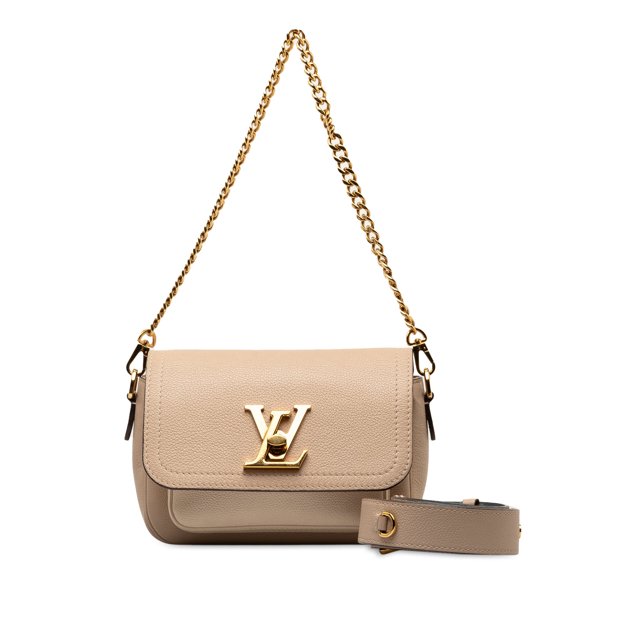 The Lockme Tender features a leather body, a detachable gold-tone chain link strap, an adjustable and detachable flat leather strap, a flap with turn-lock closure, an exterior flap pocket, and an interior slip pocket. Retail Price: 2710.00