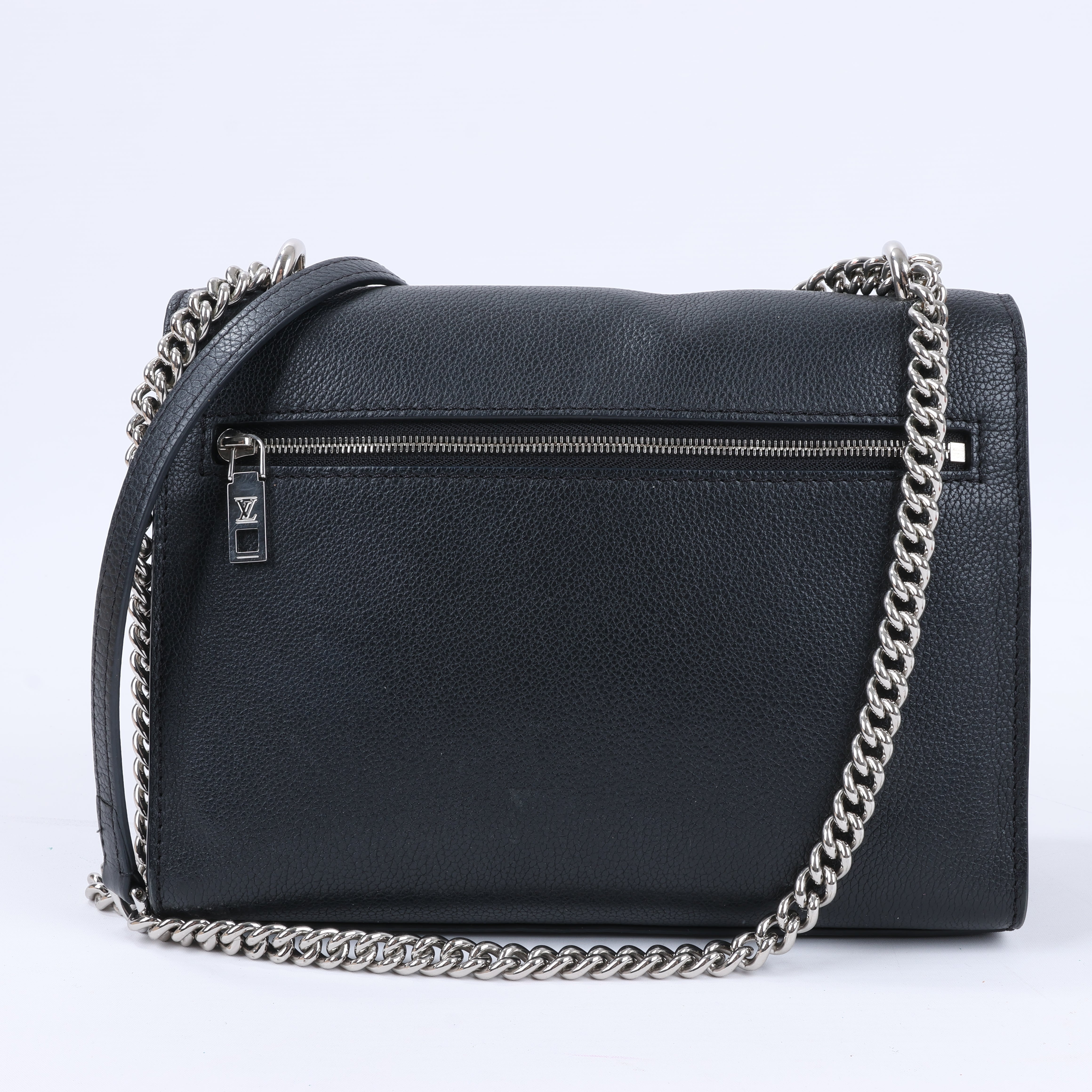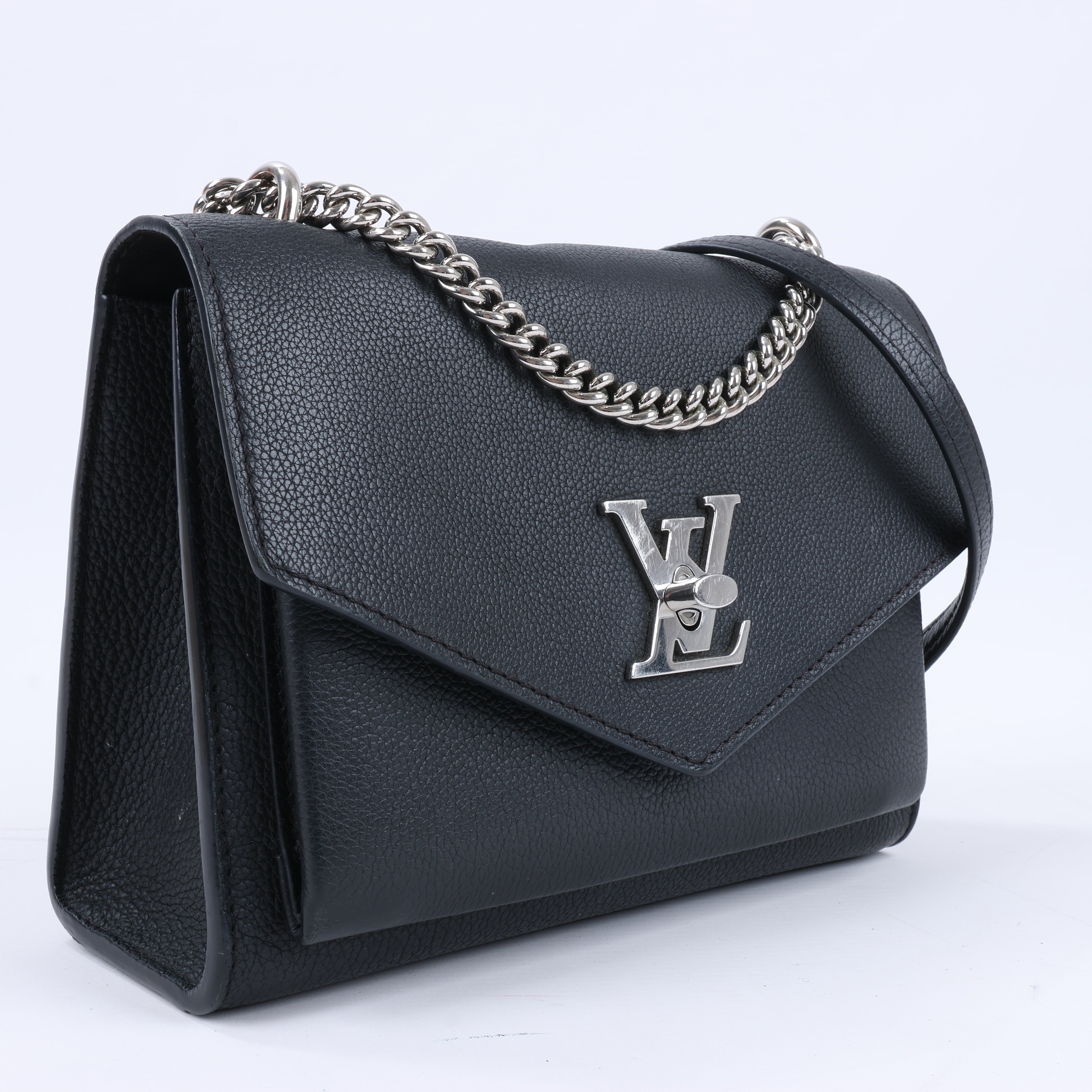 The Louis Vuitton Cuir Taurillon MyLockMe BB 2Way Handbag in Black (M51418) features luxurious black grained leather, a sleek silver-tone LV twist lock, and versatile chain strap. Compact and elegant, it offers timeless style for both hand and shoulder carry.