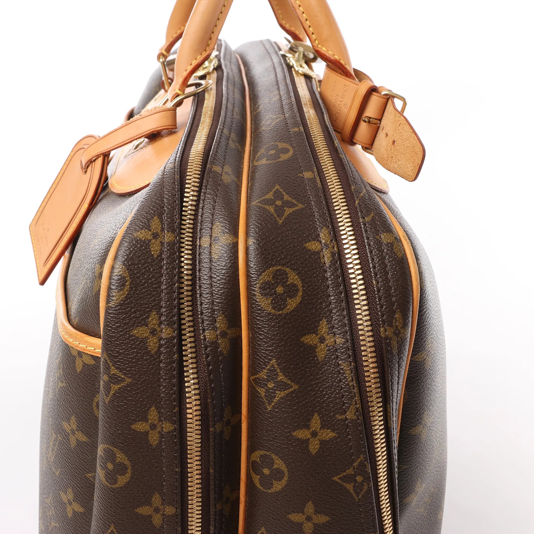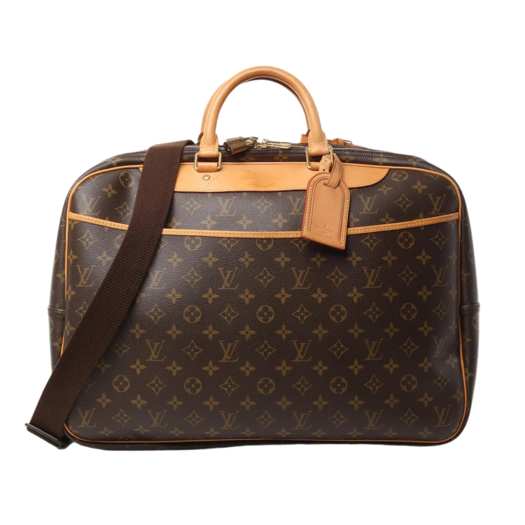 Louis Vuitton Alize 2 Poches Travel Bag M41399 in signature Monogram canvas with natural cowhide leather trim. Designed for stylish getaways, this spacious, durable travel bag offers dual compartments and a comfortable shou