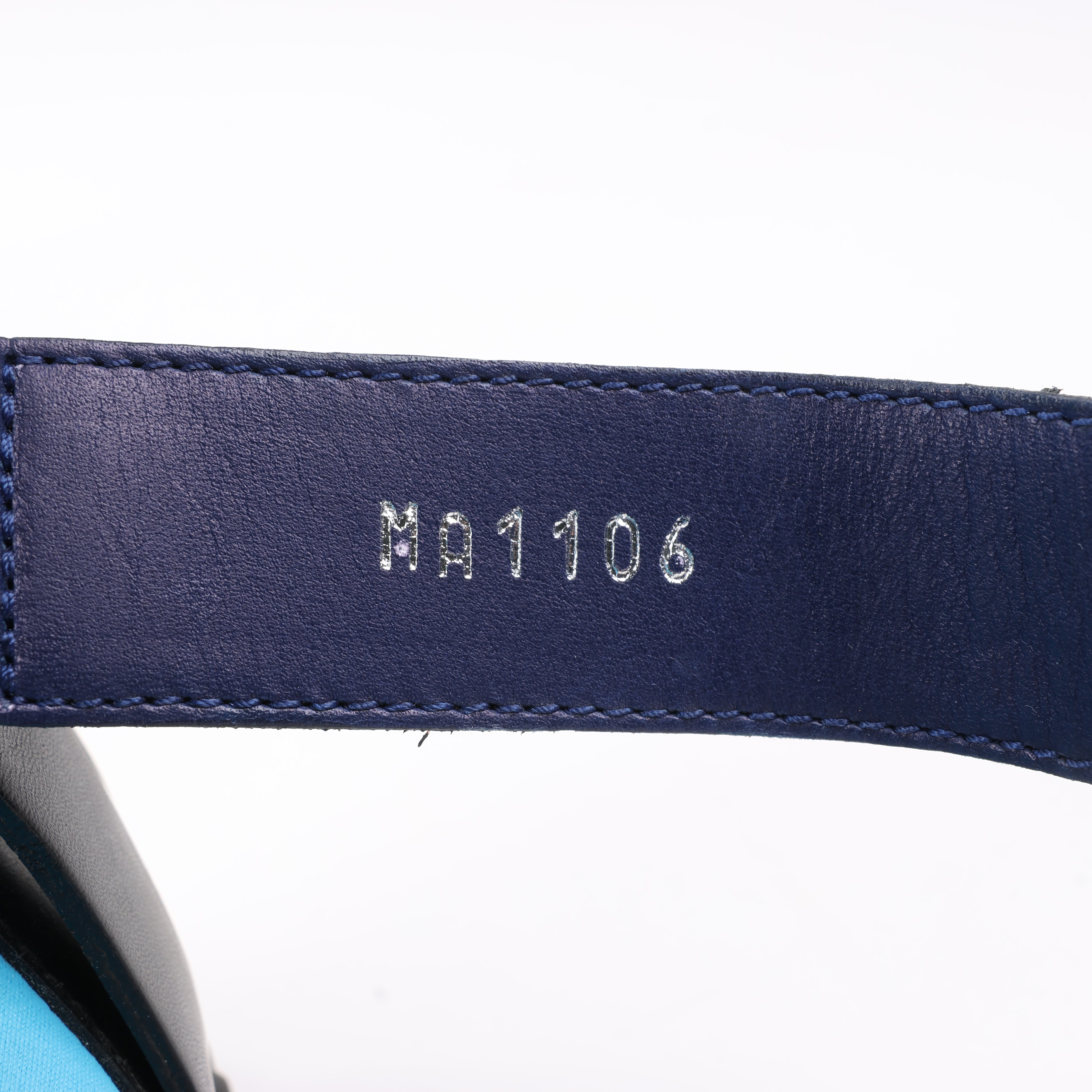 Louis Vuitton Neoprene Deep Sea Ankle Boot in Blue, Size 39 EU, features a bold design with blue and white neoprene panels, a navy leather strap, and a geometric block heel. Accented with vibrant graphics at the back, this statement piece combines sporty elegance with modern style.
