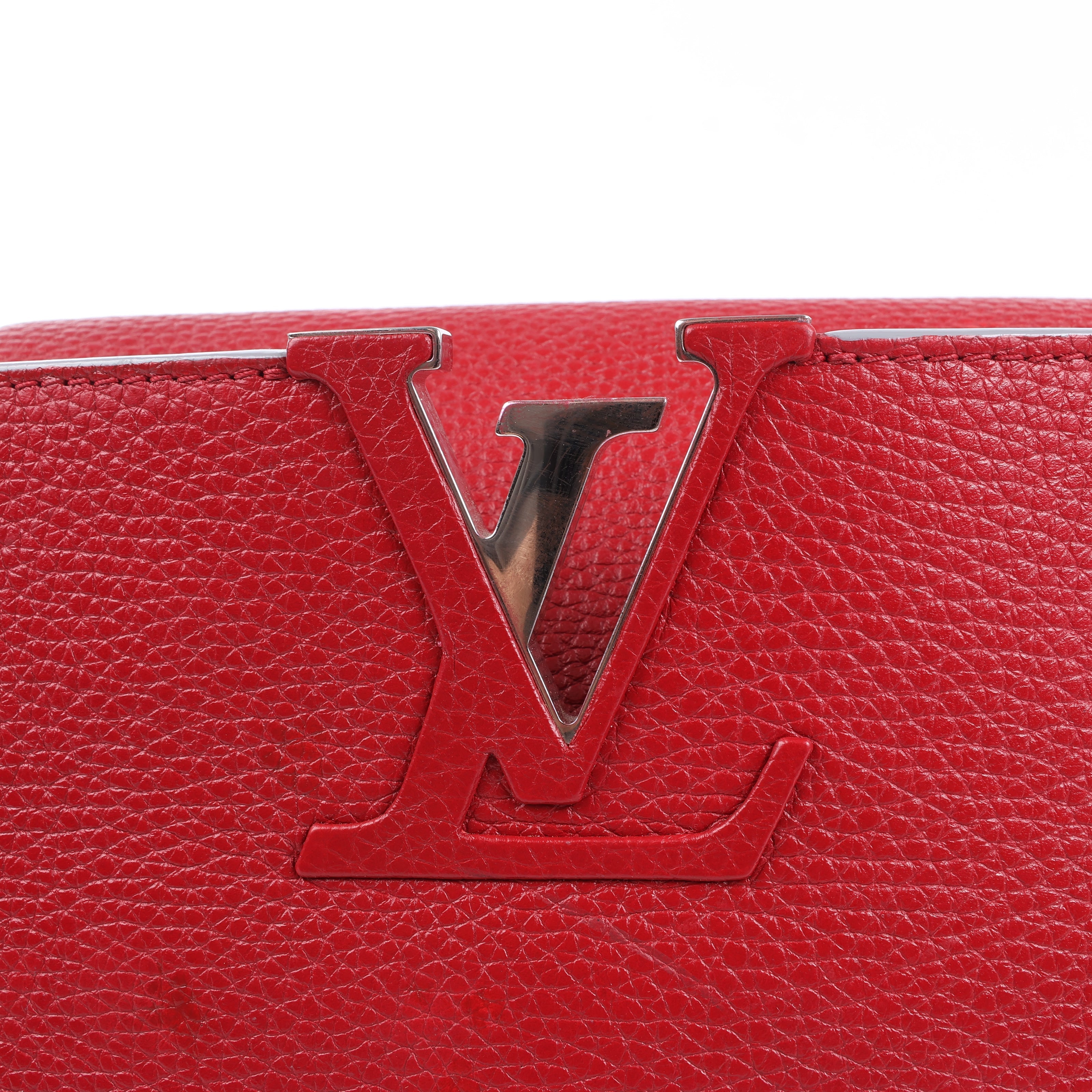 Brand: Louis VuittonModel: CapucinesSize: GM Width: 40 cmHeight: 26 cm Exterior Condition: Very goodInterior Condition: ExcellentCondition Details: The exterior leather is in good condition, but has stains. The handle is clean and firm. Note: The shoulder strap is missing. The hardware remains bright and crisp, but has hairline scratches. The interior leatheris in excellent condition. Overall the bag looks great! Date code: TR3193 Colour: RedInterior Colour: TaupeHardware Colour: GoldMaterial: LeatherComes With: Entrupy certificate