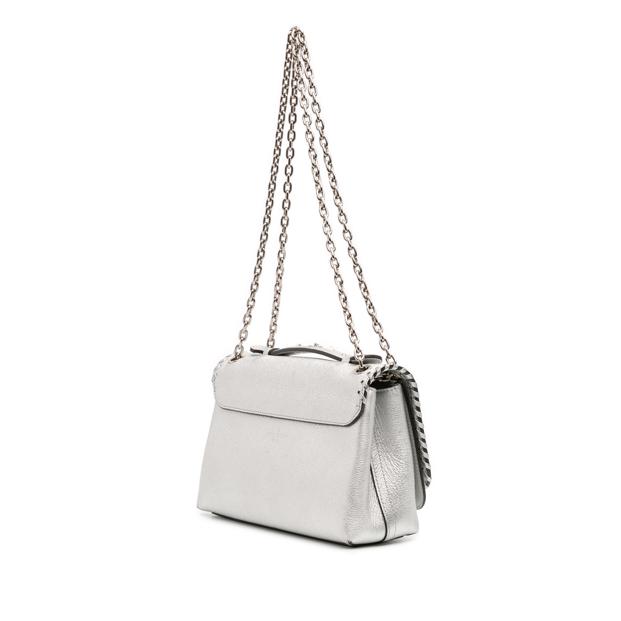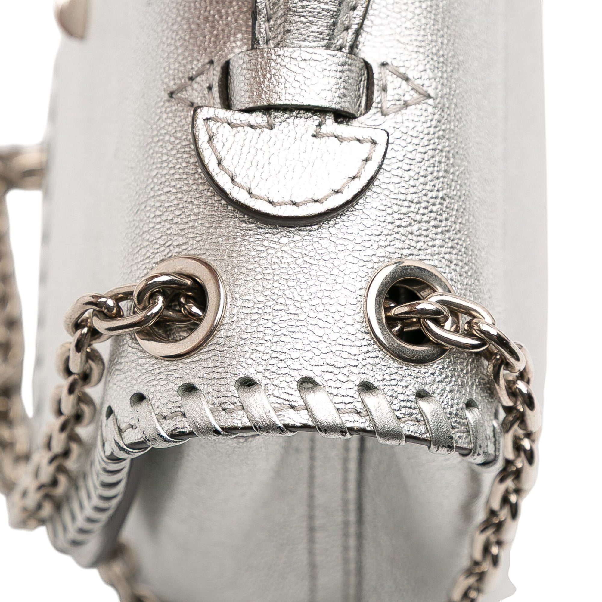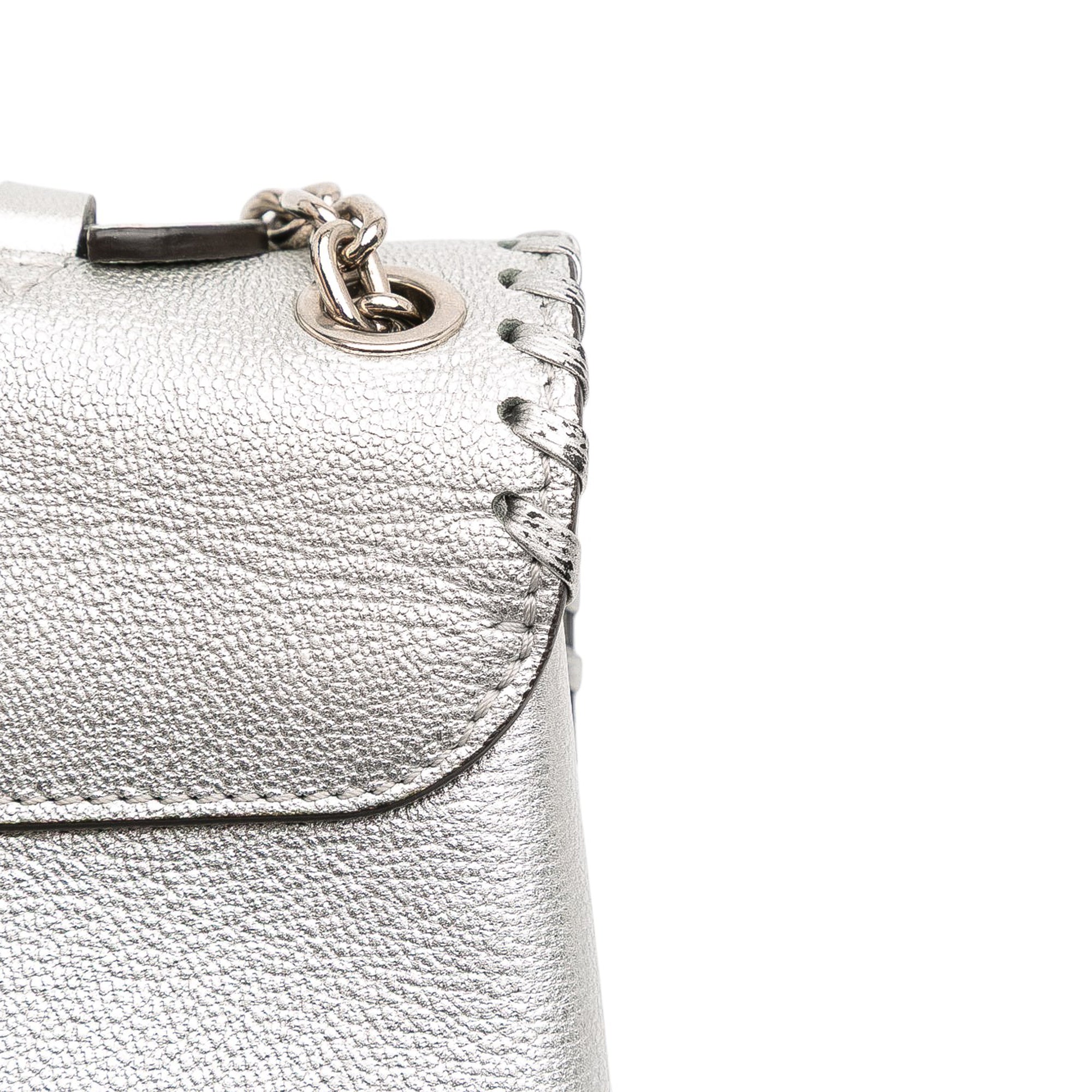 The Very Chain features a metallic leather body, a studded flat top handle, chain link straps, a front flap with magnetic closure, and interior slip pockets. Retail Price: 3300.00