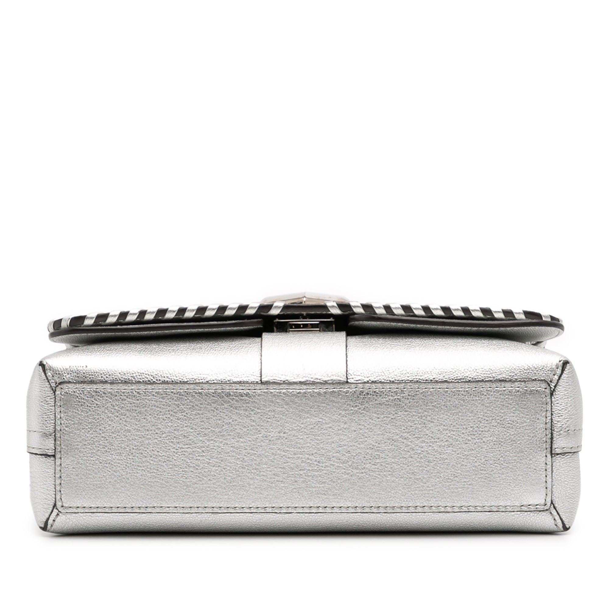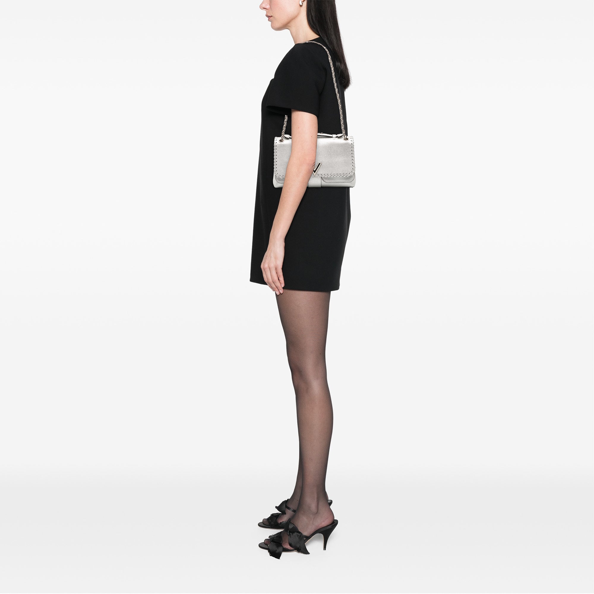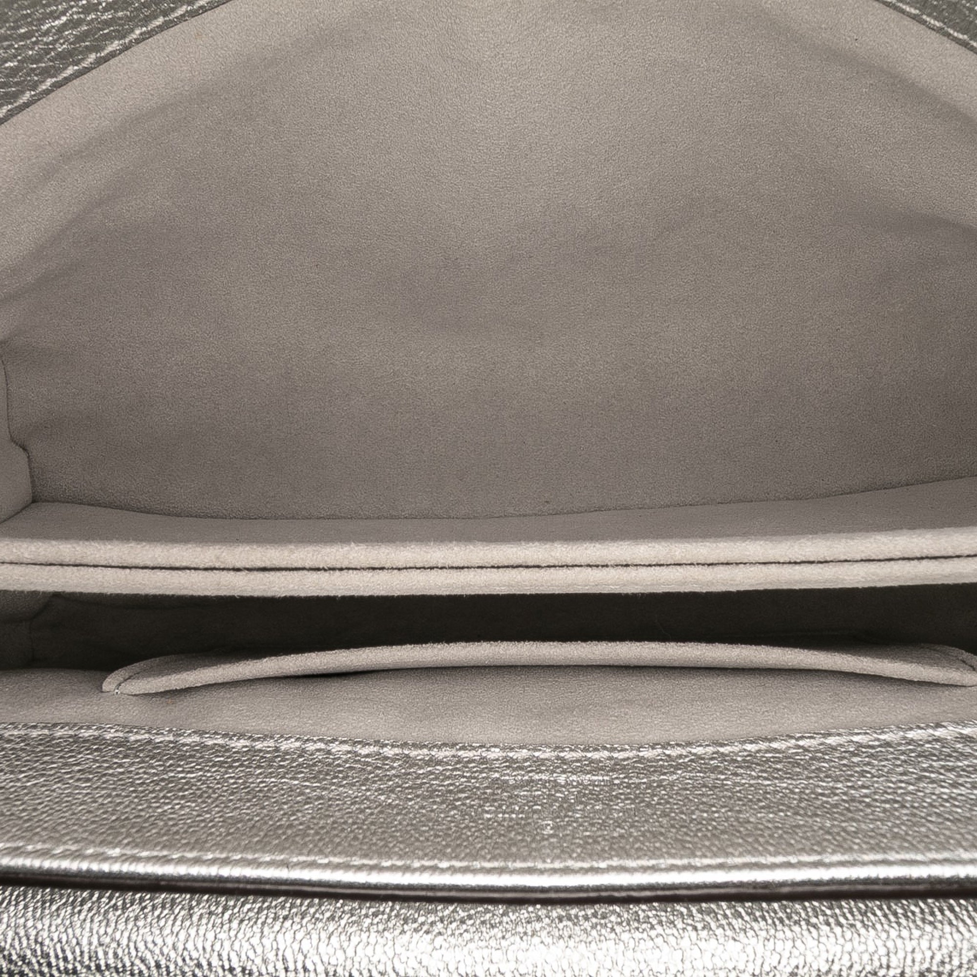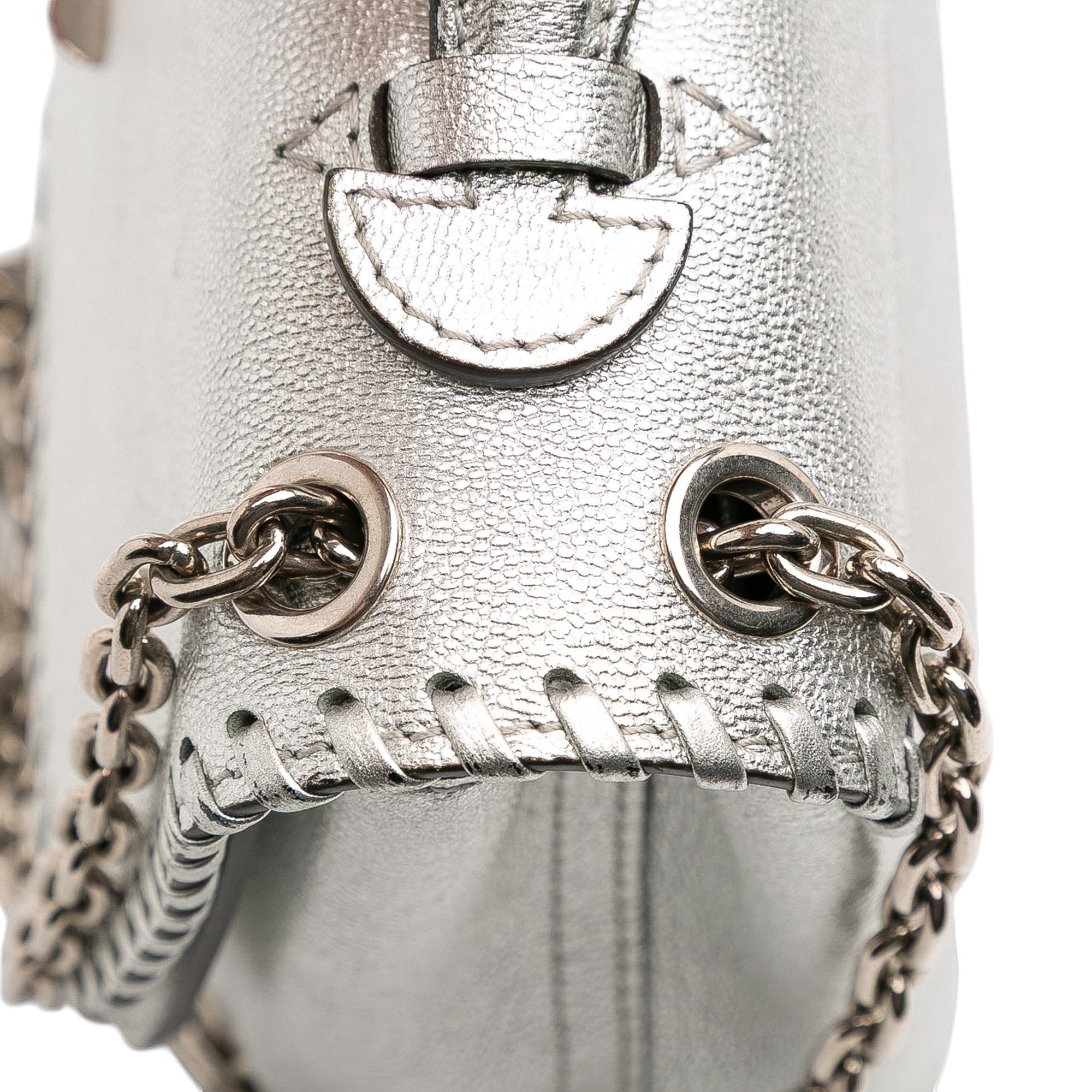 The Very Chain features a metallic leather body, a studded flat top handle, chain link straps, a front flap with magnetic closure, and interior slip pockets. Retail Price: 3300.00