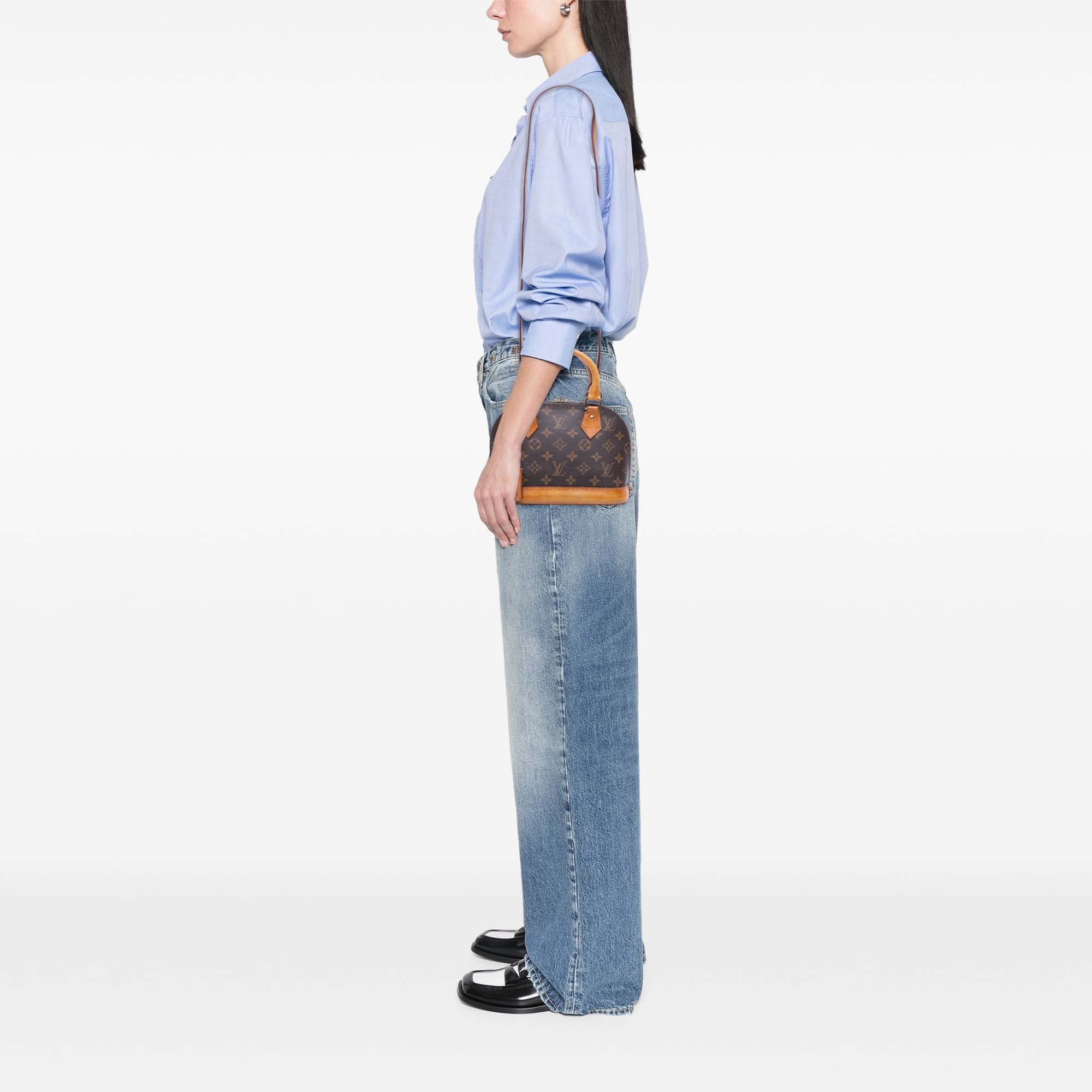 The Alma BB features a monogram canvas body with vachetta leather trim, rolled vachetta leather handles, a detachable flat vachetta leather strap, a top zip closure, and an interior slip pocket. Retail Price: 1760.00