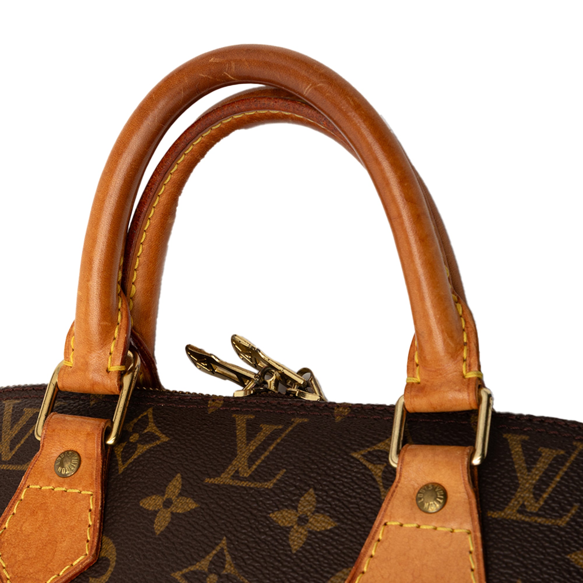 The Alma PM features a monogram canvas body with vachetta leather trim, rolled vachetta leather handles, a top zip closure, and an interior slip pocket. Retail Price: 1579.00