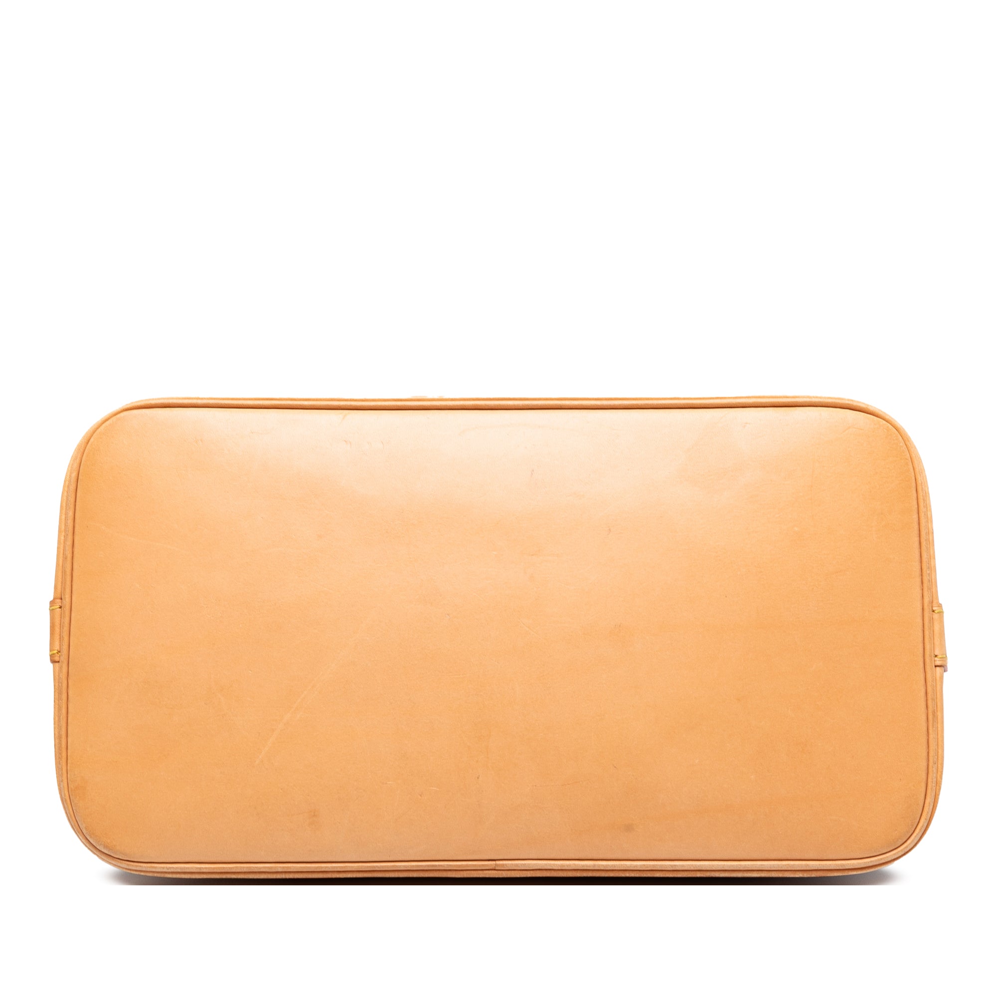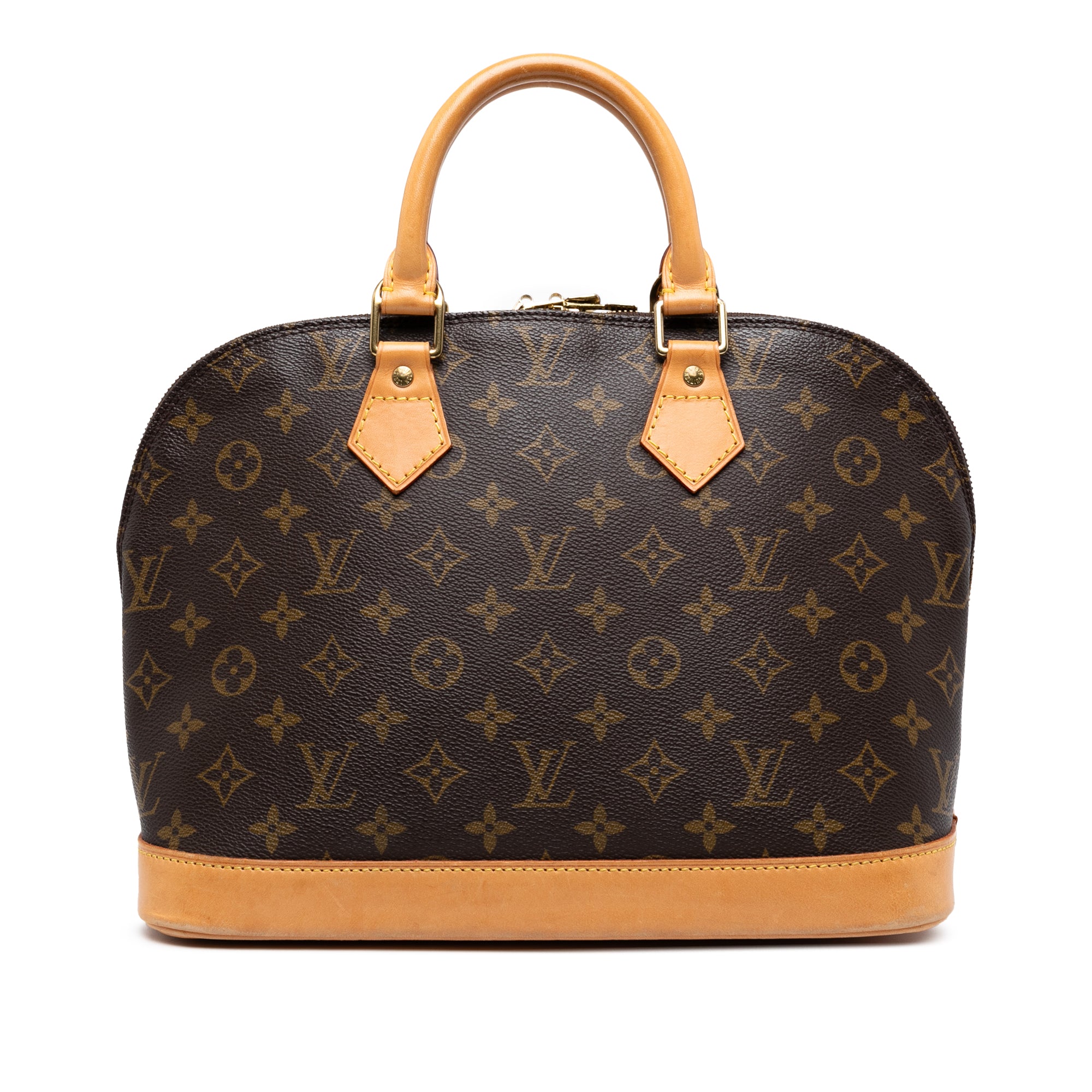 The Alma PM features a monogram canvas body with vachetta leather trim, rolled vachetta leather handles, a top zip closure, and interior slip pockets. Retail Price: 1579.00