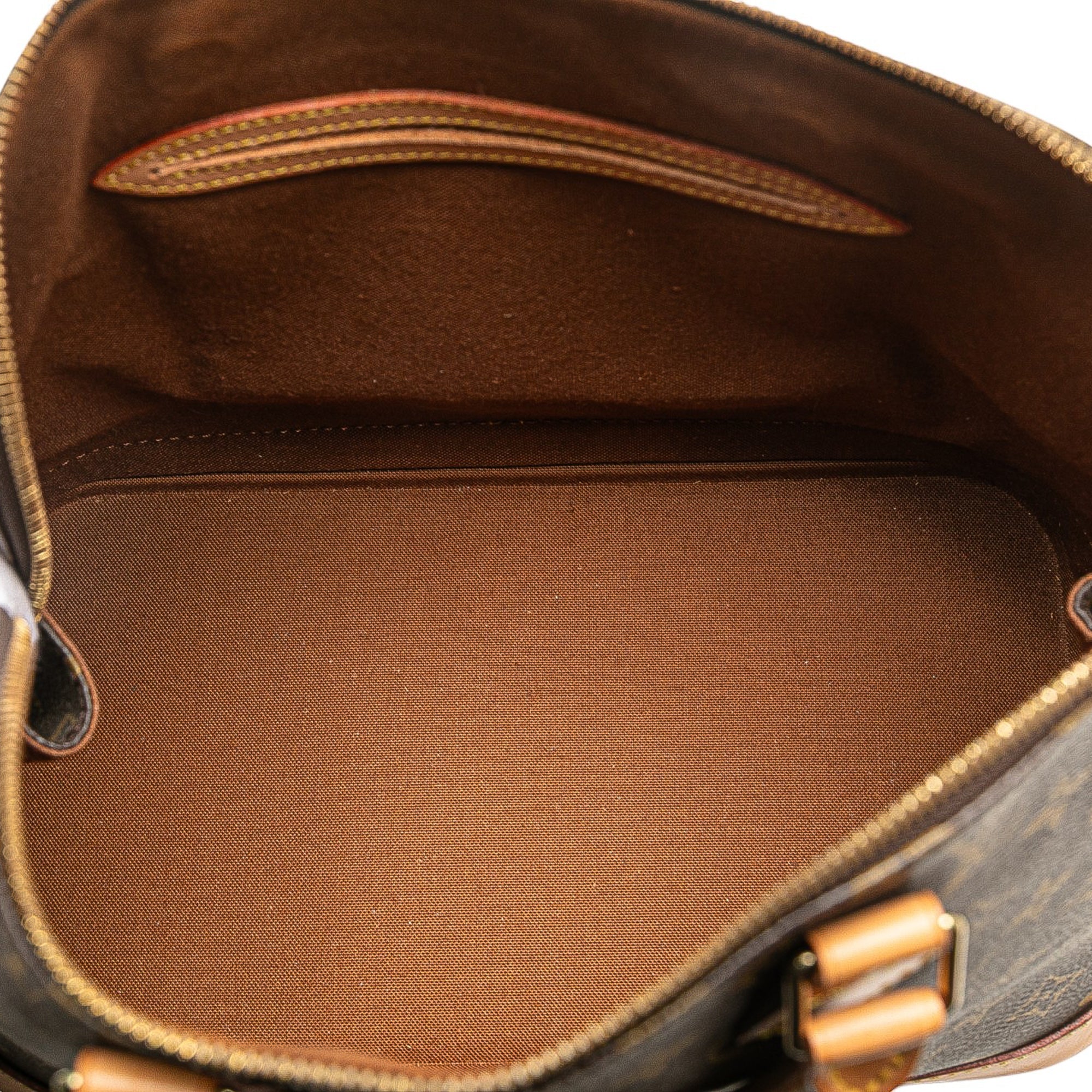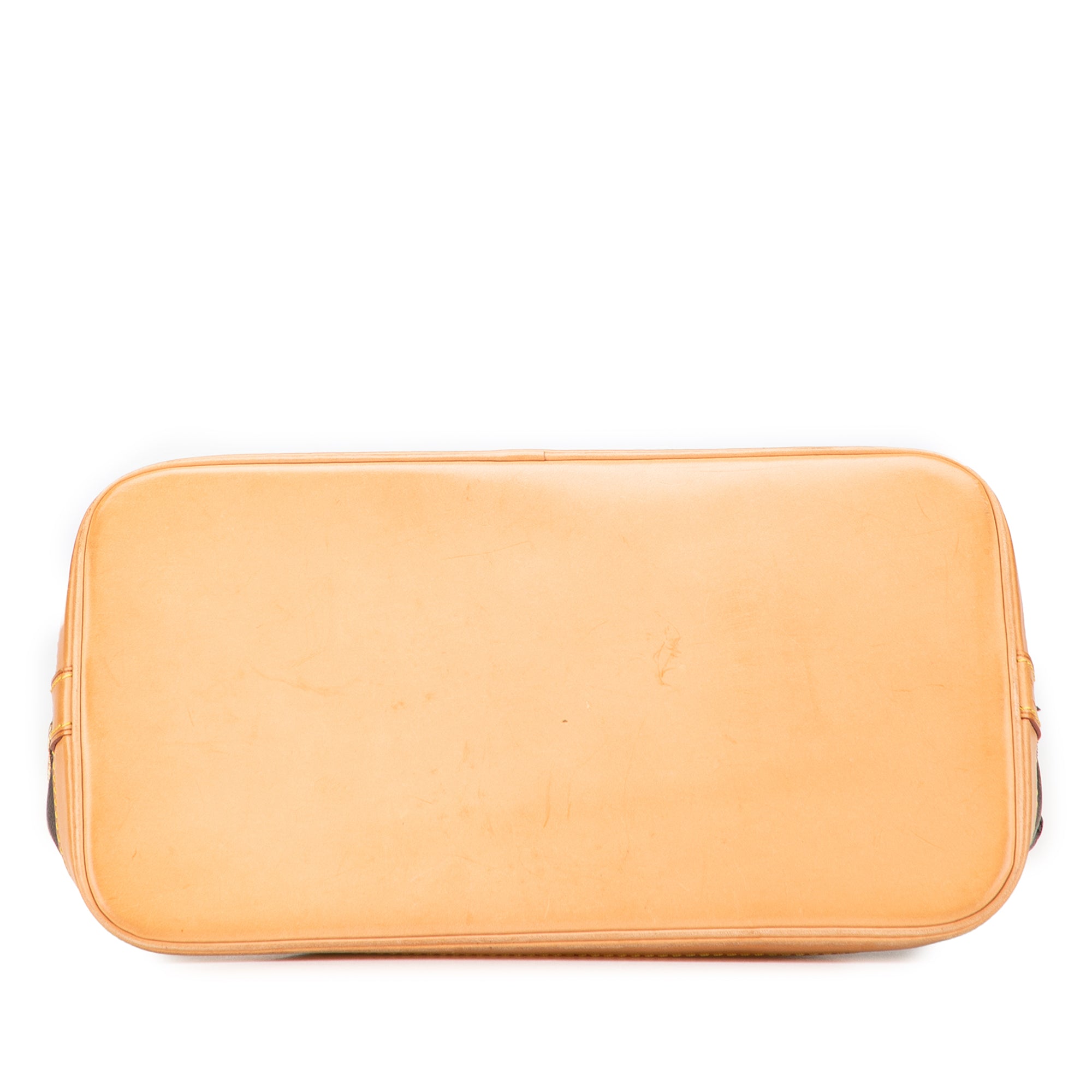 The Alma PM features a monogram canvas body with vachetta leather trim, rolled vachetta leather handles, a top zip closure, and an interior slip pocket. Retail Price: 1579.00