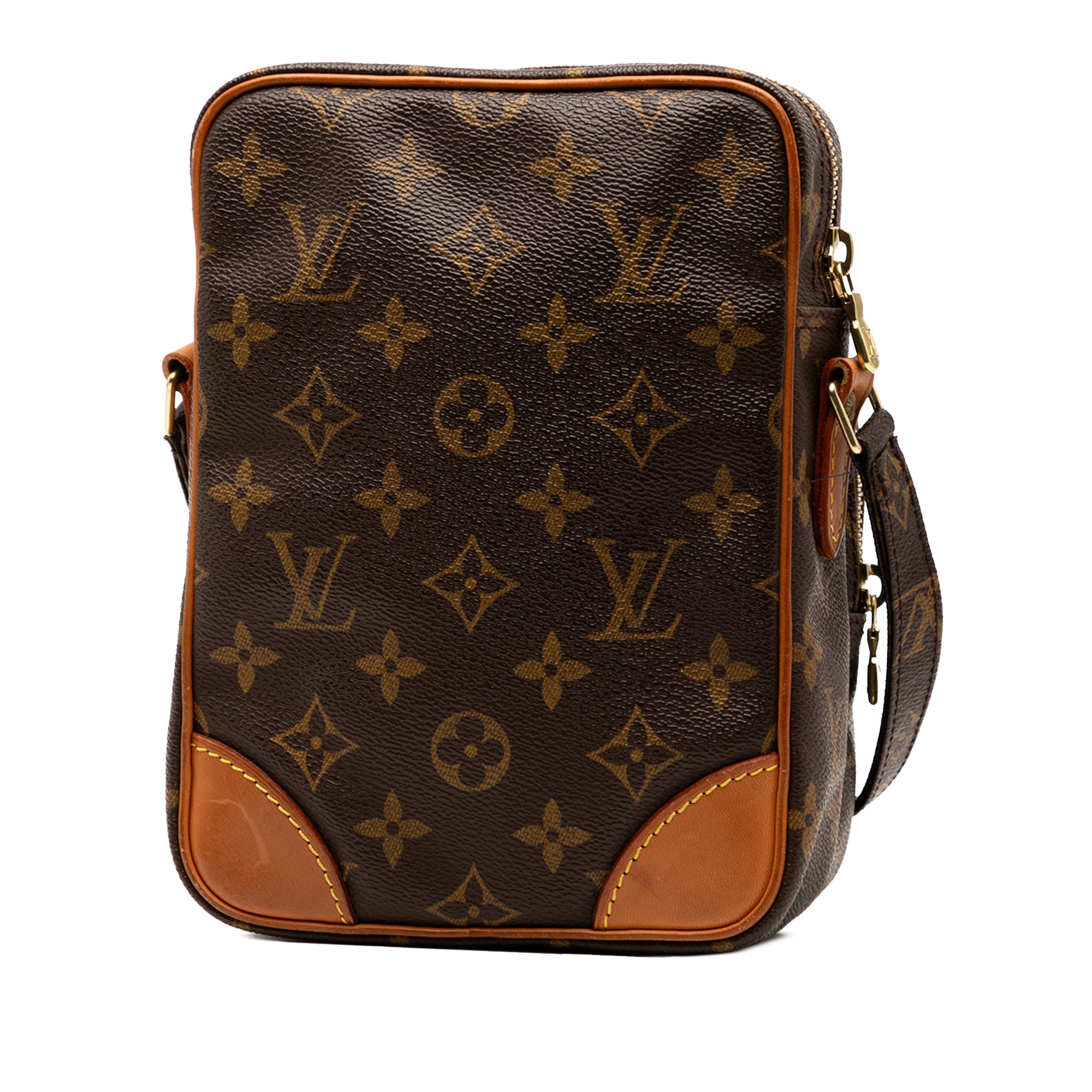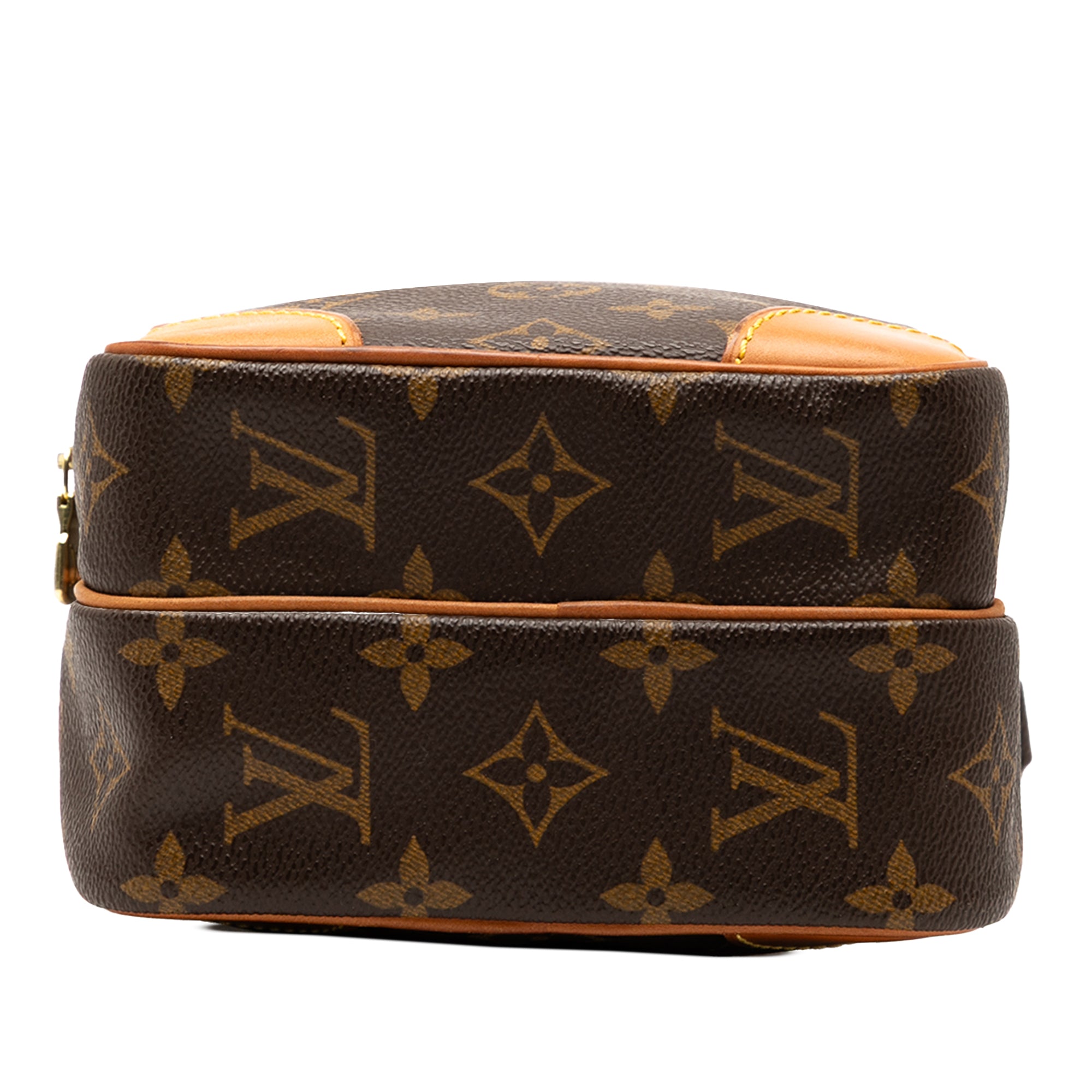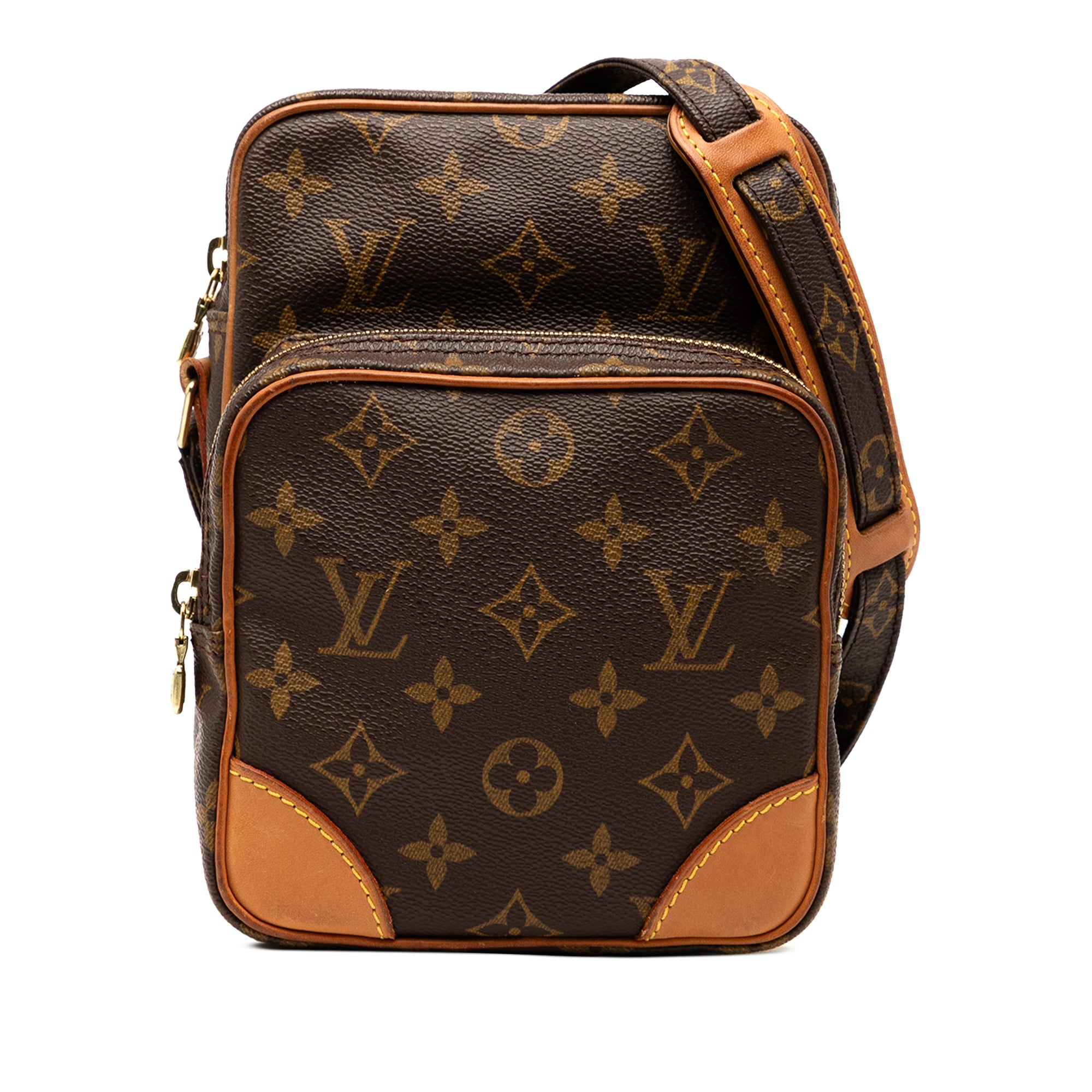 The Amazone features a monogram canvas body with vachetta leather trim, an adjustable shoulder strap, a top zip closure, an exterior front zip pocket, and an interior slip pocket. Retail Price: 1000.00