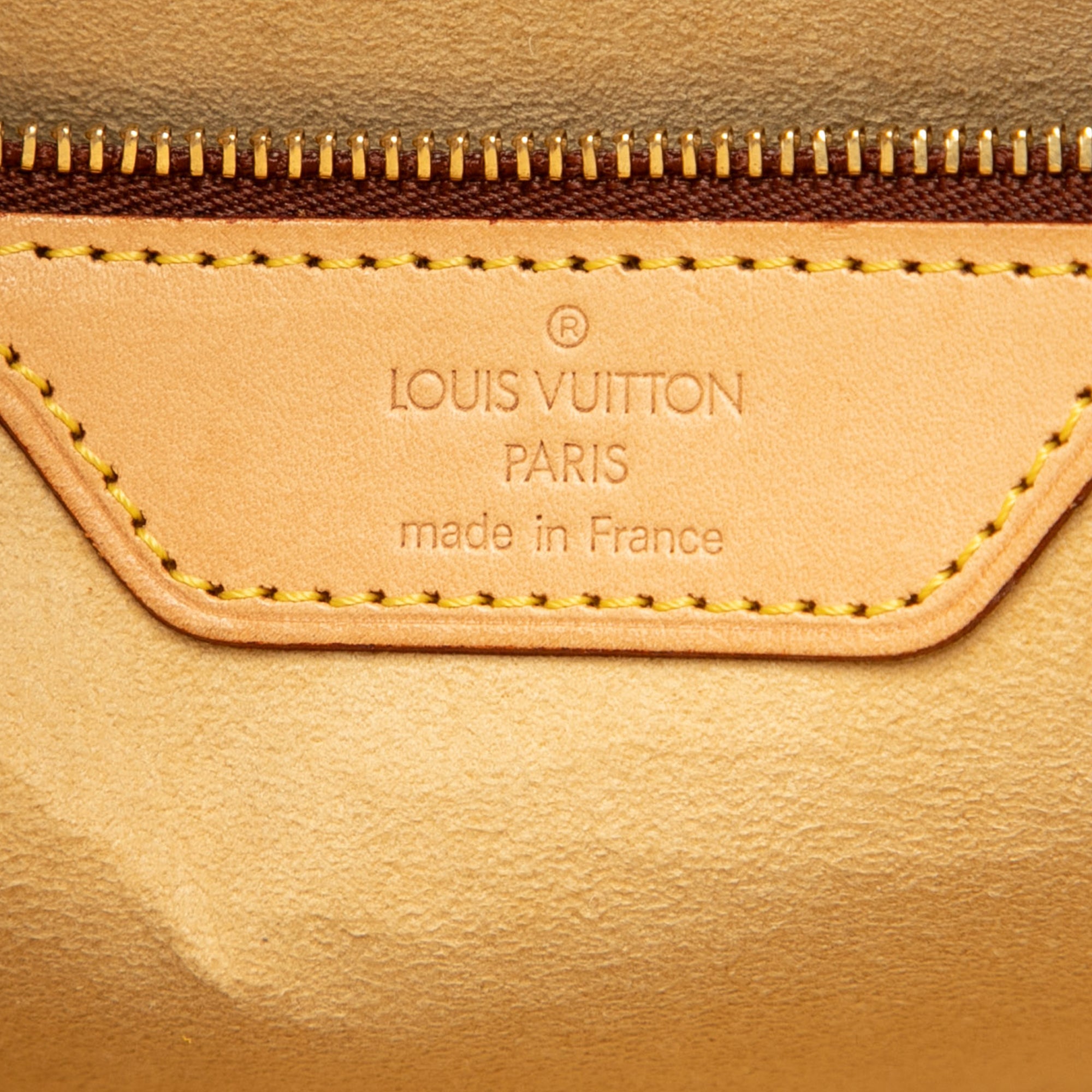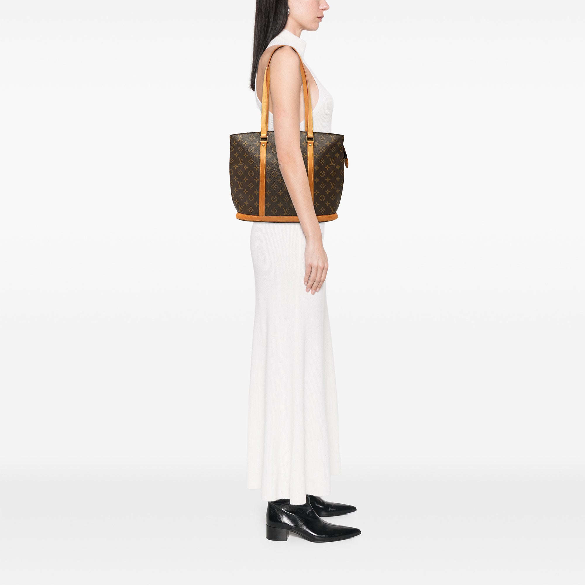 The Babylone features a monogram canvas body with vachetta leather trim, flat vachetta leather straps, a top zip closure, and interior zip and slip pockets. Retail Price: 1350.00