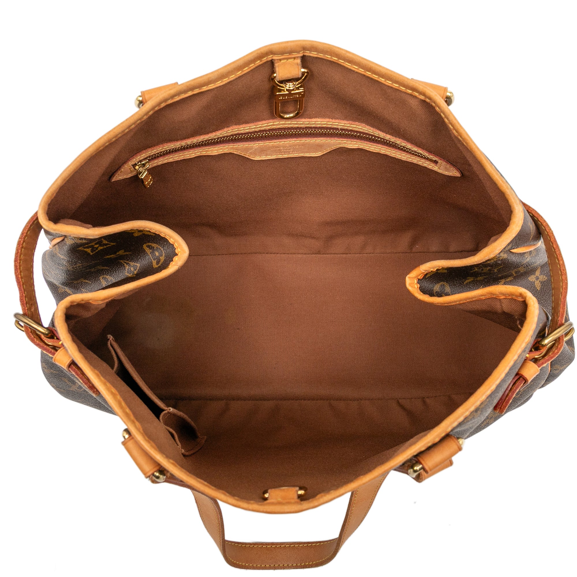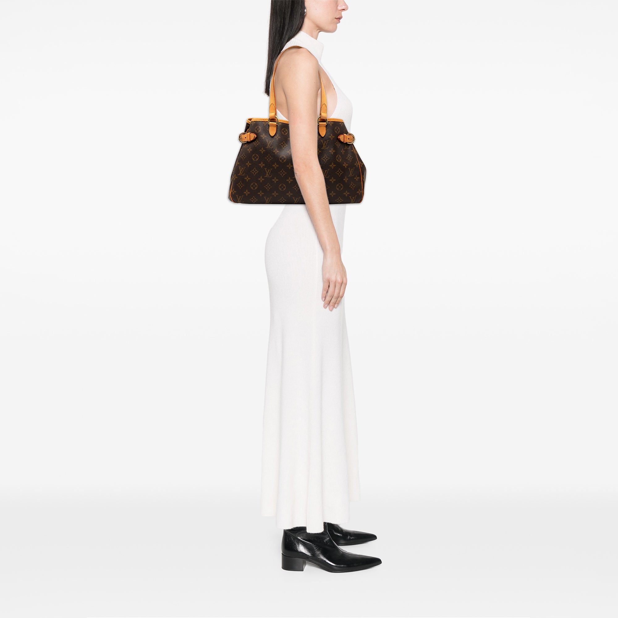 The Batignolles Horizontal features a monogram canvas body with vachetta leather trim, flat vachetta leather shoulder straps, an open top with a lobster clasp closure, and interior zip and slip pockets. Inclusion: Dust bag. Retail Price: 1130.00