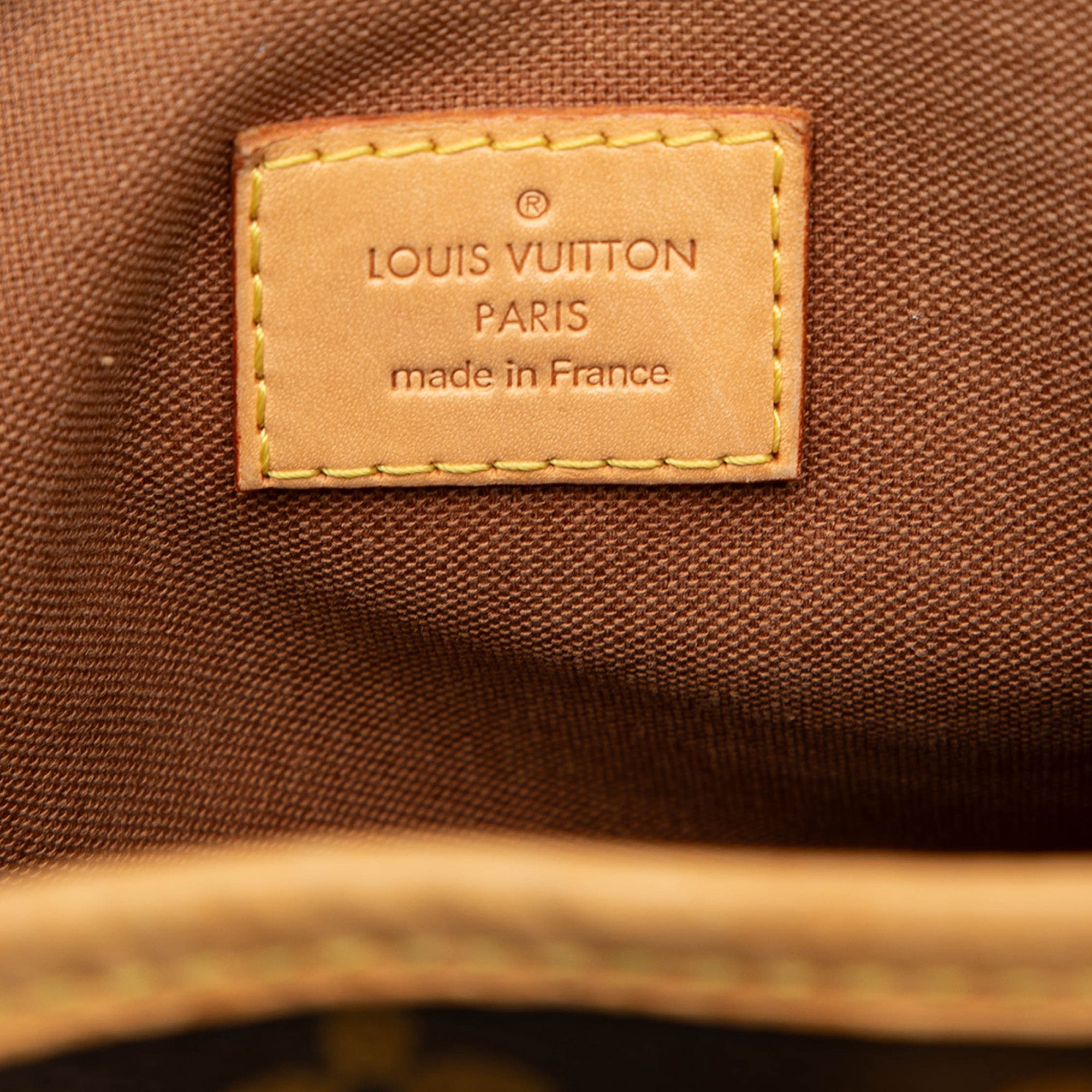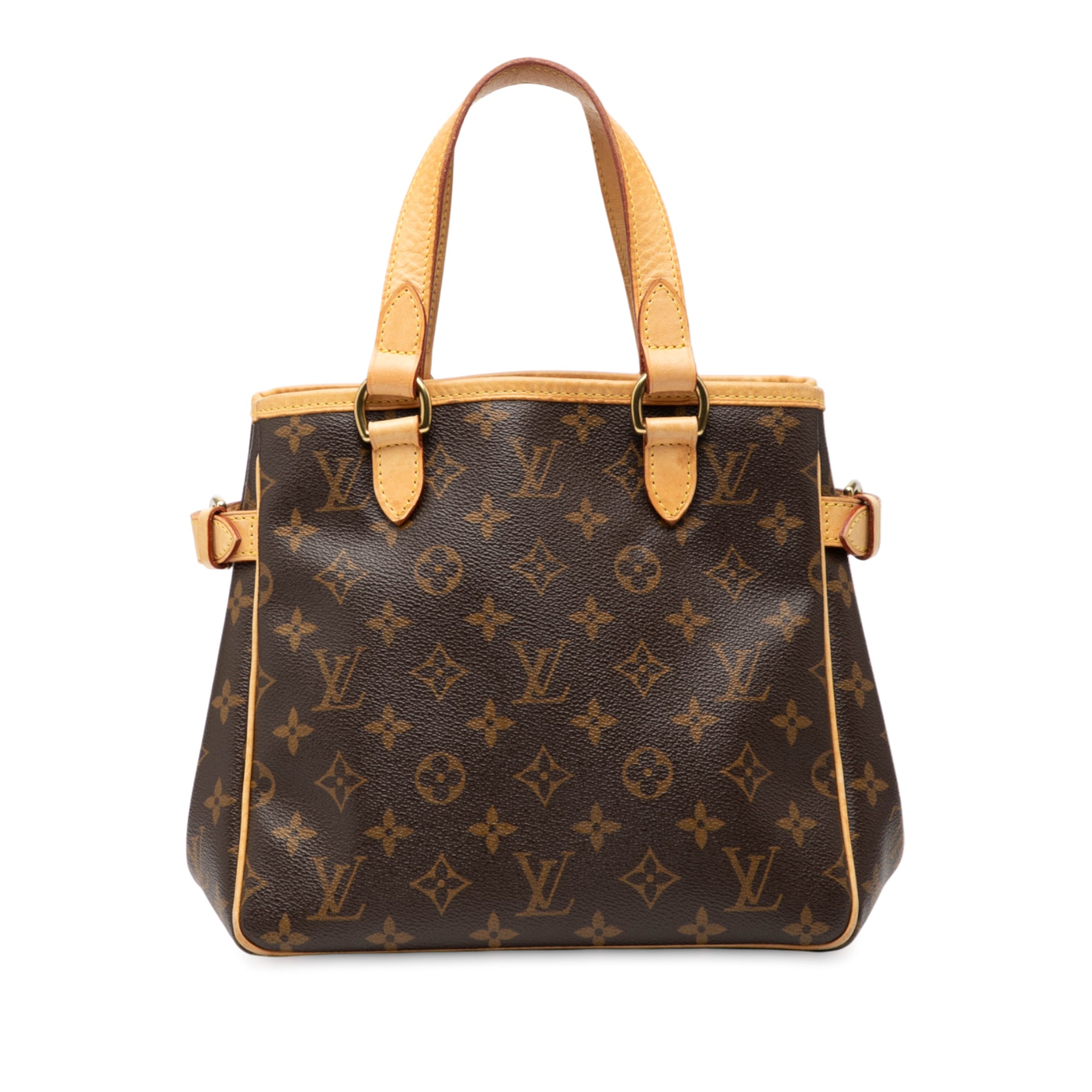 The Batignolles Vertical PM features a monogram canvas body with vachetta leather trim, flat vachetta leather handles, an open top, and interior slip pockets. Retail Price: 1150.00