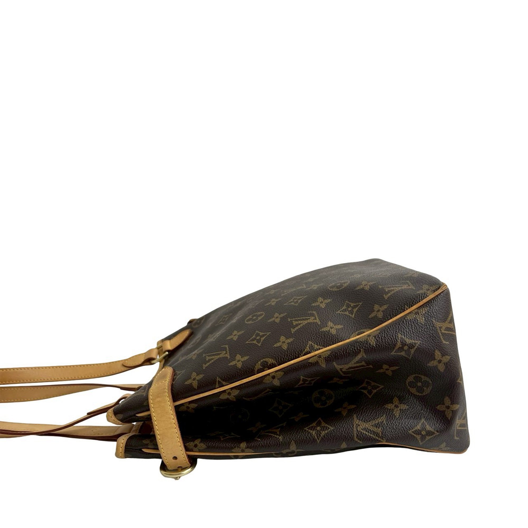 The Batignolles features a monogram canvas body with vachetta leather trim, flat vachetta leather straps, side belt details, an open top, and interior open and slip pockets. Retail Price: 1045.00