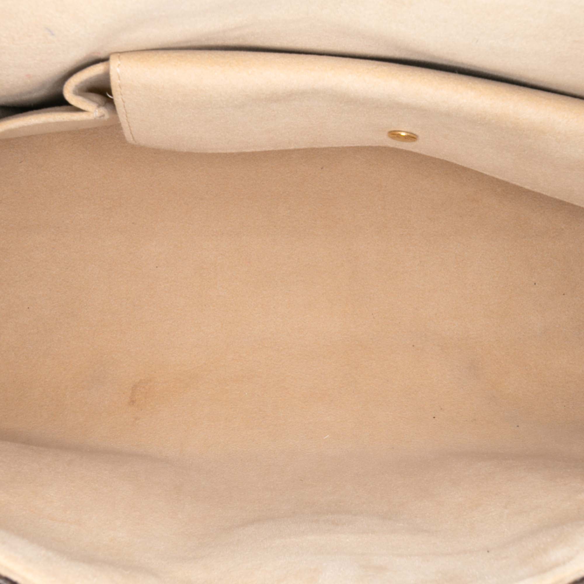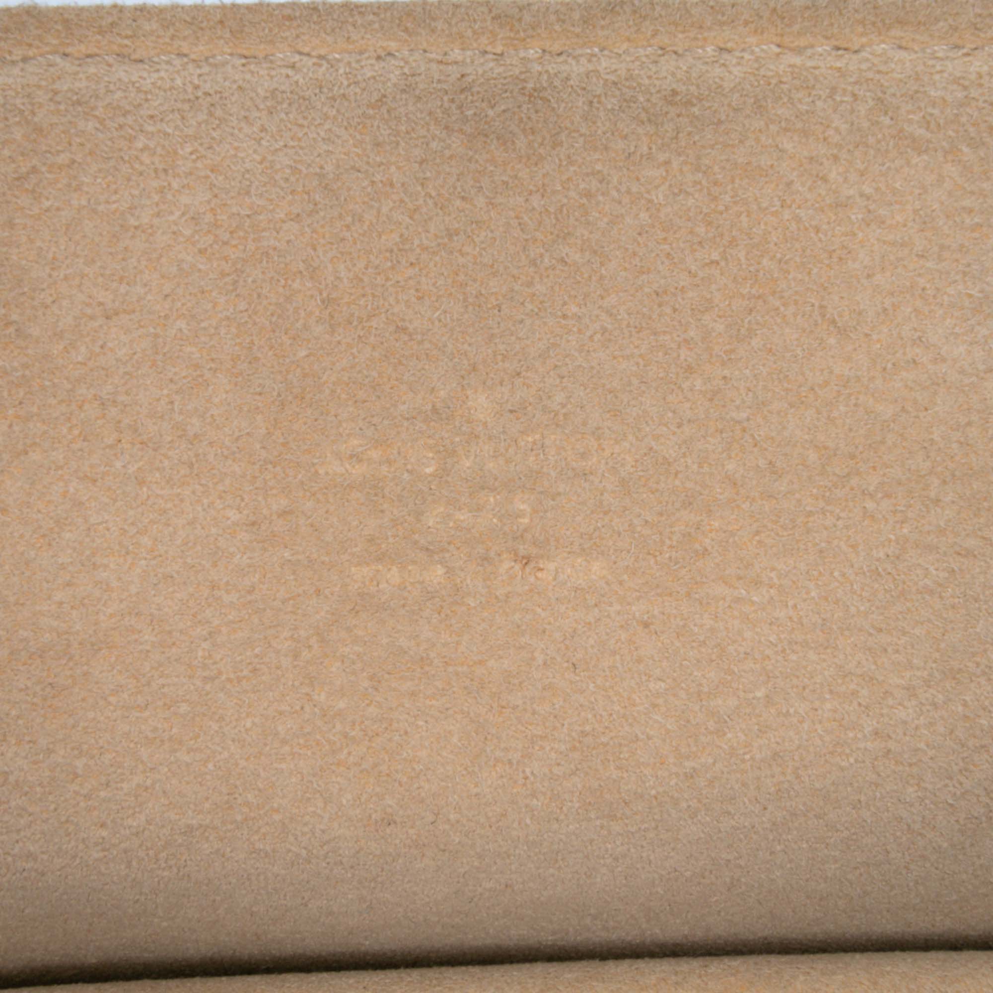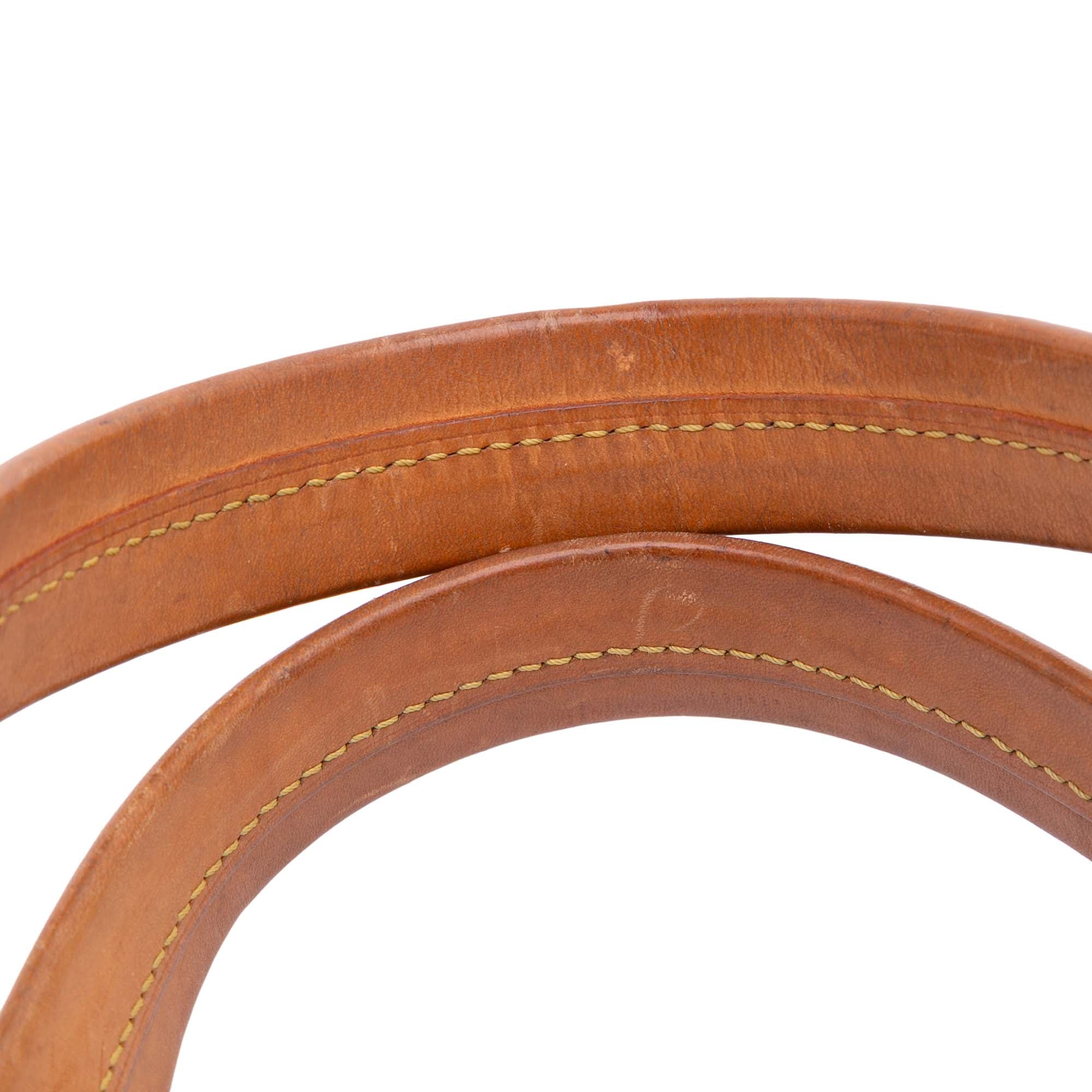The Beverly GM features a monogram canvas body with vachetta leather trim, flat vachetta leather straps, a front flap with a gold-tone push lock closure, an exterior back slip pocket, and interior open and flap pockets. Retail Price: 1880.00