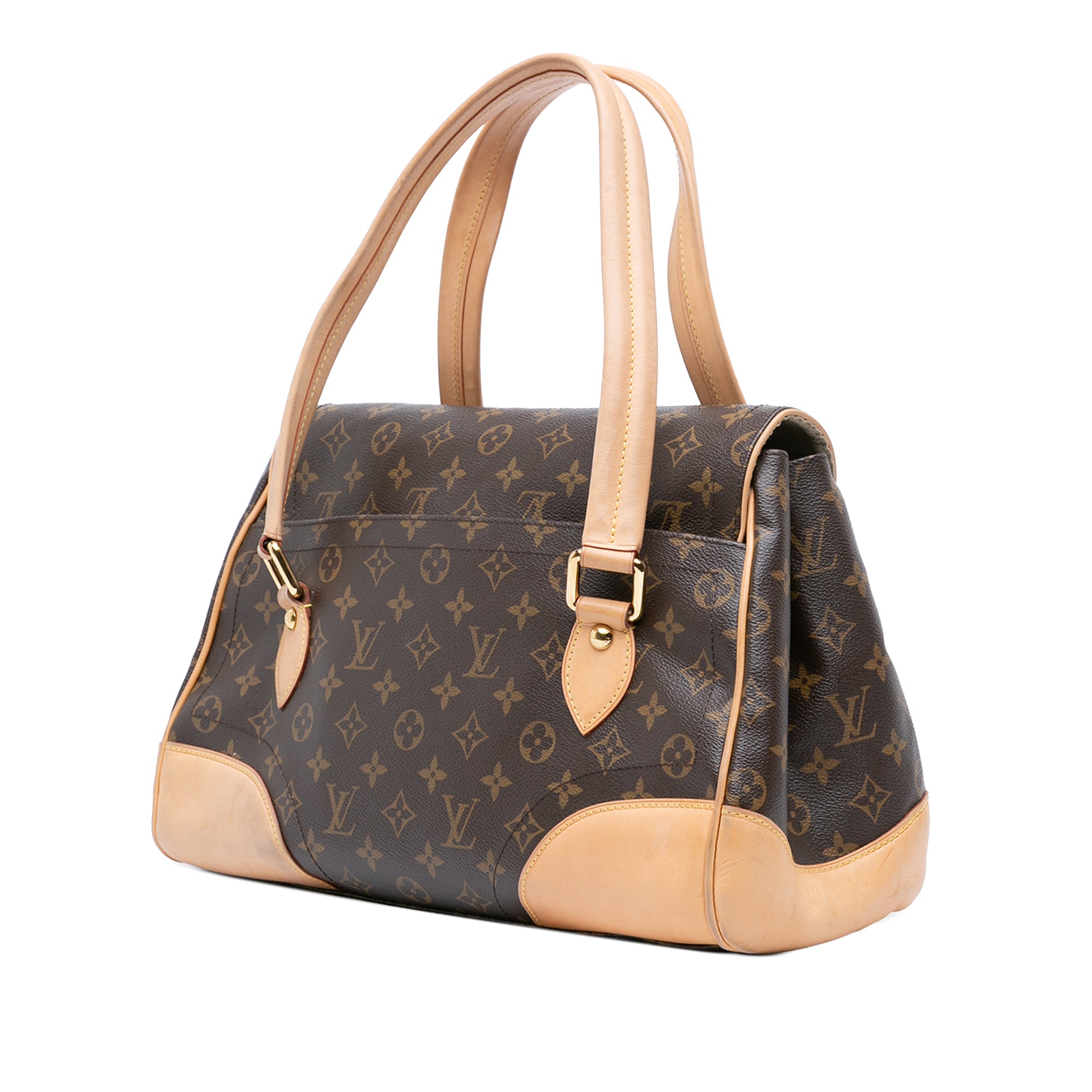 The Beverly GM features a monogram canvas body with vachetta leather trim, flat vachetta leather handles, a front flap with a push lock closure, an exterior back slip pocket, and an interior slip compartment. Retail Price: 1880.00