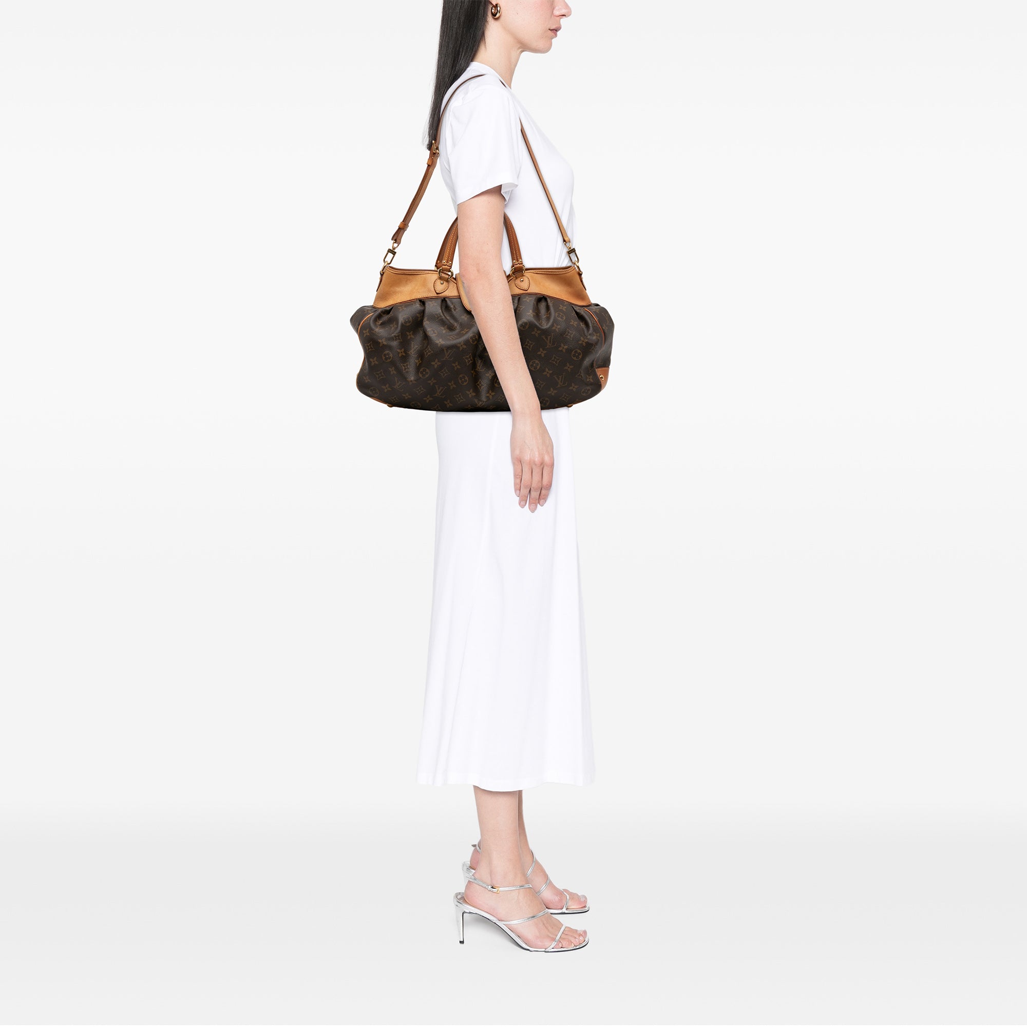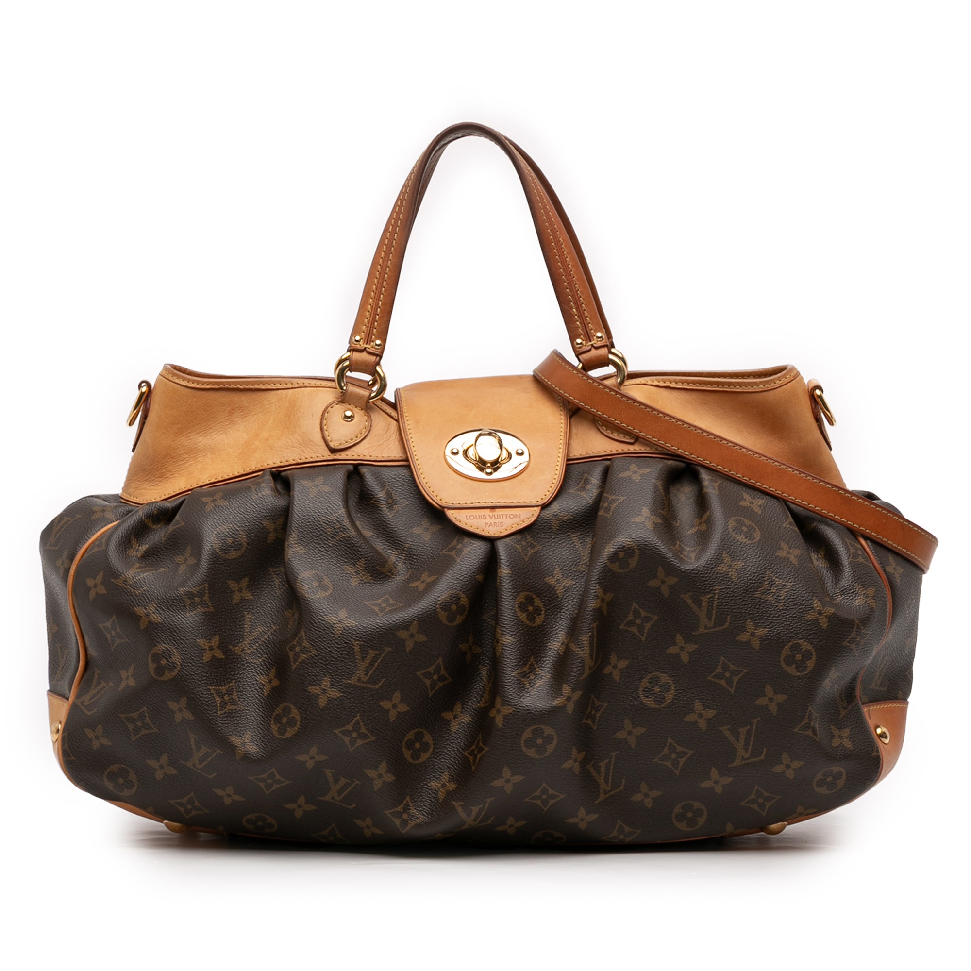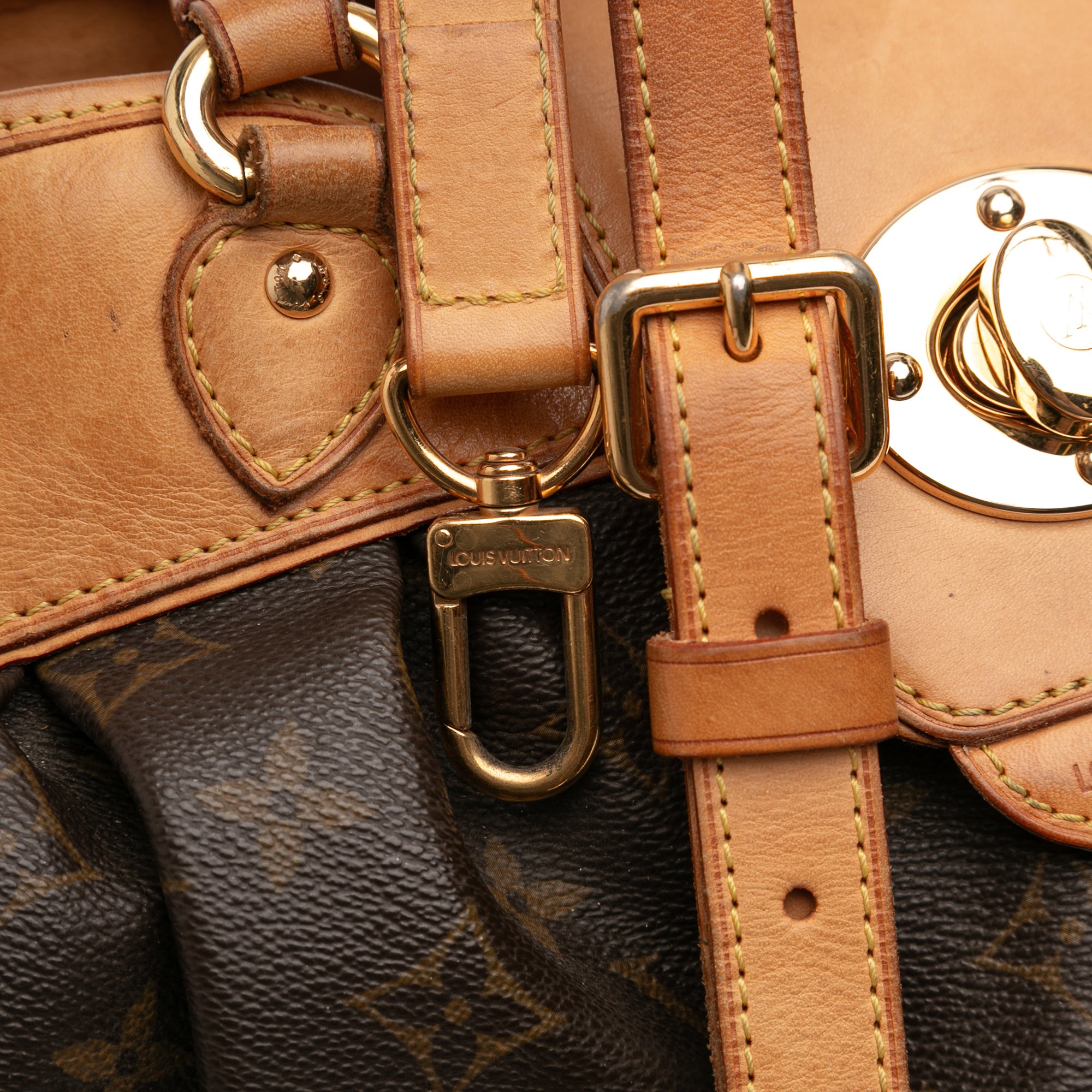 The Boetie GM features a monogram canvas body with vachetta leather trim, flat vachetta handles, a detachable flat leather strap, a front flap tab with a turn-lock closure, and interior slip pockets. Inclusion: Dust bag. Retail Price: 2100.00