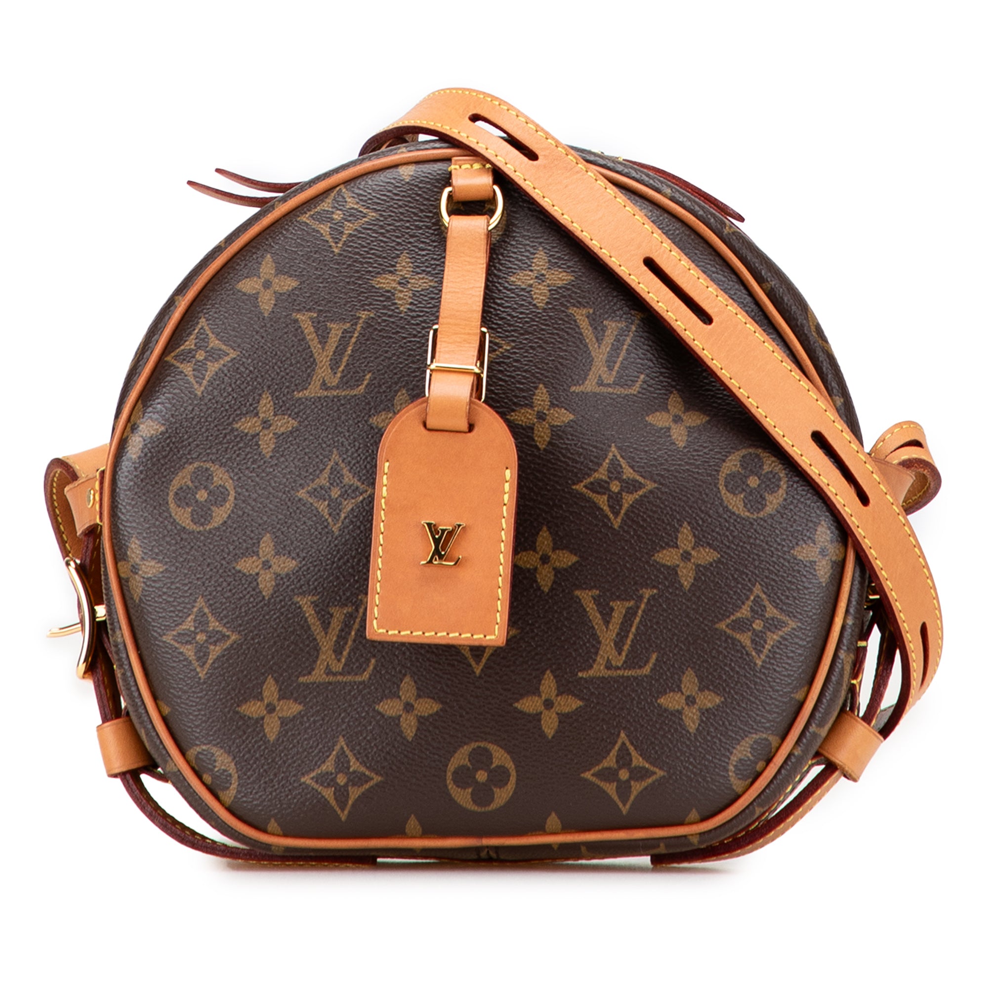 The Boite Chapeaux Souple features a monogram canvas body with vachetta leather trim, an adjustable flat leather strap, a top zip closure, an exterior slip pocket, and an interior slip pocket. Inclusion: Dust bag. Retail Price: 2940.00
