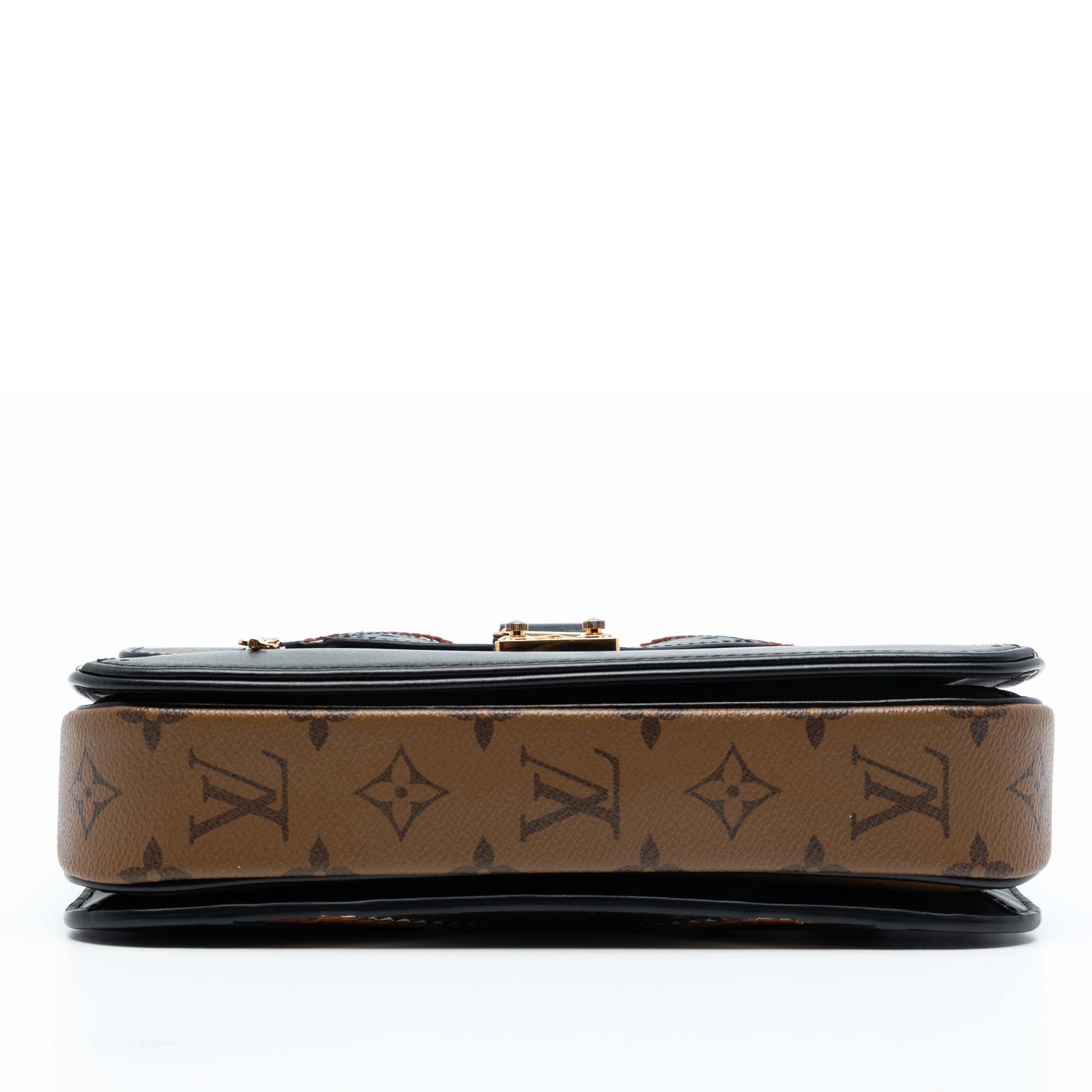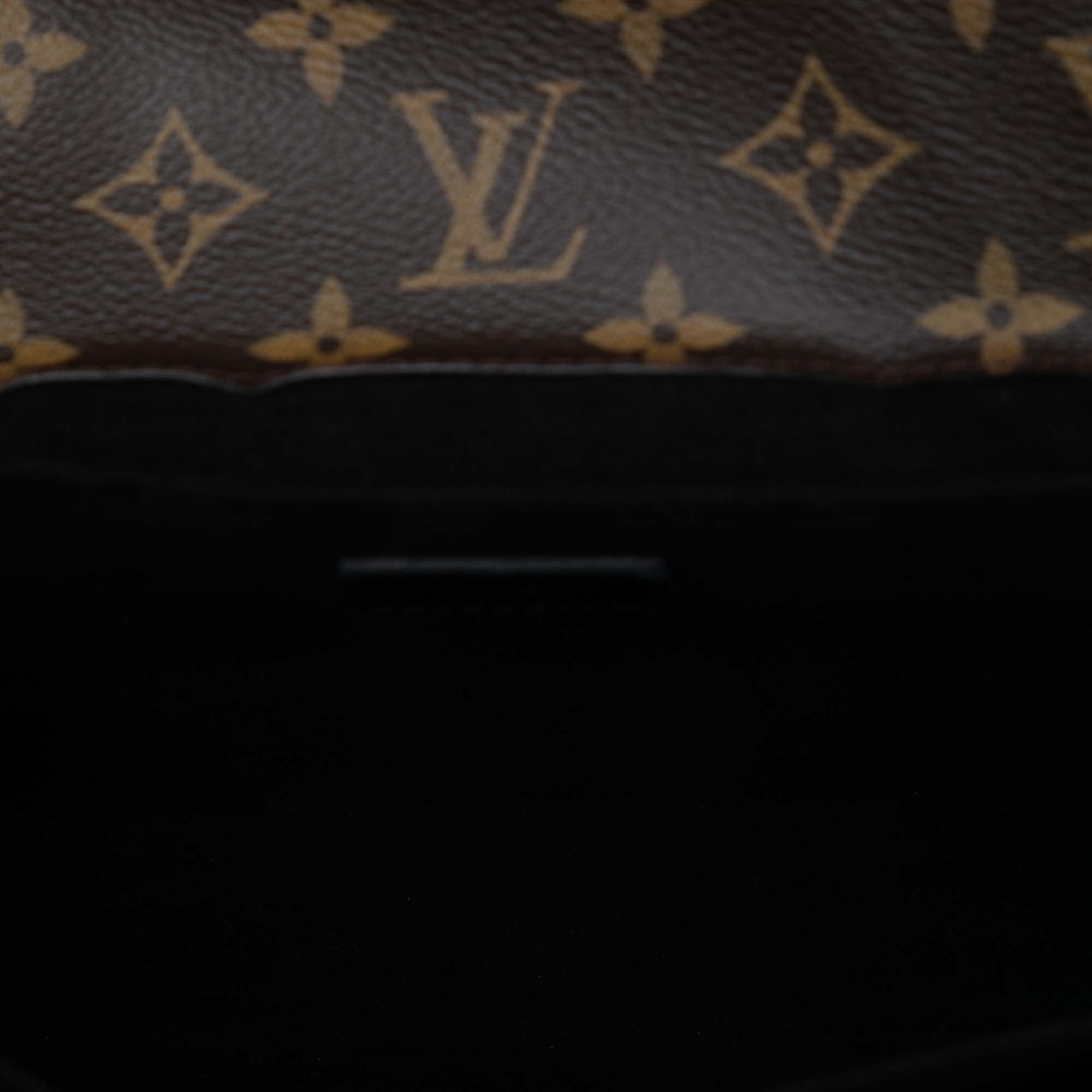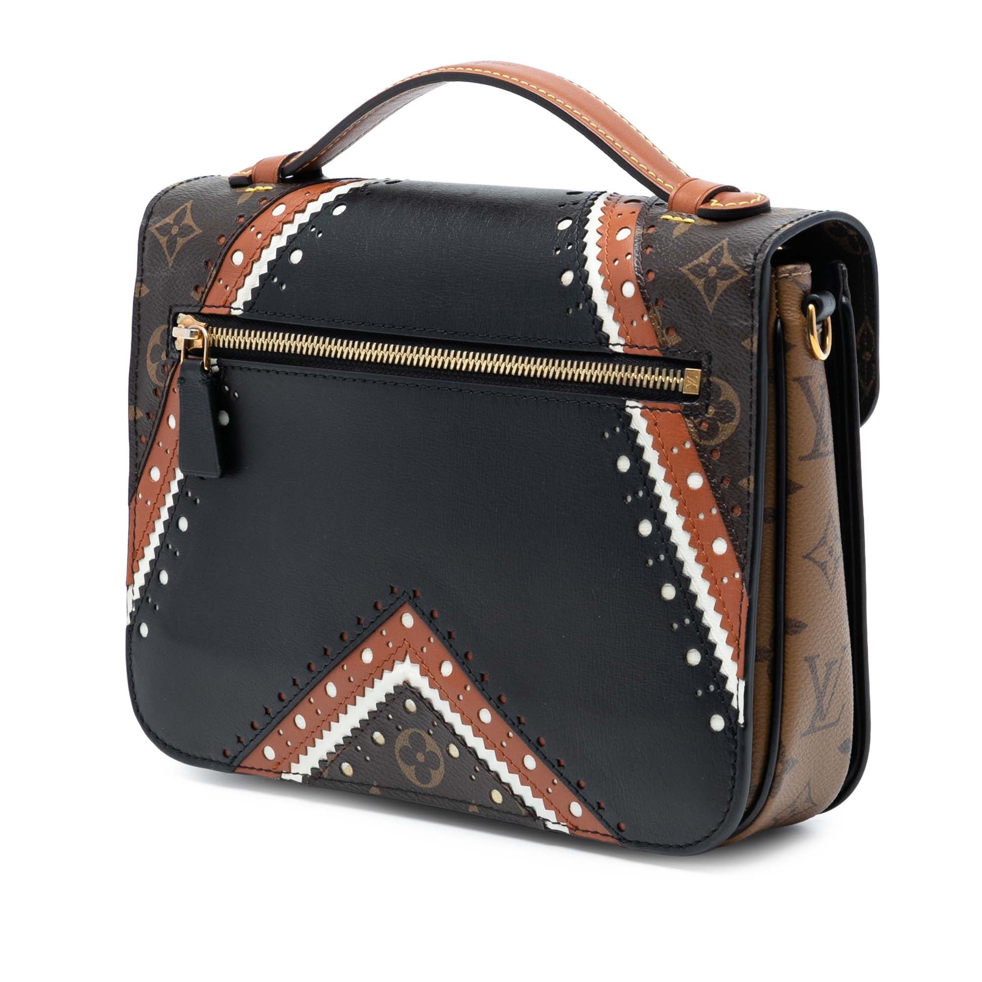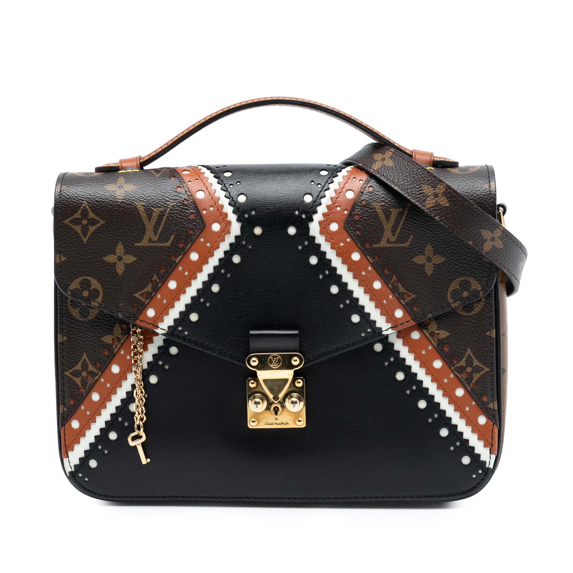 The Pochette Metis features a monogram canvas body with calf leather trim, a flat leather top handle, a detachable flat leather shoulder strap, a front flap with an S-lock closure, an exterior zip pocket, and interior slip pockets. Inclusion: Dust bag. Retail Price: 2400.00