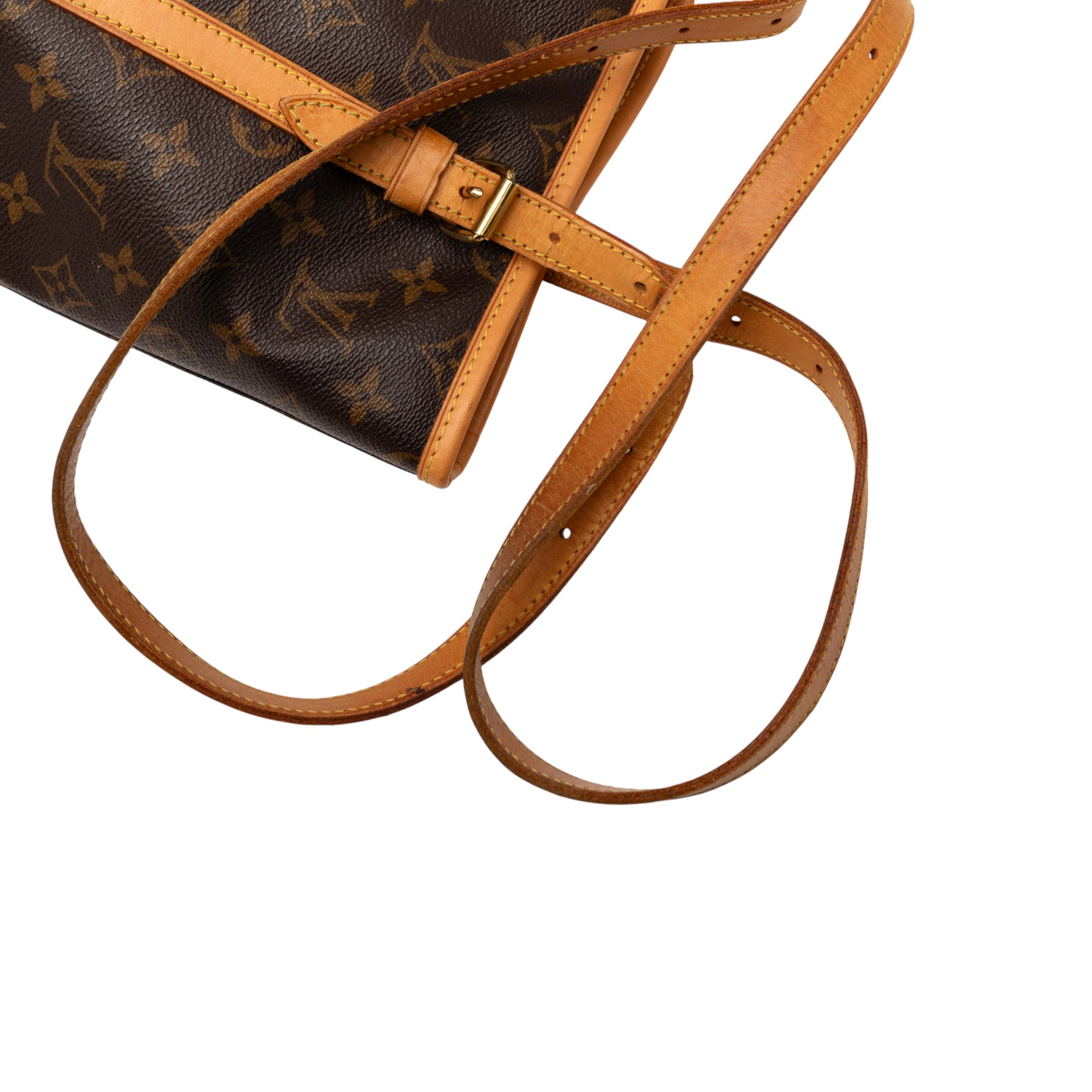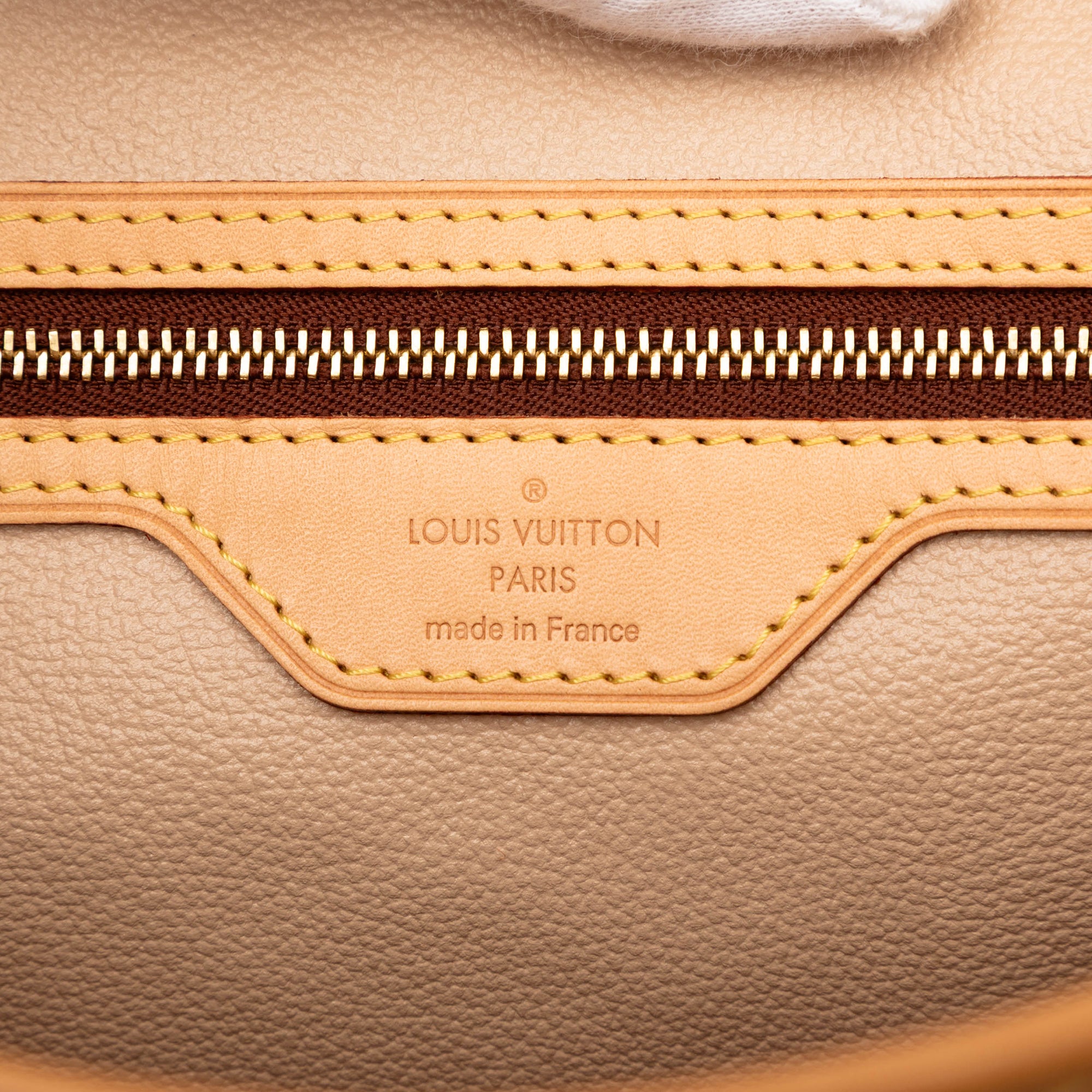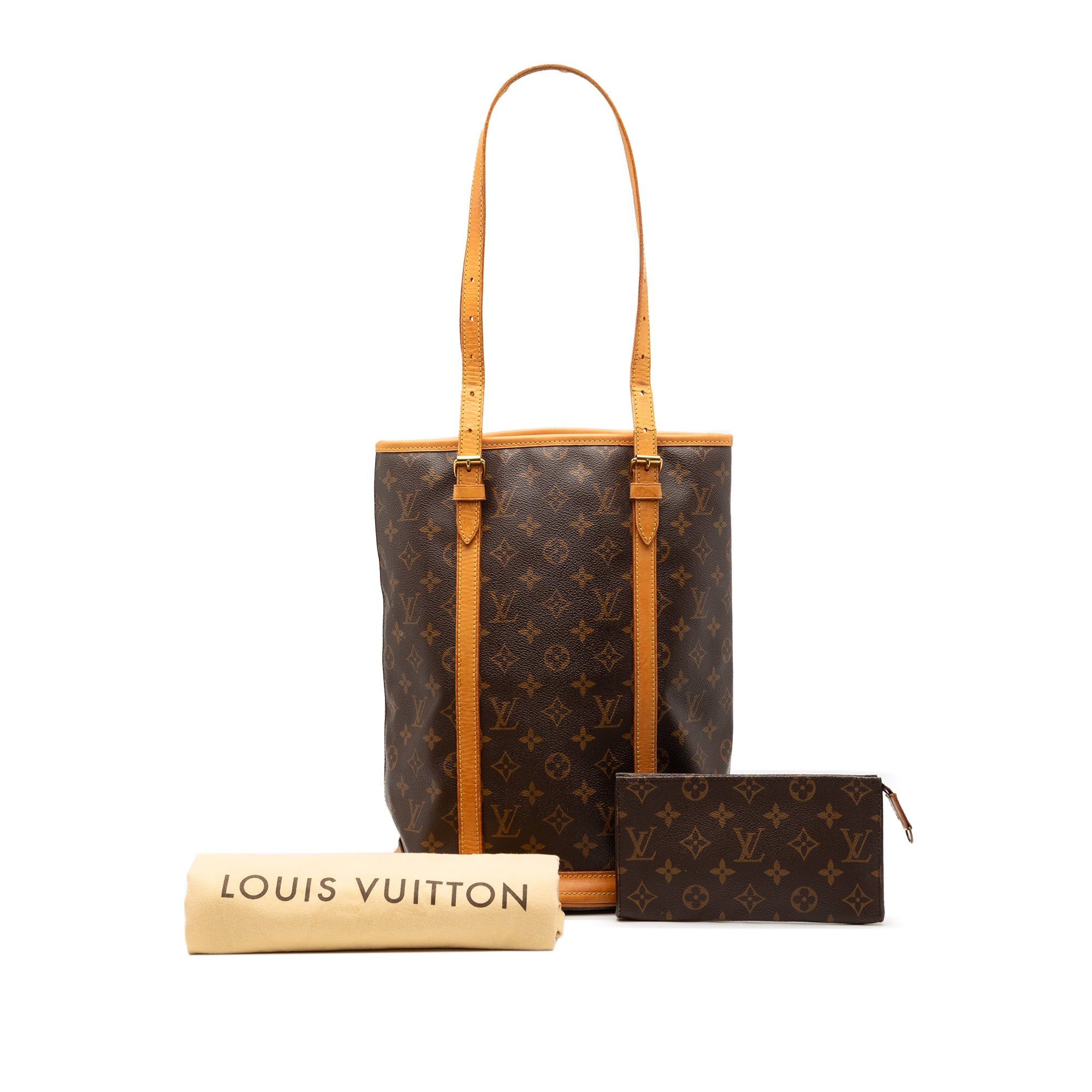 The Bucket GM features a monogram canvas body with vachetta leather trim, adjustable flat vachetta leather straps, an open top, and interior zip and slip pockets. Inclusion: Dust bag. Retail Price: 1450.00