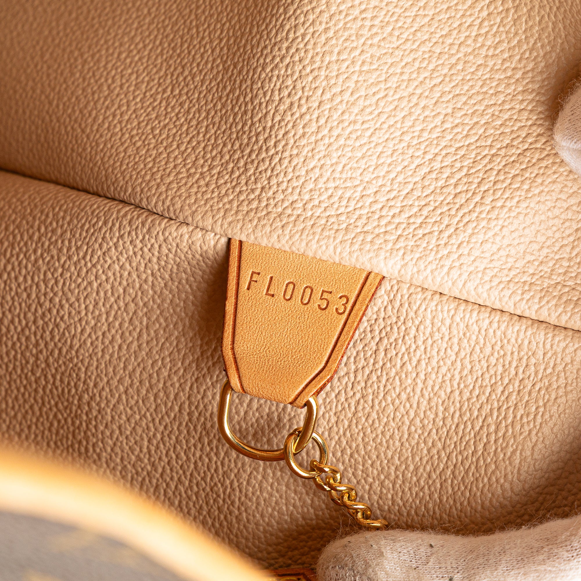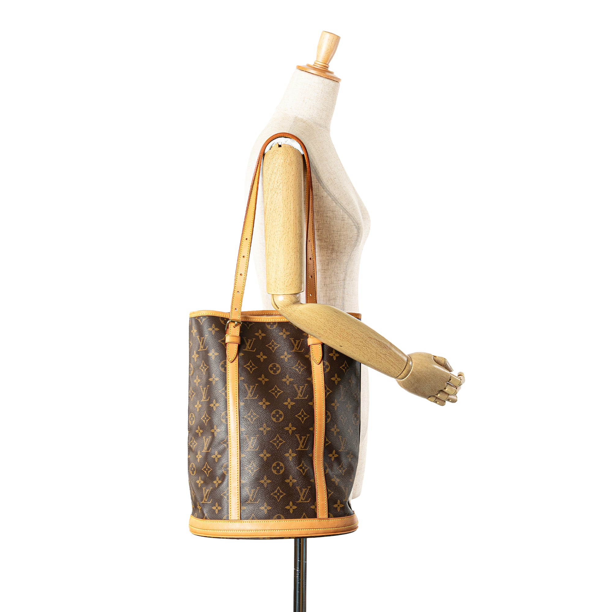 The Bucket GM features a monogram canvas body with vachetta leather trim, flat vachetta leather straps, an open top, and interior zip and slip pockets. Retail Price: 1450.00