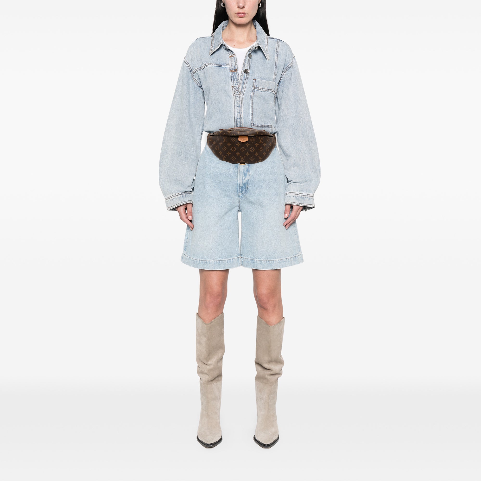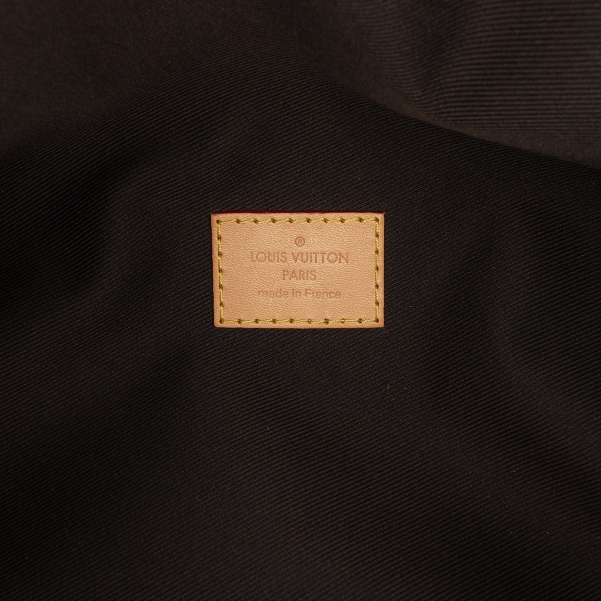 This belt bag features a monogram canvas body, a flat adjustable vachetta leather waist strap, a flat vachetta leather top handle, a front zip closure, and an exterior back zip pocket. Inclusion: Dust bag. Retail Price: 4000.00