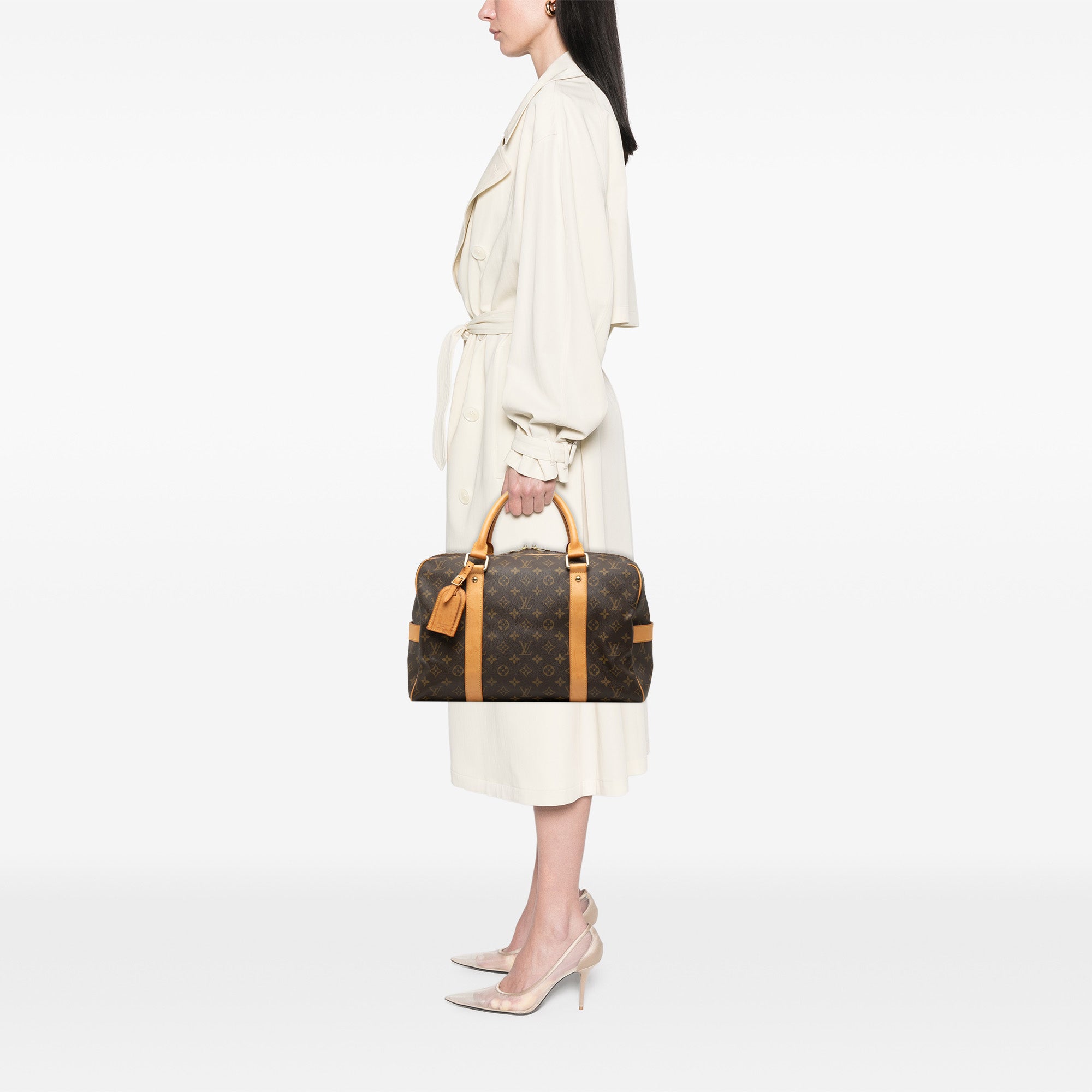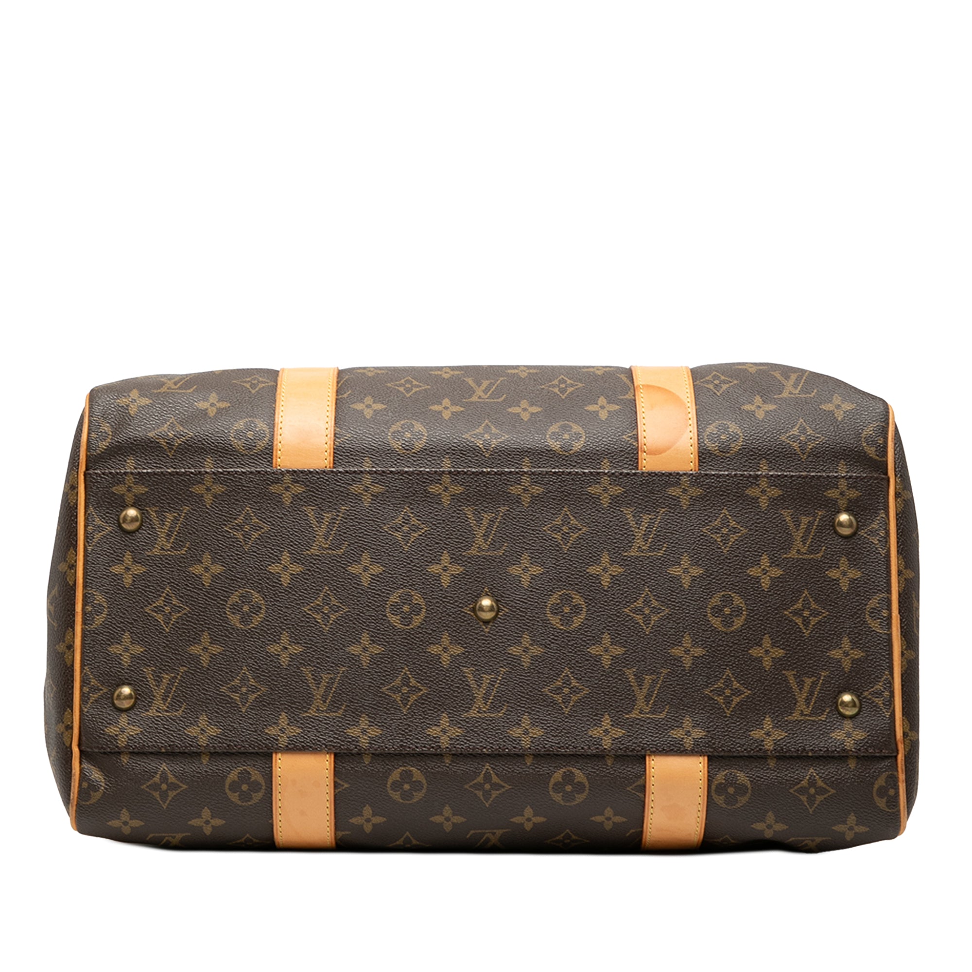 The Carryall features a monogram canvas body with vachetta leather trim, rolled vachetta leather handles, a top zip closure, and an interior slip pocket. Retail Price: 2160.00