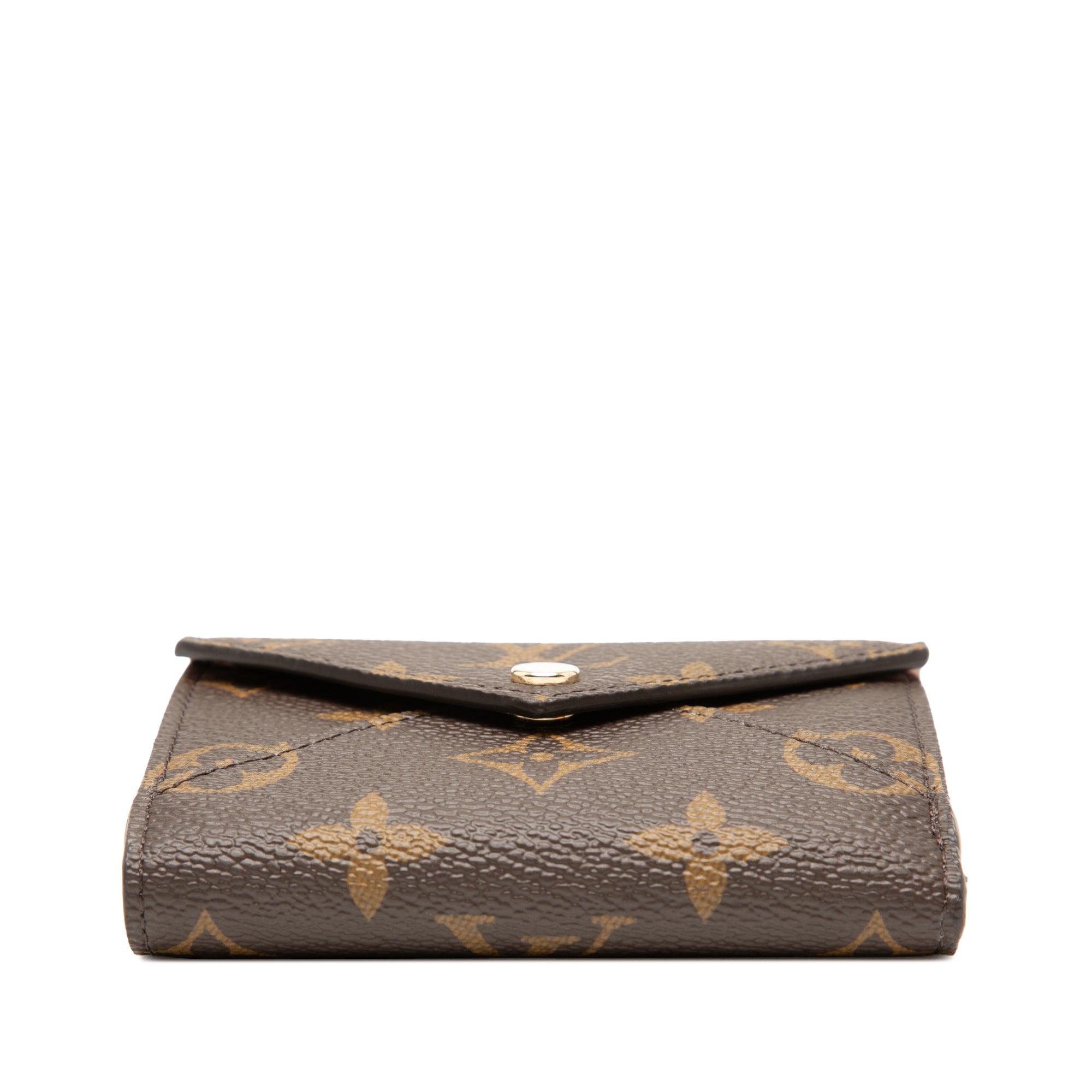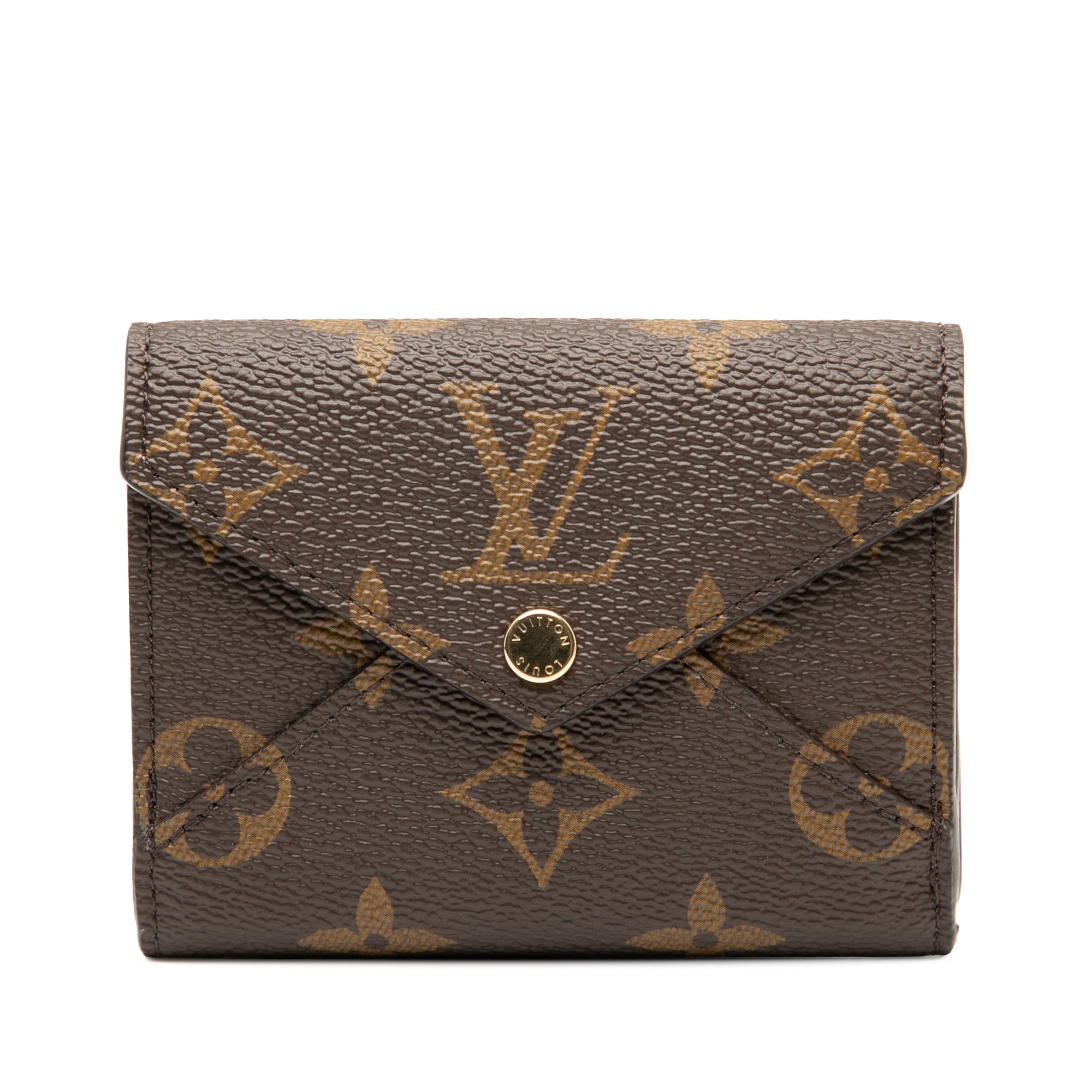 The Celeste Wallet features a monogram canvas body, a front flap with a snap button closure, an exterior back flap pocket, and interior slip pockets. Inclusion: Dust bag, box. Retail Price: 695.00