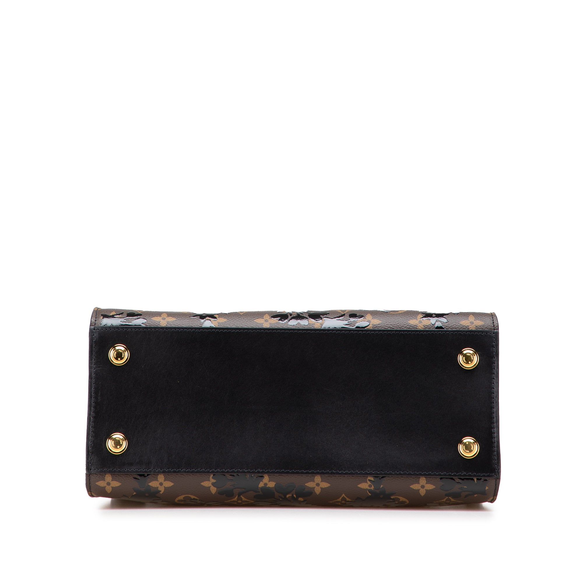 The City Steamer features a monogram canvas body with leather trim, rolled leather handles, a detachable flat leather strap, a top zip compartment, an open top with a hook closure, and interior slip pockets. Inclusion: Dust bag. Retail Price: 4350.00